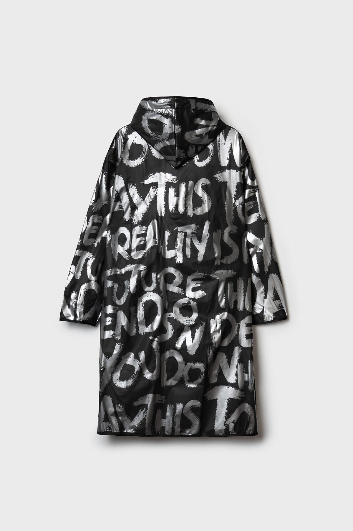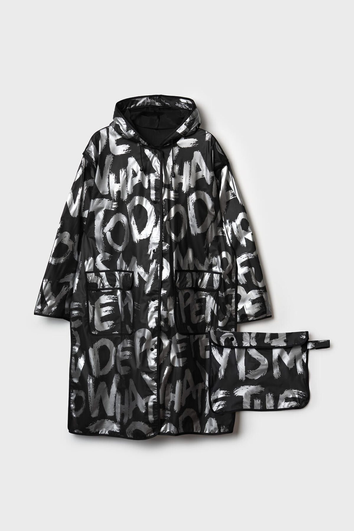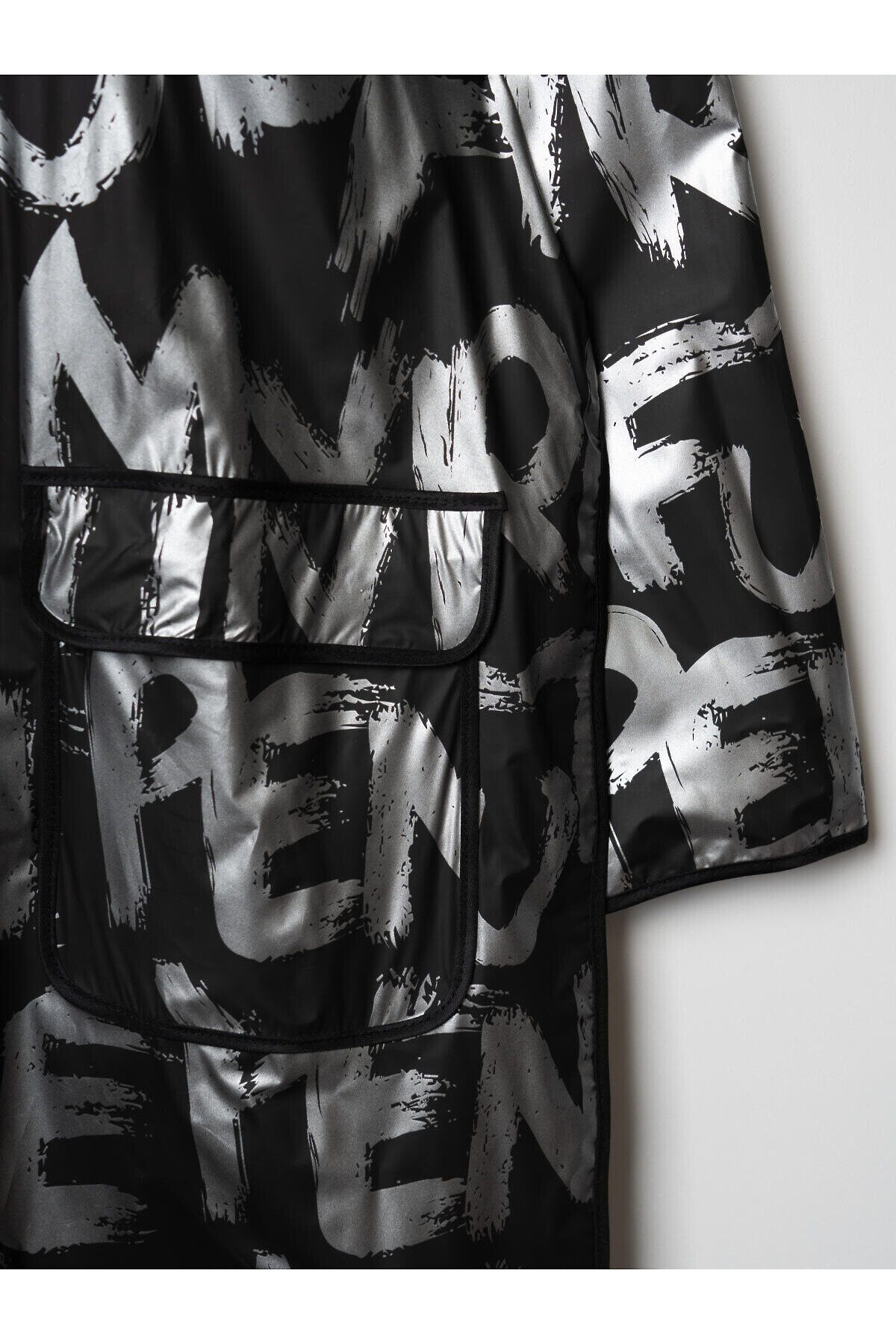 Укороченный женский плащ-дождевик с серебряным шрифтовым принтом. Капюшон с утяжкой. Застежка на кнопки. Материал ЭВА. Без подкладки. Модель имеет спереди два накладных кармана с клапаном. Добавлена петелька под капюшоном с внешней стороны, чтобы остальные вещи на вешалке не намокали. Сзади есть светоотражающая полоска. Идеально подходит для парного образа мама-дочь, так как такая модель есть в детских размерах. В комплекте идет непромокаемая сумочка.