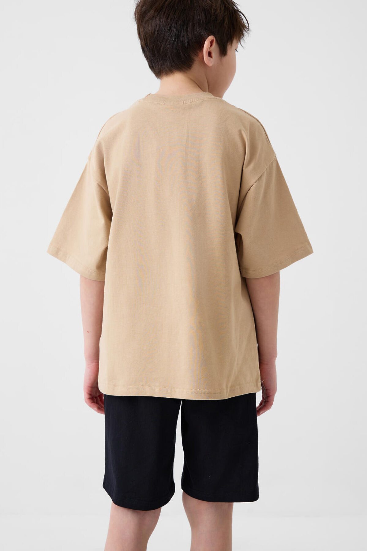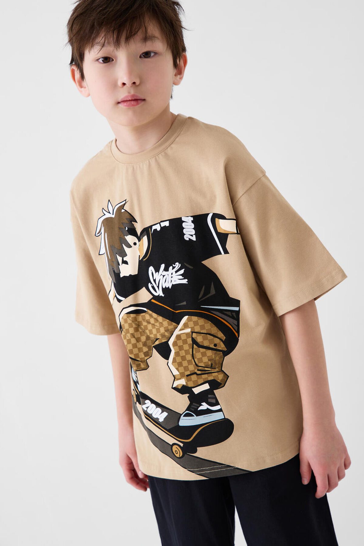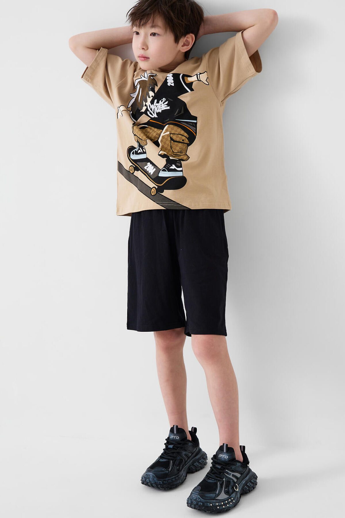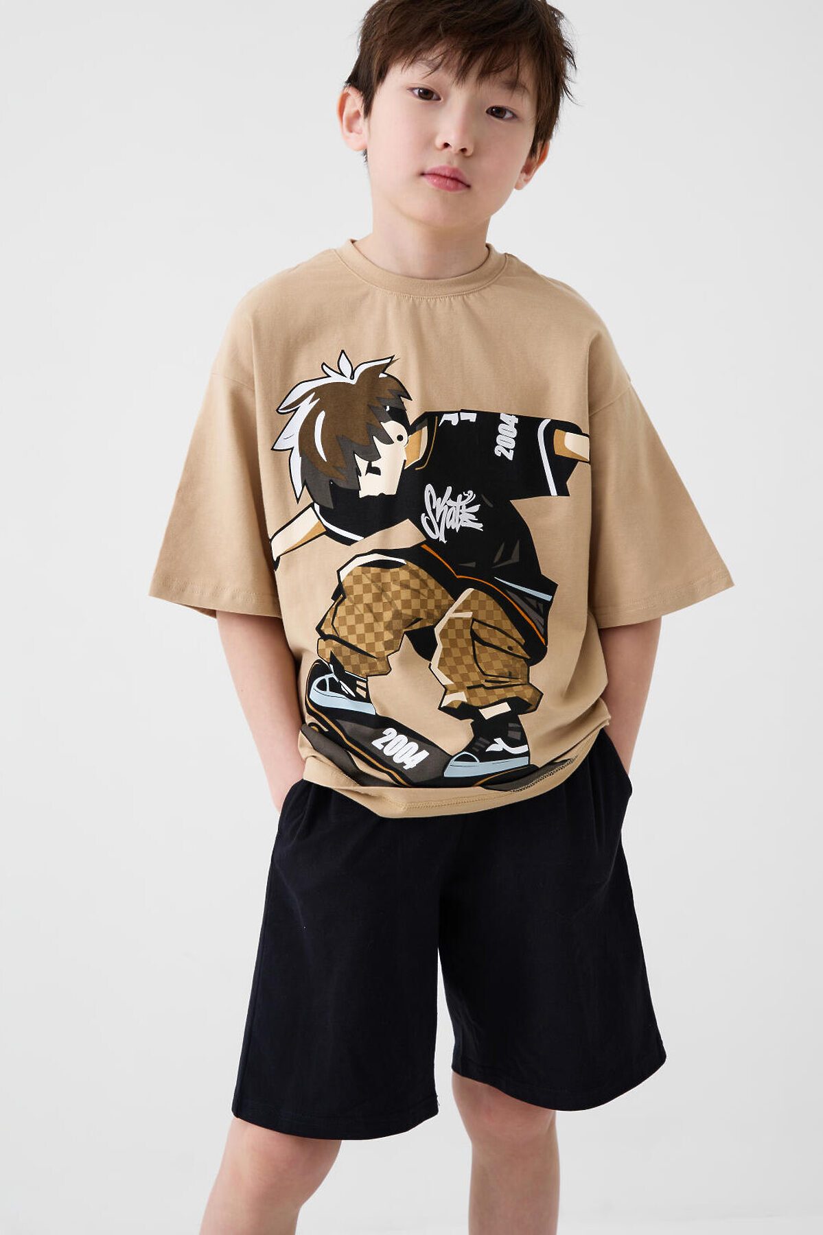 Пижама для мальчика подростка. Состоит из светло-бежевой футболки оверсайз с короткими рукавами и чёрных шорт. Материал - хлопковый трикотаж. На футболке спереди нанесён яркий принт с изображением скейтера в движении . Вырез горловины круглый, с эластичной резинкой. Шорты свободного кроя, с боковыми карманами. Пояс на резинке со шнуром.