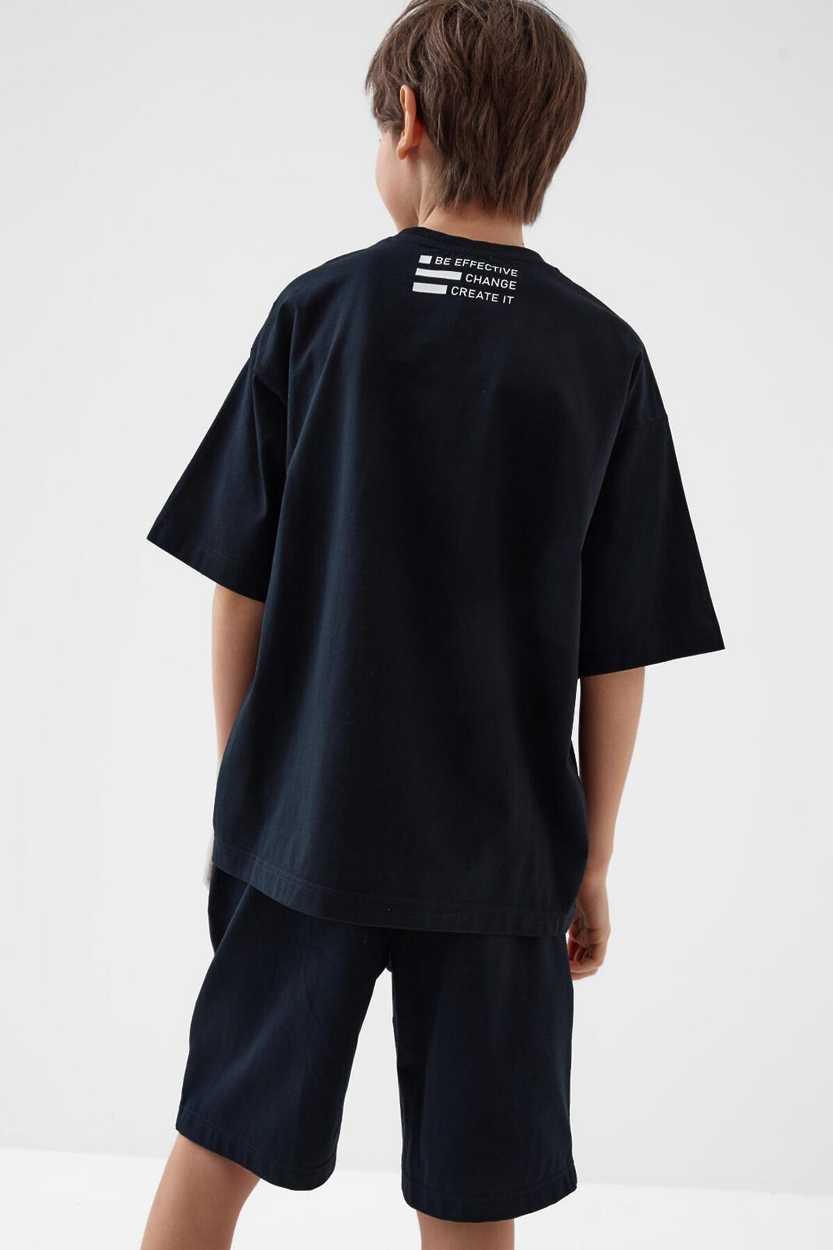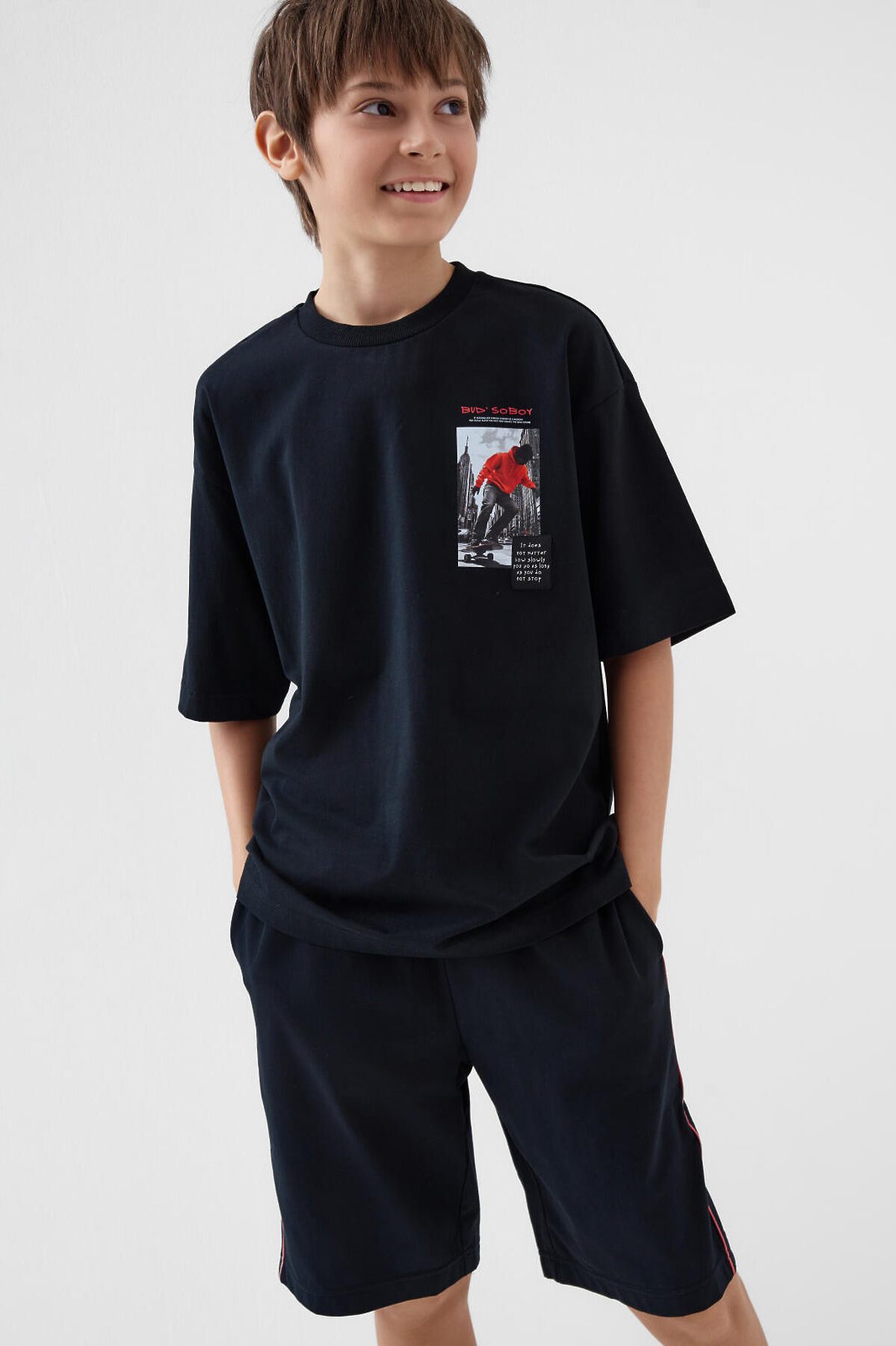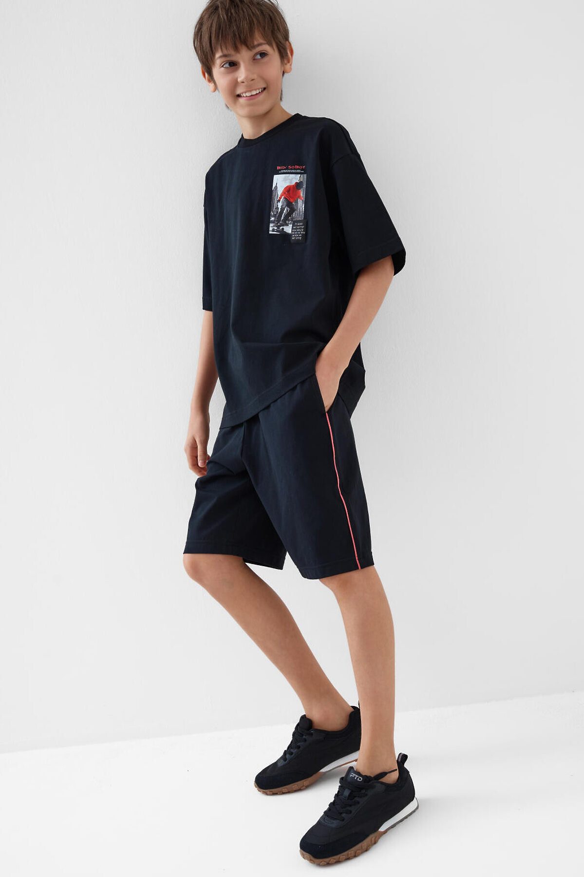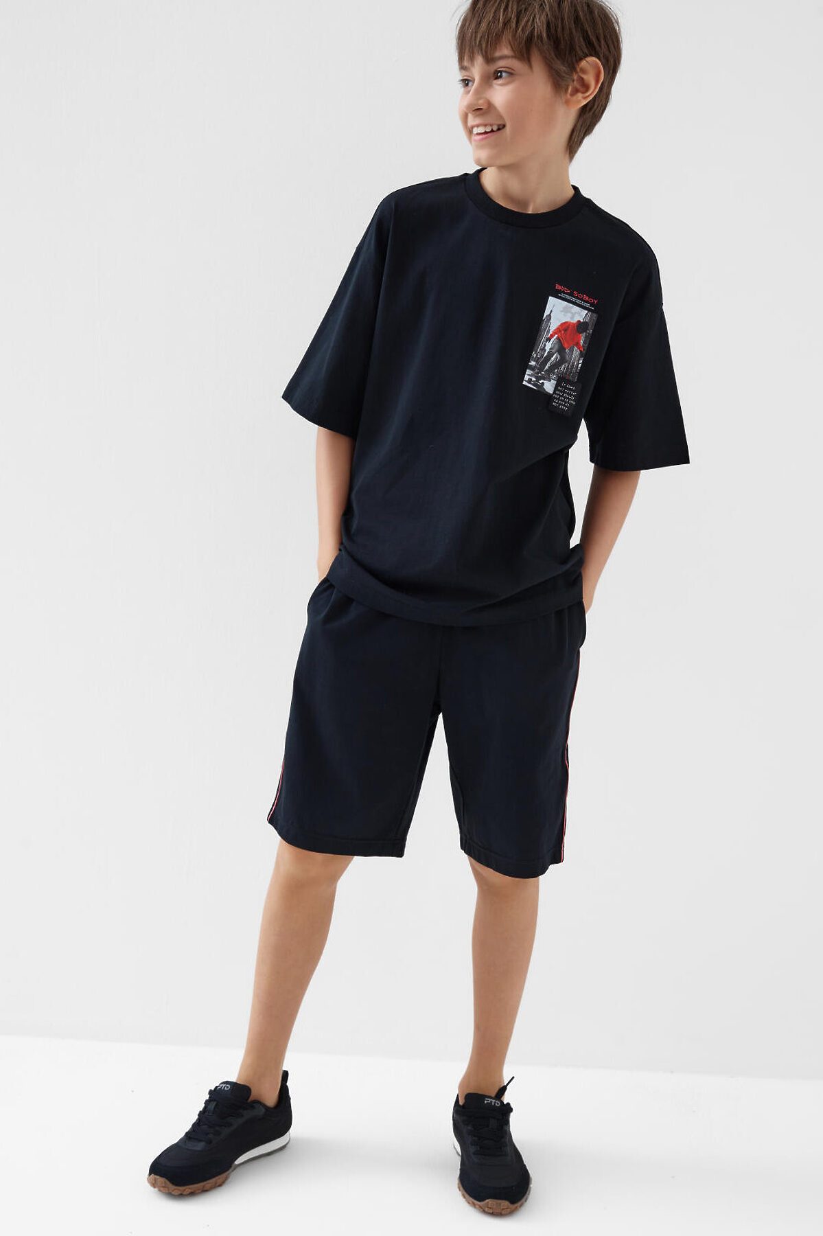 Трикотажный комплект состоит из оверсайз футболки и удлинённых шорт для мальчика подростка. Футболка свободного кроя с принтом. Шорты на резинке со шнурком. Боковые карманы. Контрастные лампасы по бокам придают изделию спортивный стиль. Комплект выполнен из мягкого трикотажа джерси с высоким содержание хлопка, подходит для активного отдыха и повседневной носки.