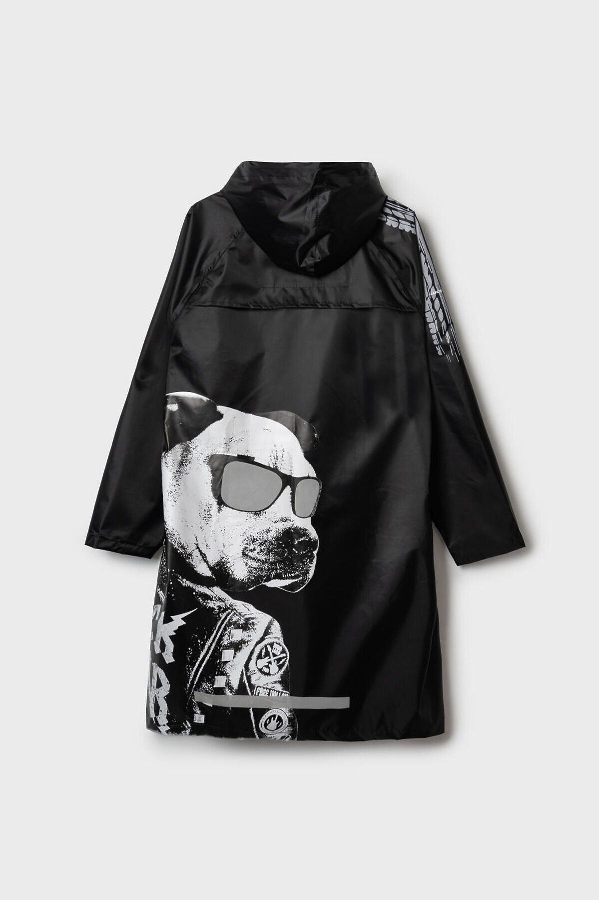Трендовый дождевик с оригинальным принтом бульдогом для мальчика-подростка. Очки на бульдоге имеют светоотражающий эффект. Плащ выполнен из полиэстера с водоотталкивающим покрытием. Внутри все швы дополнительно проклеены изолирующей тесьмой. Застежка на кнопки. Капюшон на утяжке. Модель имеет спереди два накладных кармана с клапаном. Чтобы в плаще не было жарко, кокетка спинки имеет воздухоотводящие отверстия под клапаном. Сзади есть светоотражающая полоска. Модель идеально сочетается с резиновыми сапогами и зонтом из коллекции. Идеально подходит для парного образа папа-сын, так как такая модель есть в размерах для взрослых. В комплекте идет непромокаемый мешочек.