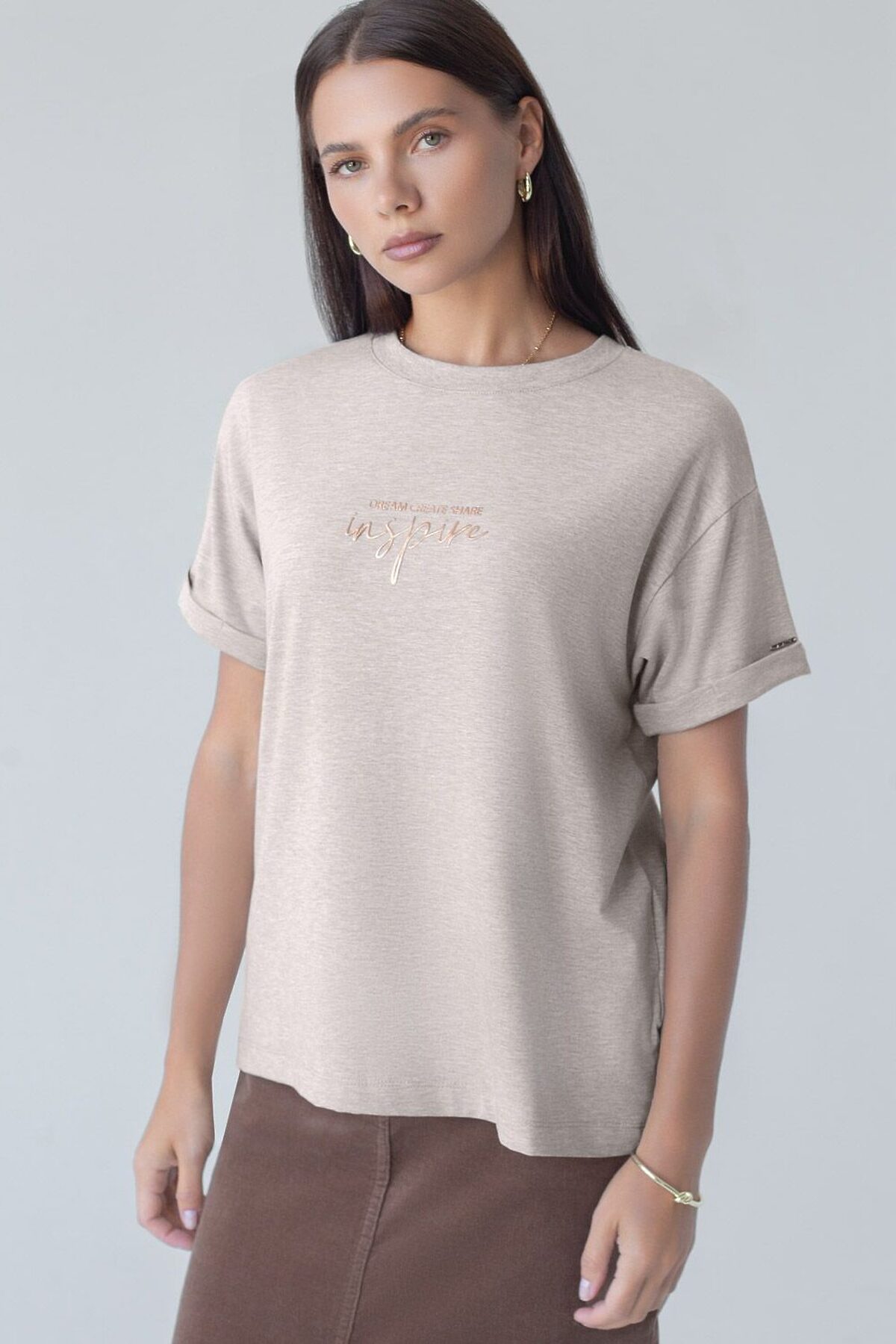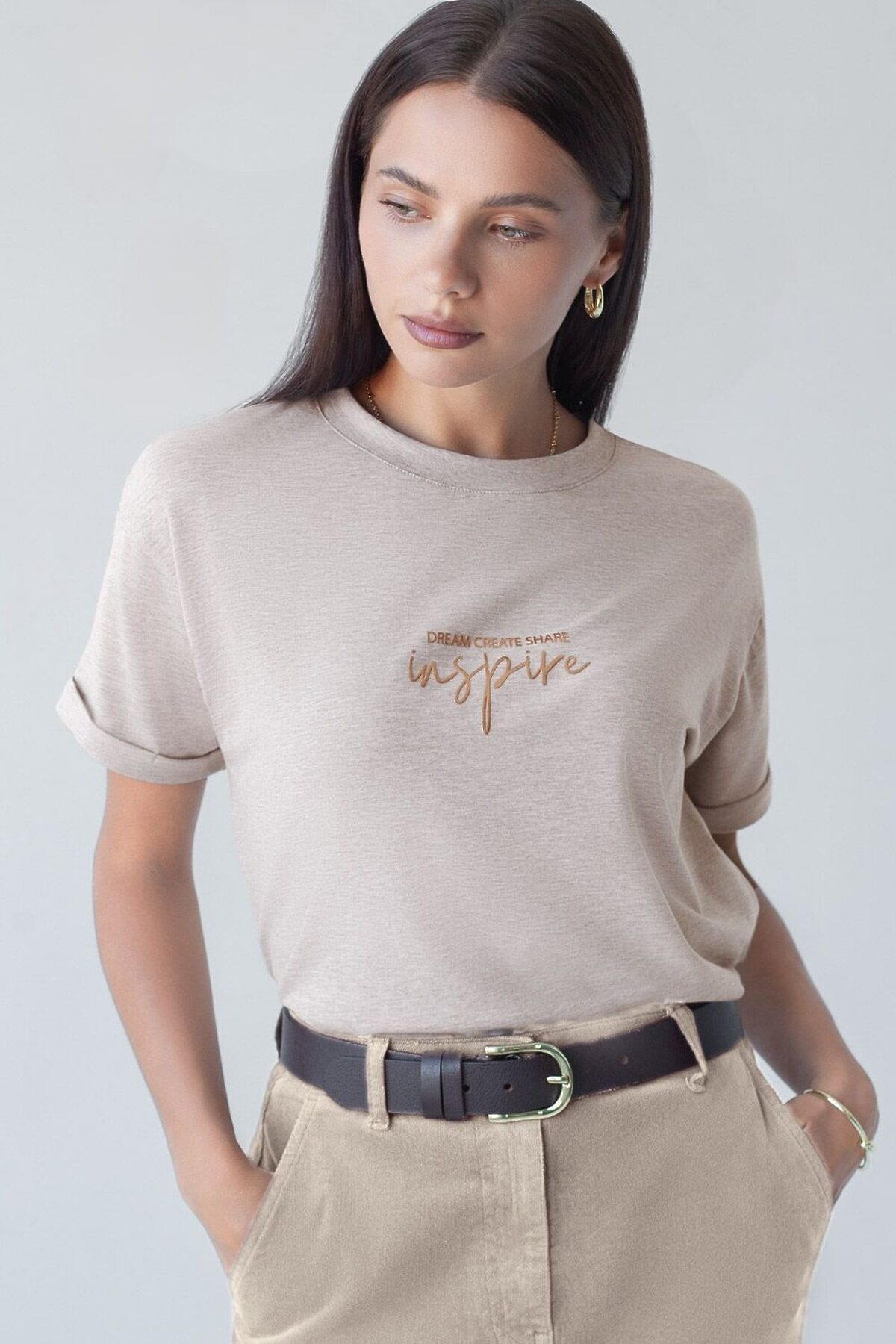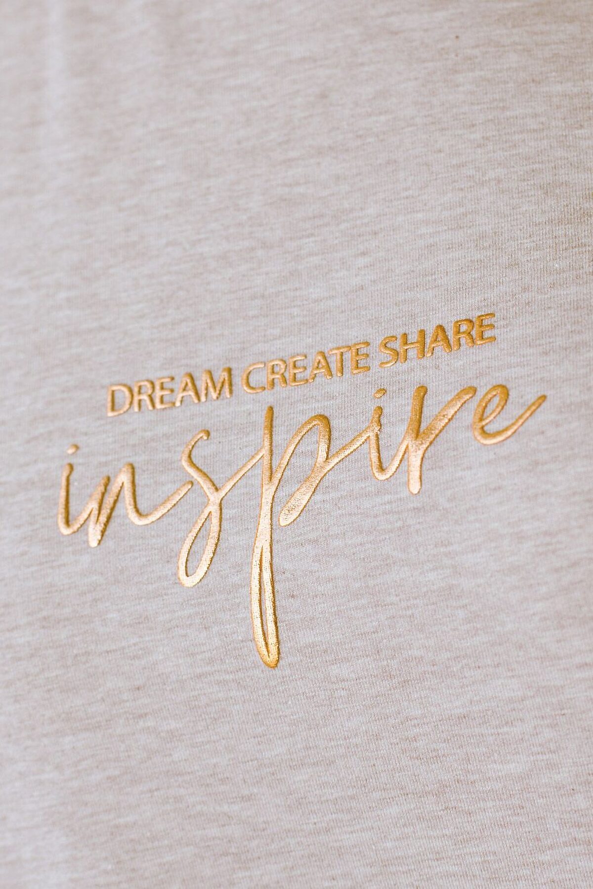 Перевод принта: Dream, create, share, inspire — мечтай, создавай, делись, вдохновляй. Футболка из премиального хлопка, высокое качество хлопковых волокон обеспечивает комфорт в любое время года. Горловина выполнена из рибаны в тон изделия, Рукава с подворотами и золотистым логотипом бренда. Авторский принт нанесен фактурными красками с устойчивым покрытием. За счет эластана в составе идеально держит форму и сохраняет внешний вид в течение долговременного использования. Универсальная вещь для ваших стилистических решений.