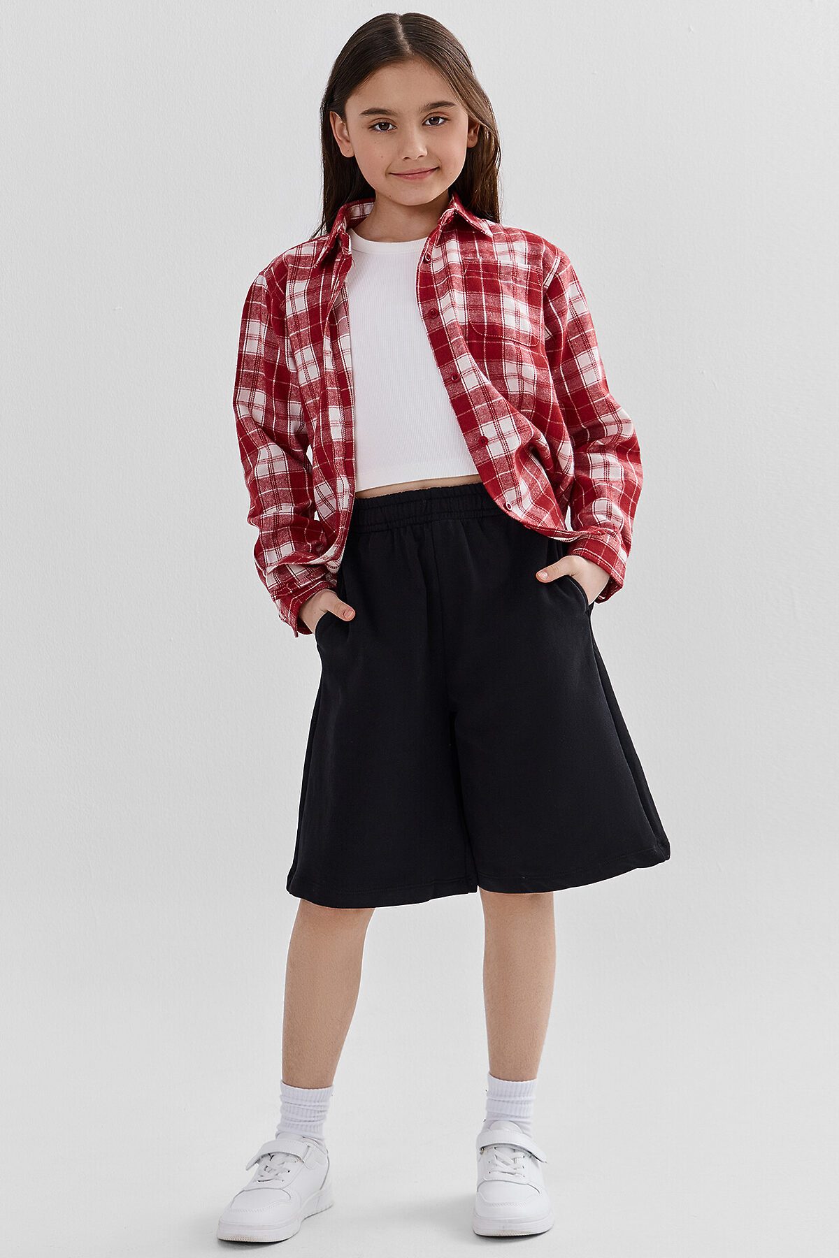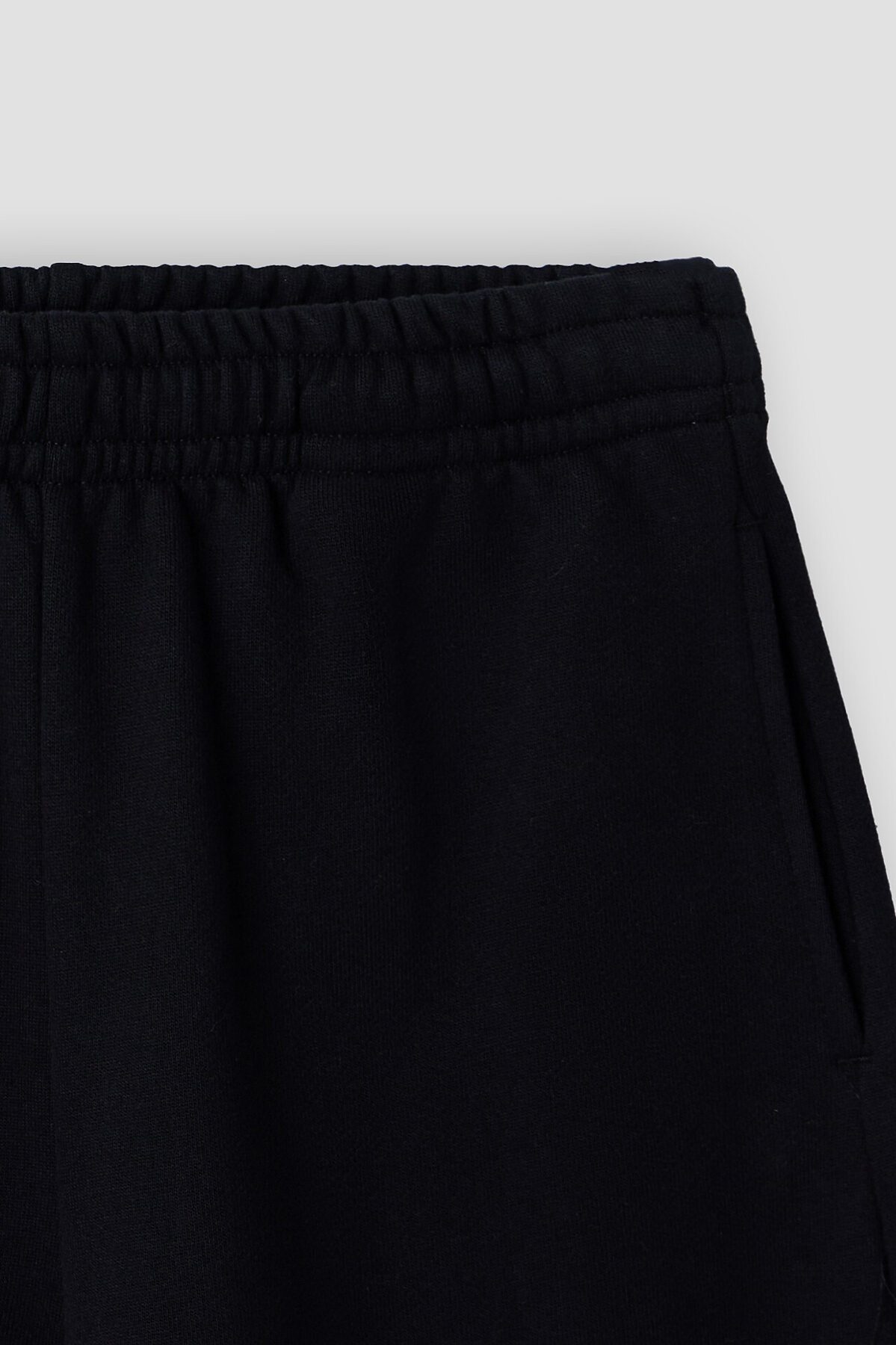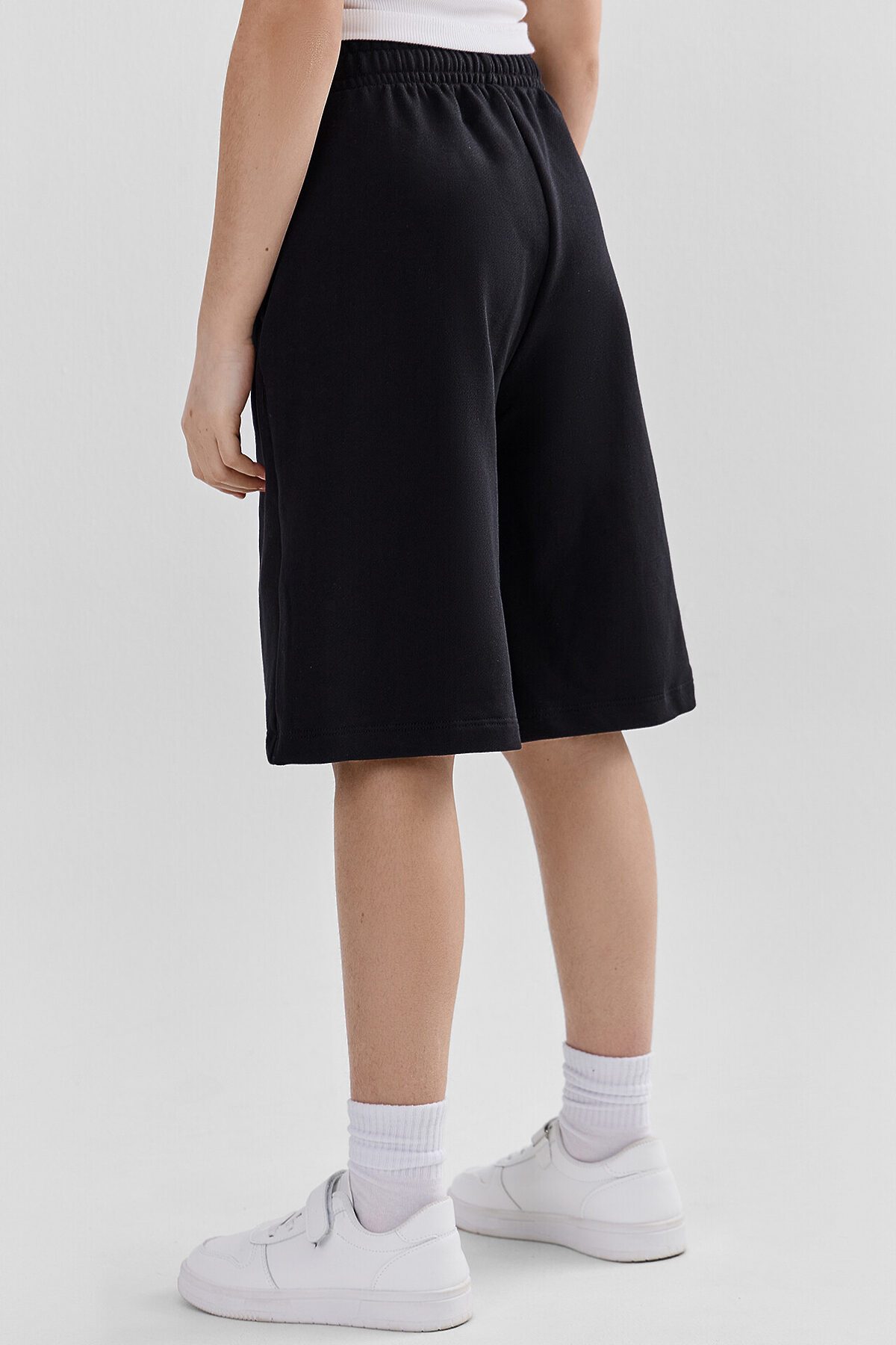 Шорты свободного силуэта. Длина ниже колено. На передних половинках обработаны карманы в швах .Пояс цельнокроенный с эластичной тесьмой внутри шириной 40RV. С внутренней стороны пробиты петли и вставлен шнур 8NMKXWC-1 шнур с наконечником. Пояс распошит. Низ изделия в подгибку