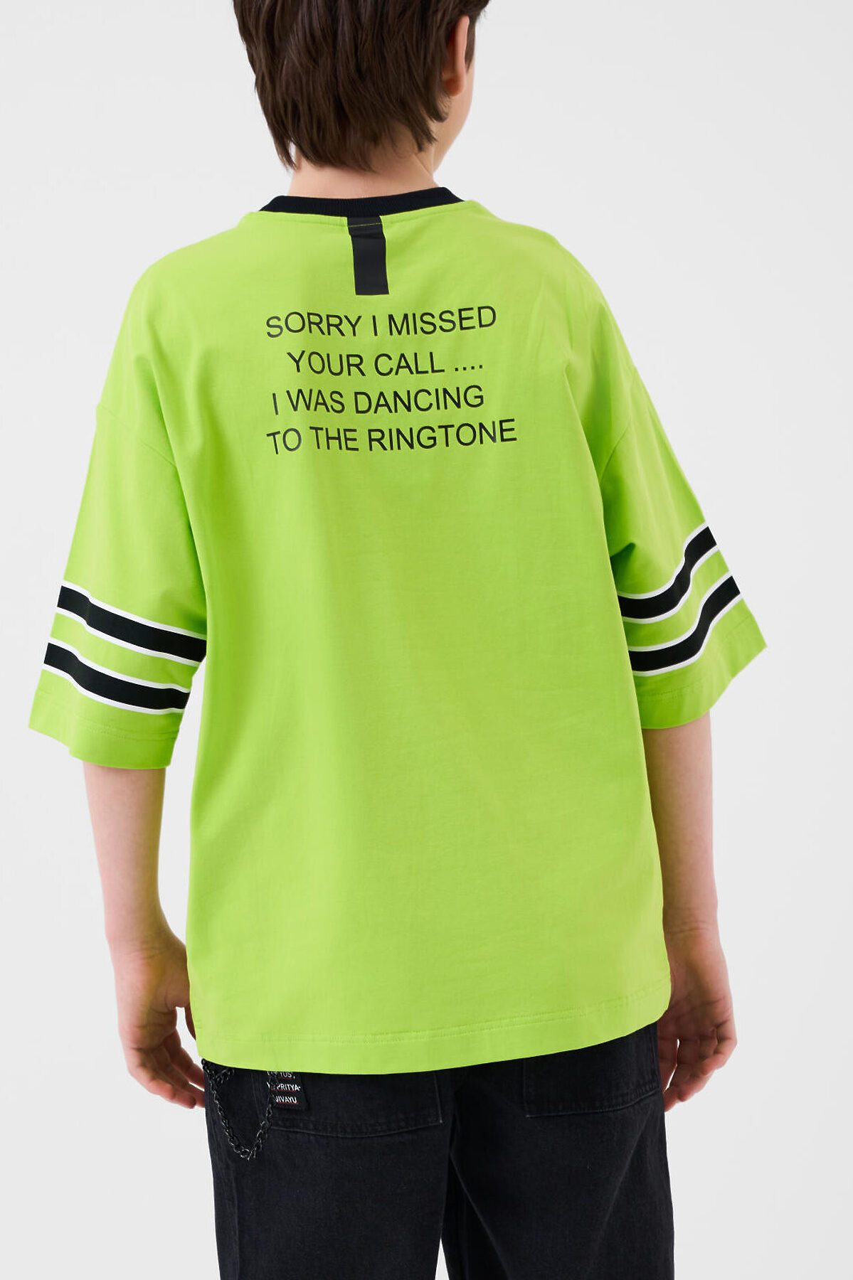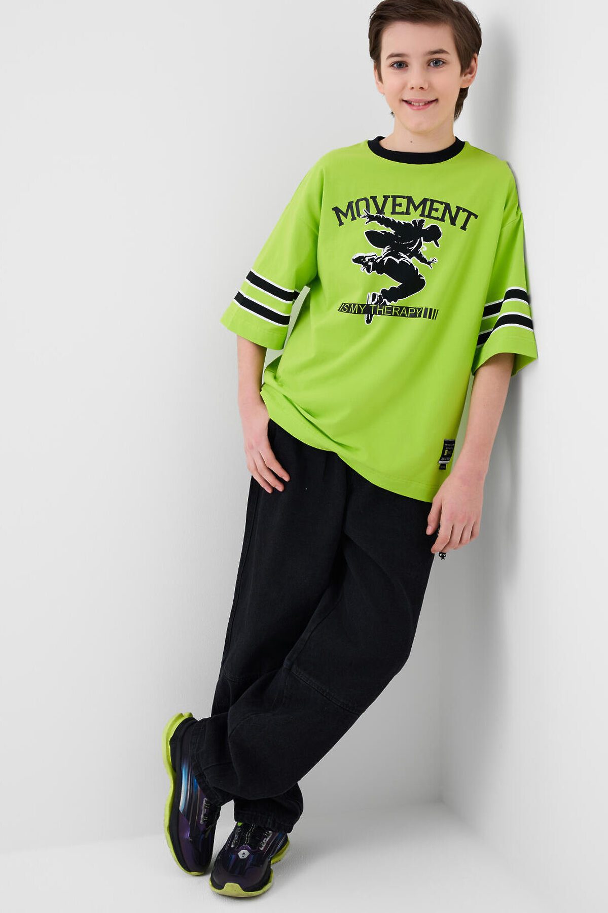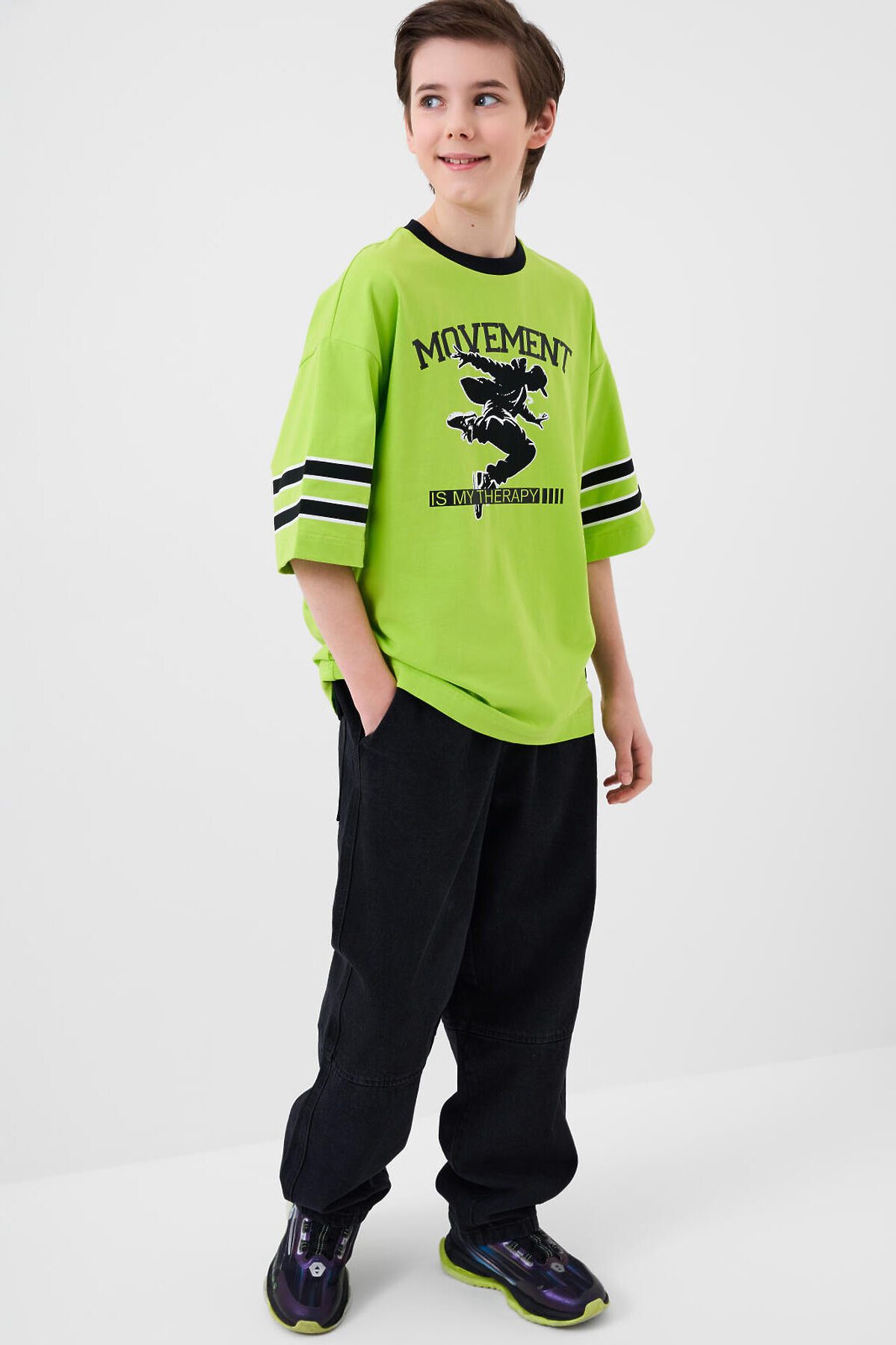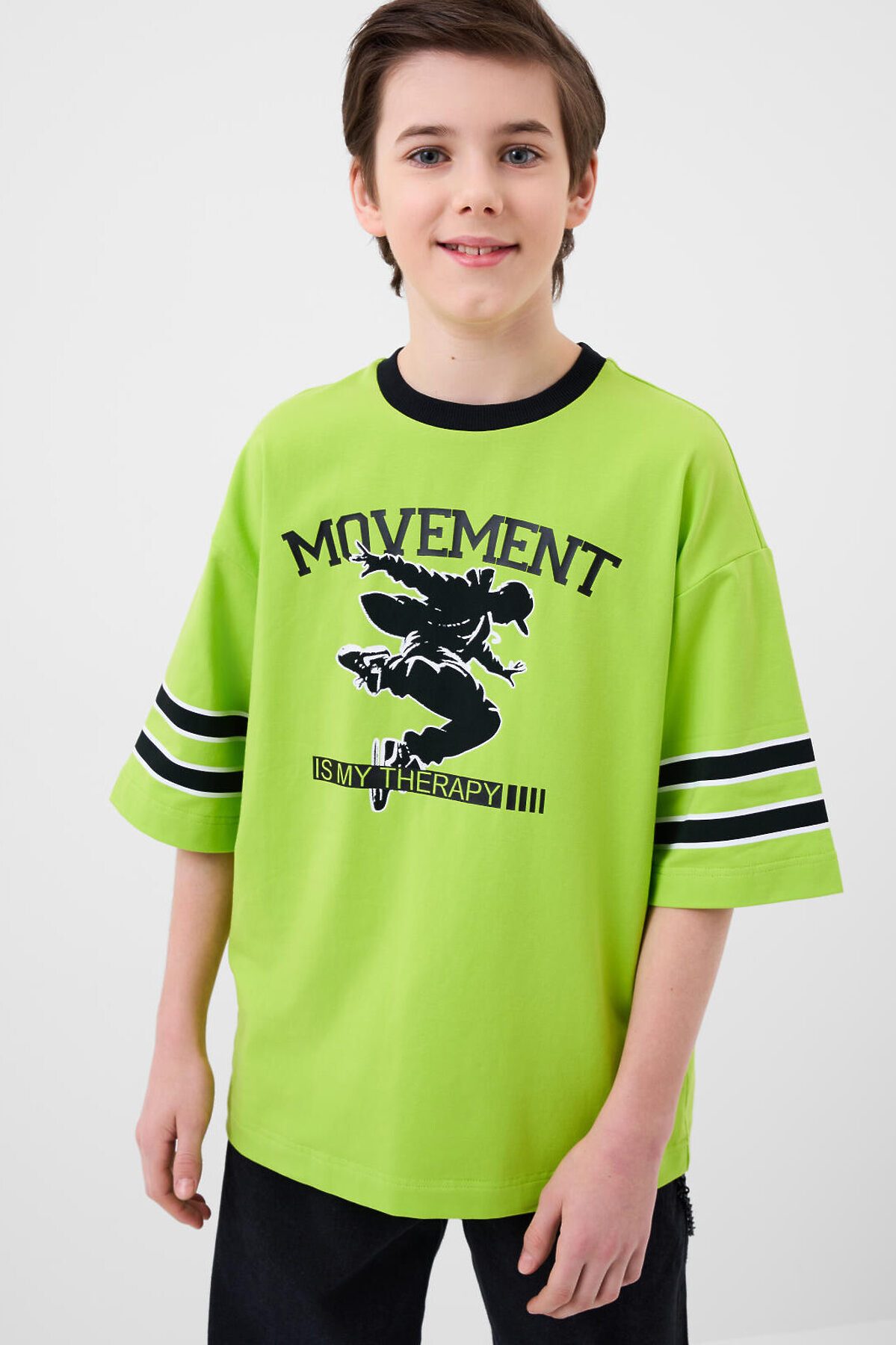 Футболка оверсайз для мальчика подростка. Модель выполнена из эластичного хлопкового трикотажа джерси. Спереди и на спинке расположен крупный принт. Горловина круглая, обработана эластичным рибом. В нижней части — небольшая нашивка.