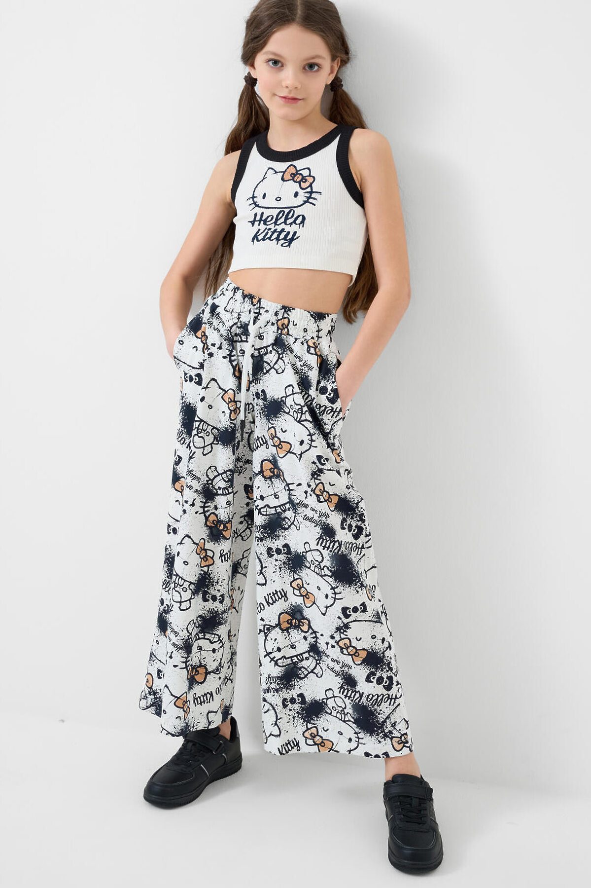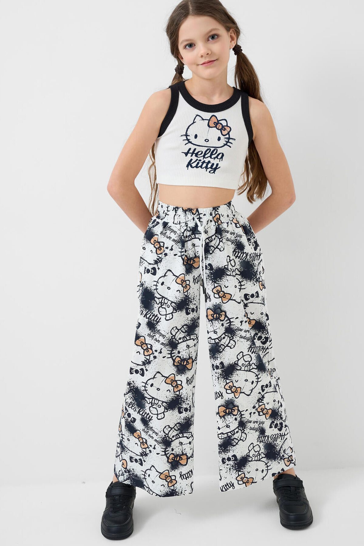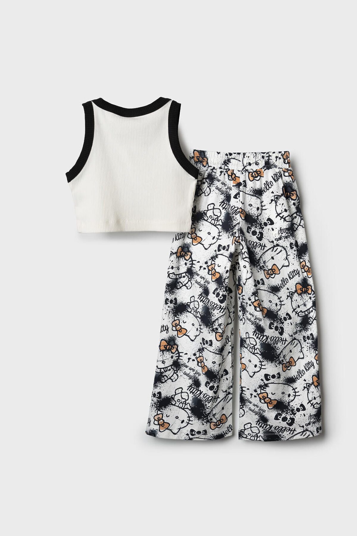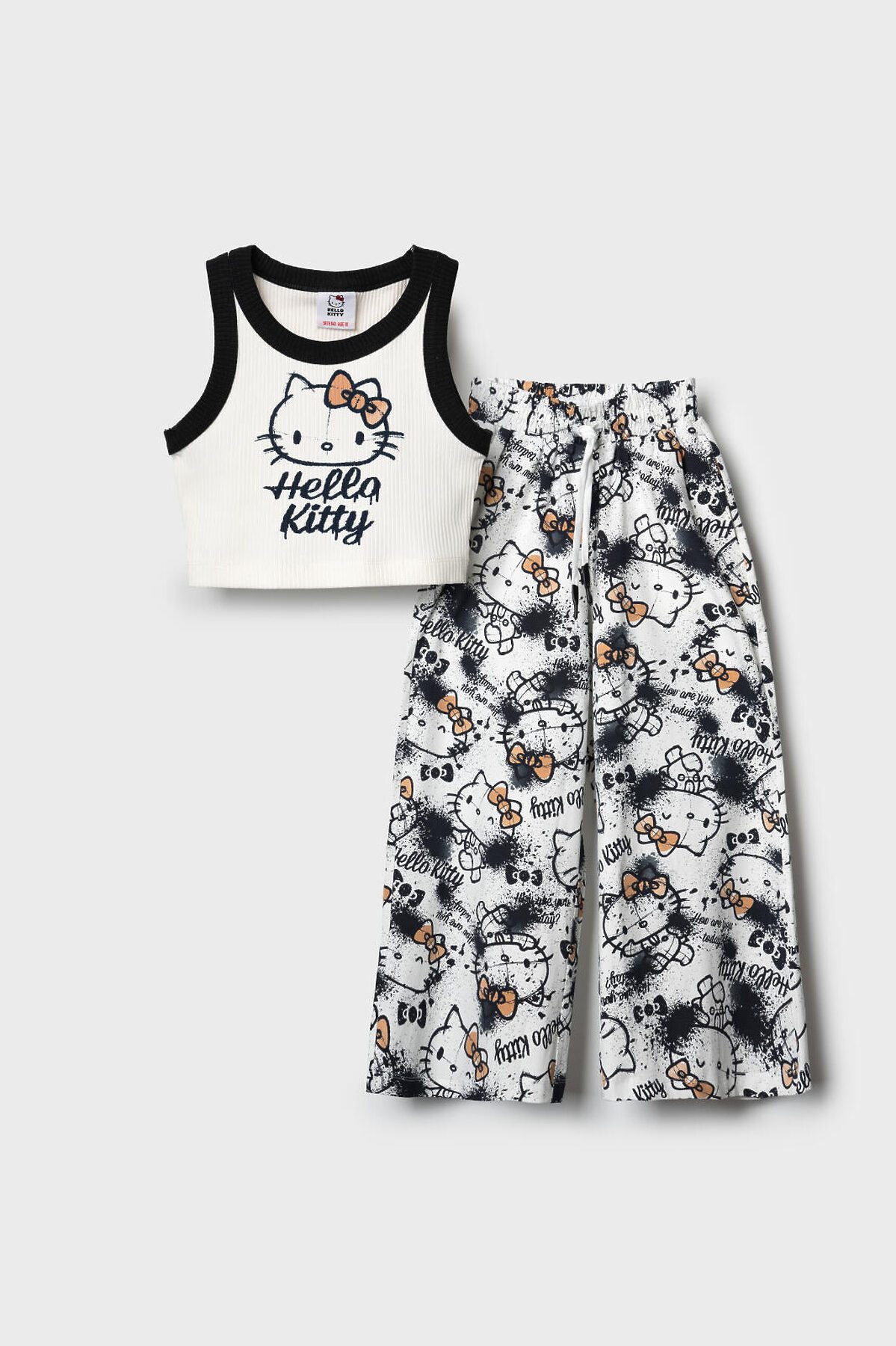 Комплект для девочки подростка. Базовый топ из хлопкового трикотажа в рубчик. Широкие брюки палаццо выполнены из хлопкового трикотажа джерси. Пояс на резинке со шнурком для регулировки посадки. Удобные боковые карманы. Принты с любимым мультяшным персонажем Хеллоу Китти.