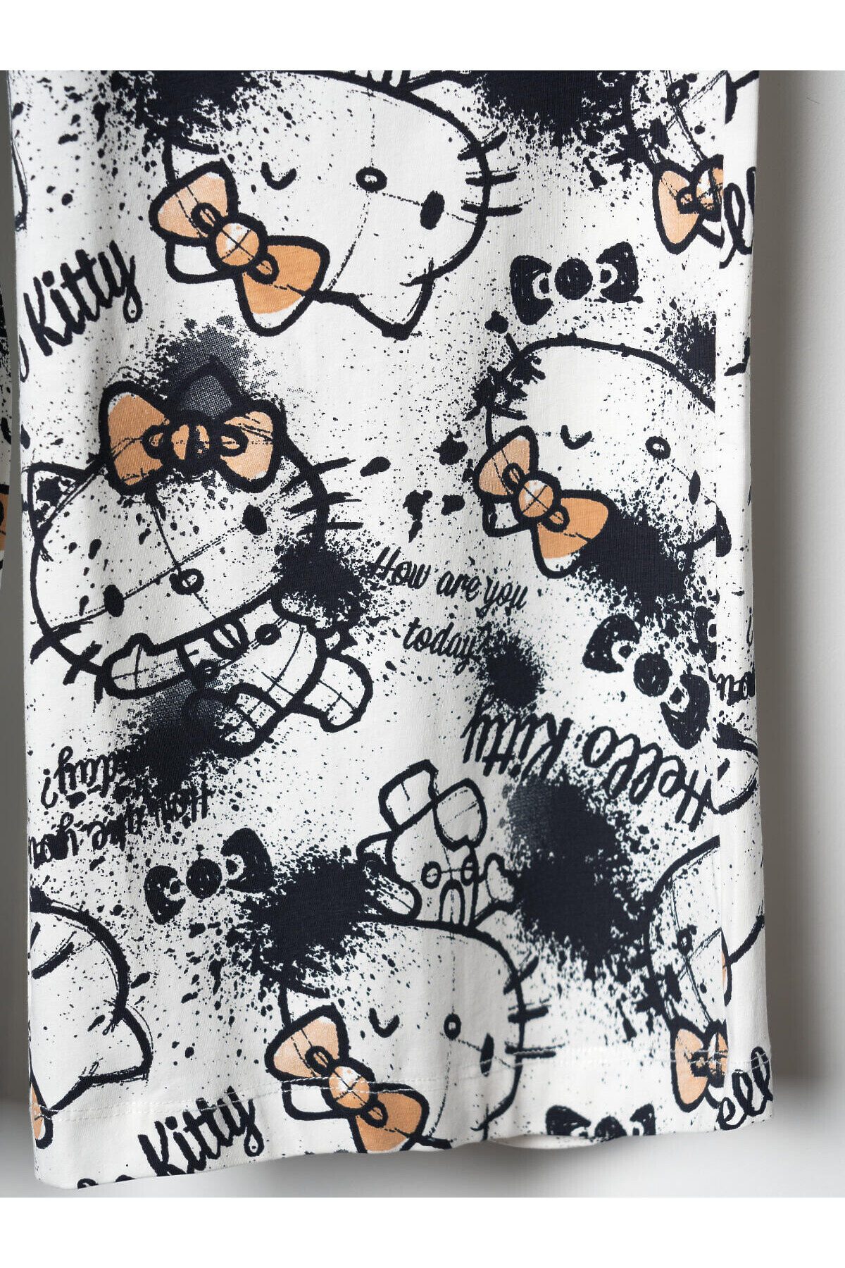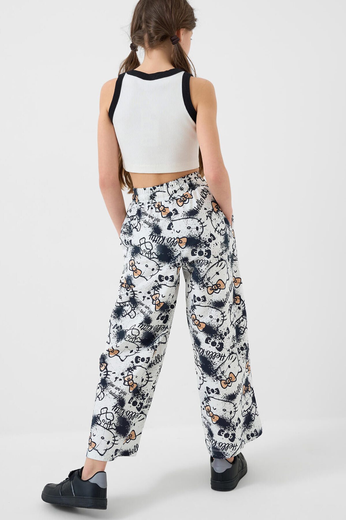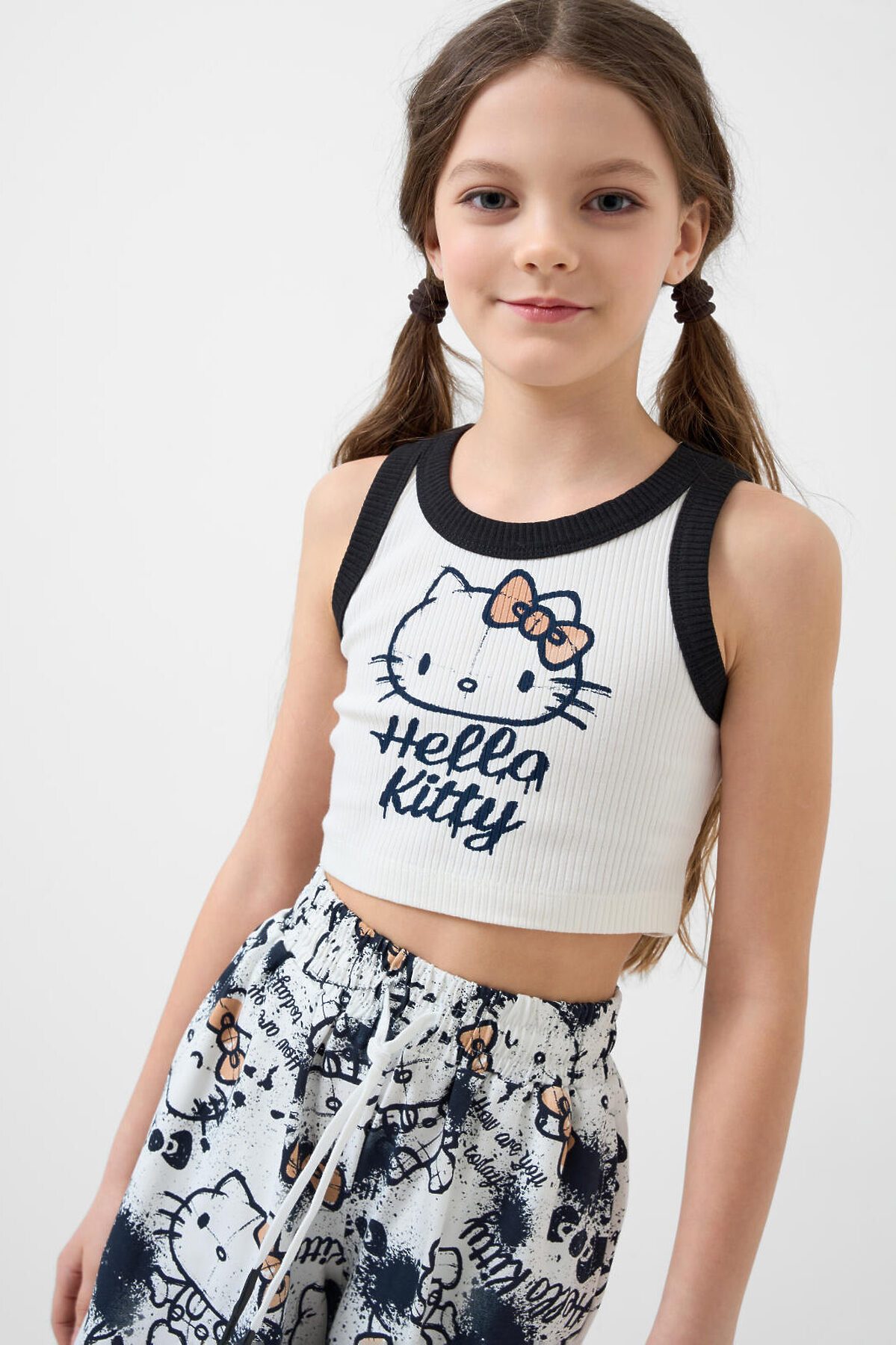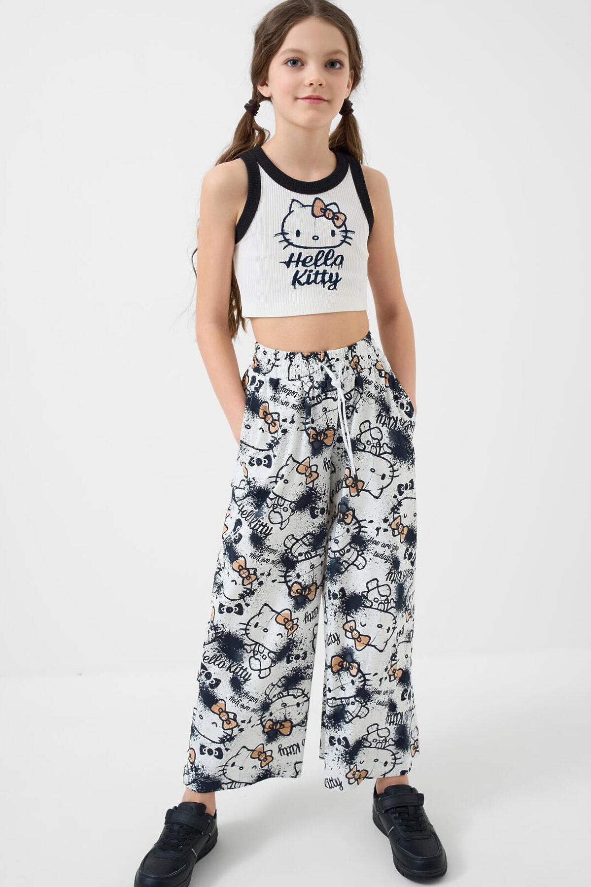 Комплект для девочки подростка. Базовый топ из хлопкового трикотажа в рубчик. Широкие брюки палаццо выполнены из хлопкового трикотажа джерси. Пояс на резинке со шнурком для регулировки посадки. Удобные боковые карманы. Принты с любимым мультяшным персонажем Хеллоу Китти.