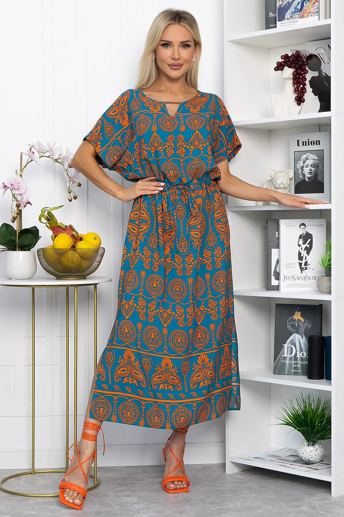 Платье из штапеля в лазурно-оранжевом цвете — это ваш универсальный спутник на все случаи жизни. Оно комфортное и подходит для любых ситуаций — будь то прогулка по городу или романтический ужин. Благодаря небольшим разрезам по бокам, платье выглядит игриво и легко. А кулиска на талии подчёркивает фигуру и создаёт идеальный силуэт.