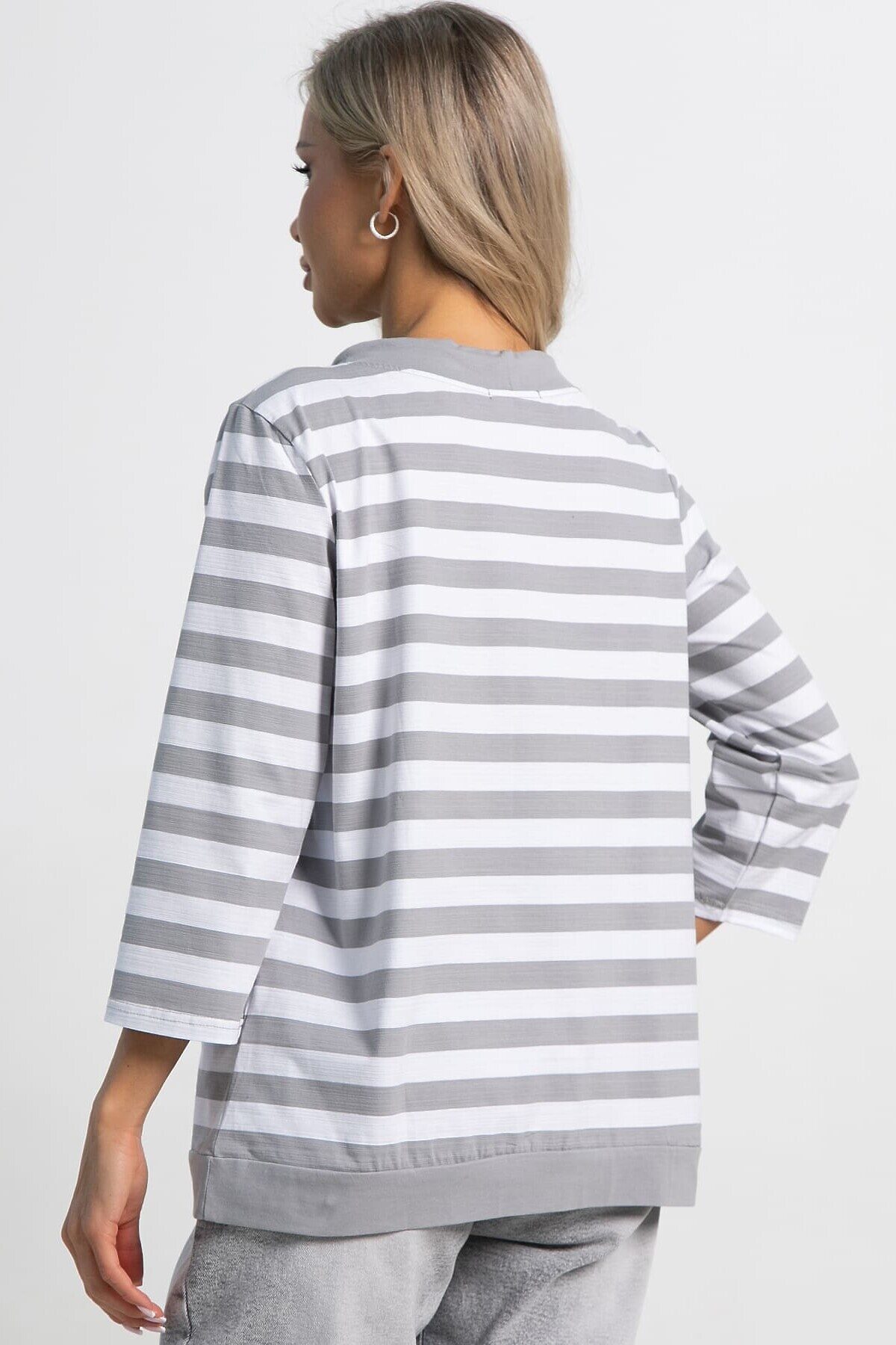 Эта блуза прямого кроя с рукавами три четверти — идеальный выбор для повседневного образа. Воротник-хомут с затяжкой придает модели современный и оригинальный вид. Широкая притачная деталь по низу создает аккуратный и завершенный силуэт. Блуза выполнена в серую полоску на белом фоне, что делает ее универсальной и легко сочетаемой с другими элементами гардероба. Отличный выбор для тех, кто ценит комфорт, стиль и удобство в повседневной одежде.