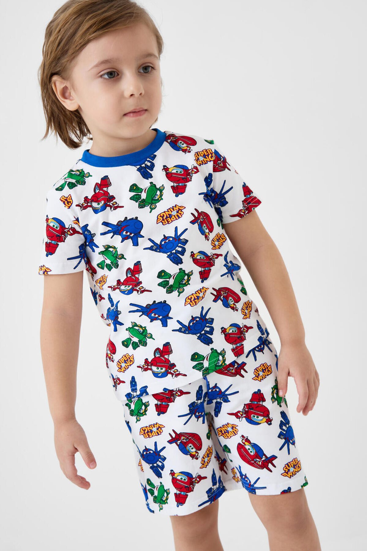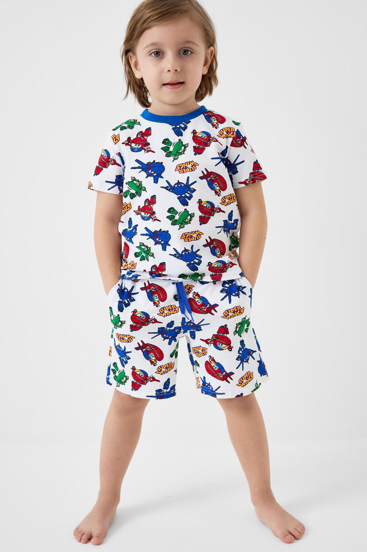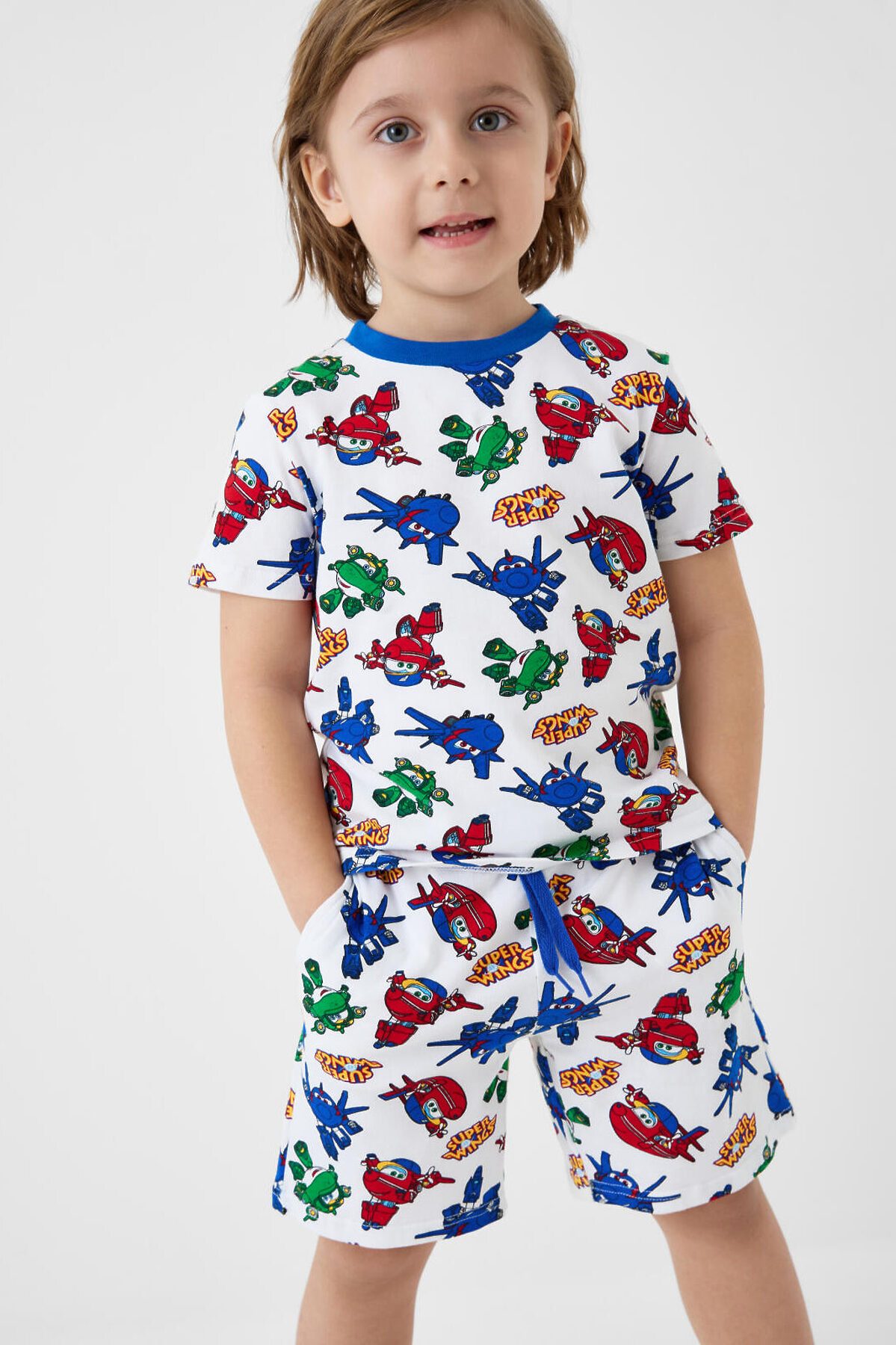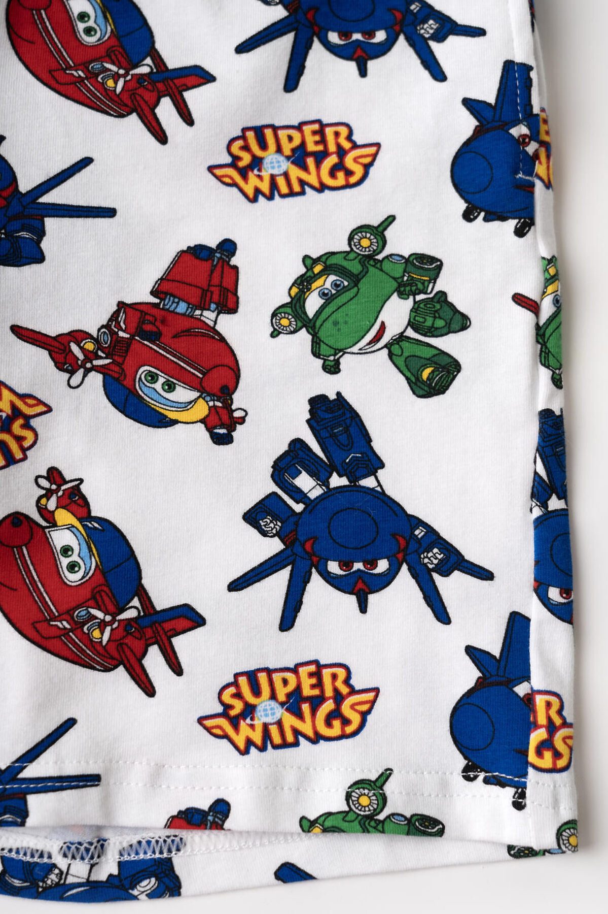 Детская пижама для мальчика. Состоит из футболки с короткими рукавами и шорт. Модель выполнена из мягкого, хлопкового трикотажа и украшена ярким принтом с персонажами "Super Wings". Пояс на шортах на резинке с регулировкой.