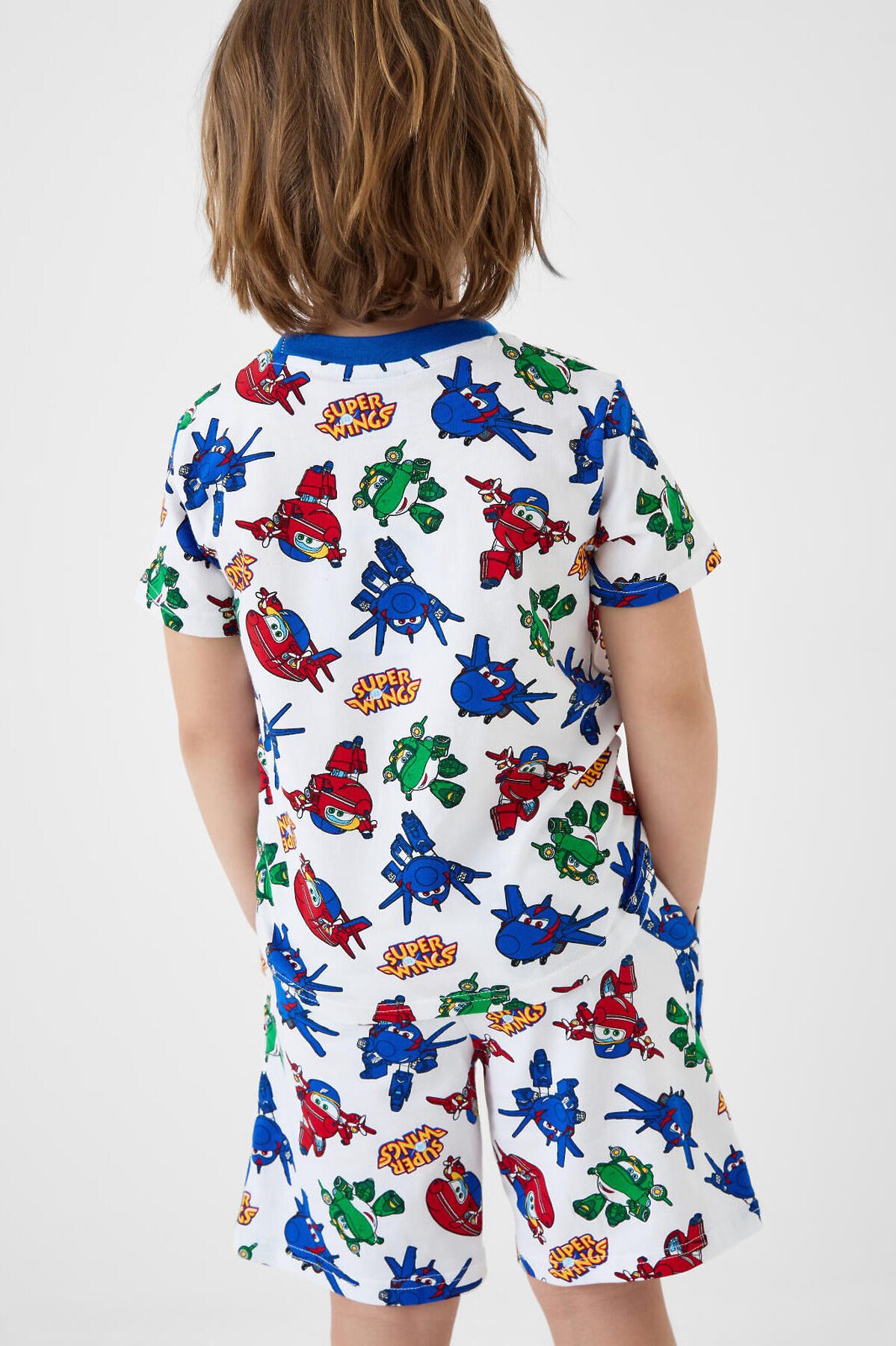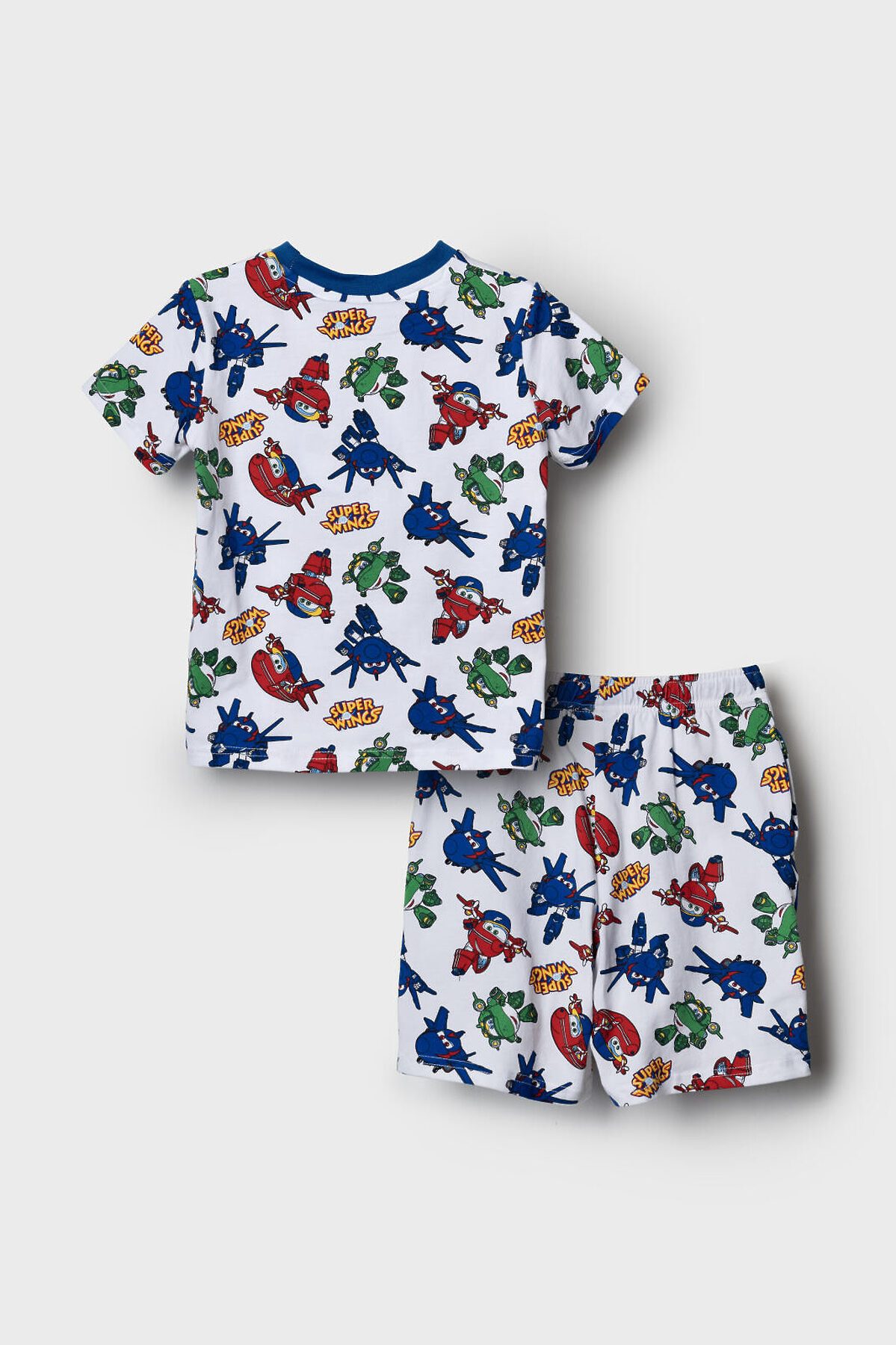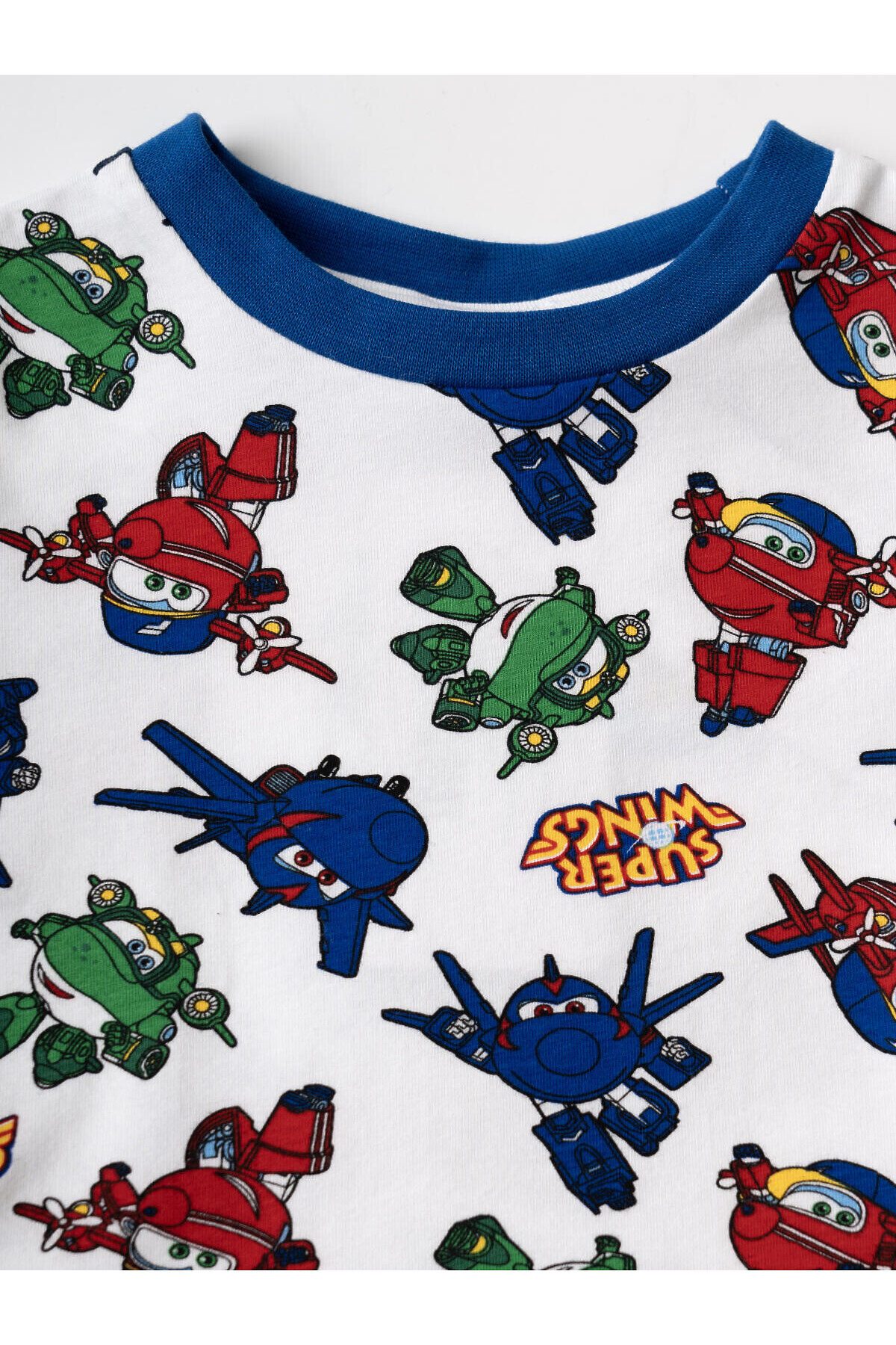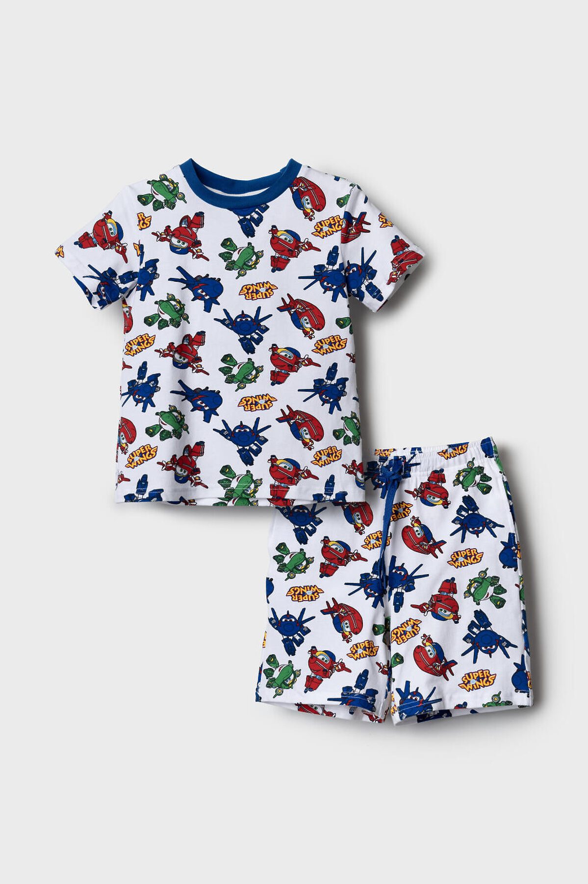Детская пижама для мальчика. Состоит из футболки с короткими рукавами и шорт. Модель выполнена из мягкого, хлопкового трикотажа и украшена ярким принтом с персонажами "Super Wings". Пояс на шортах на резинке с регулировкой.