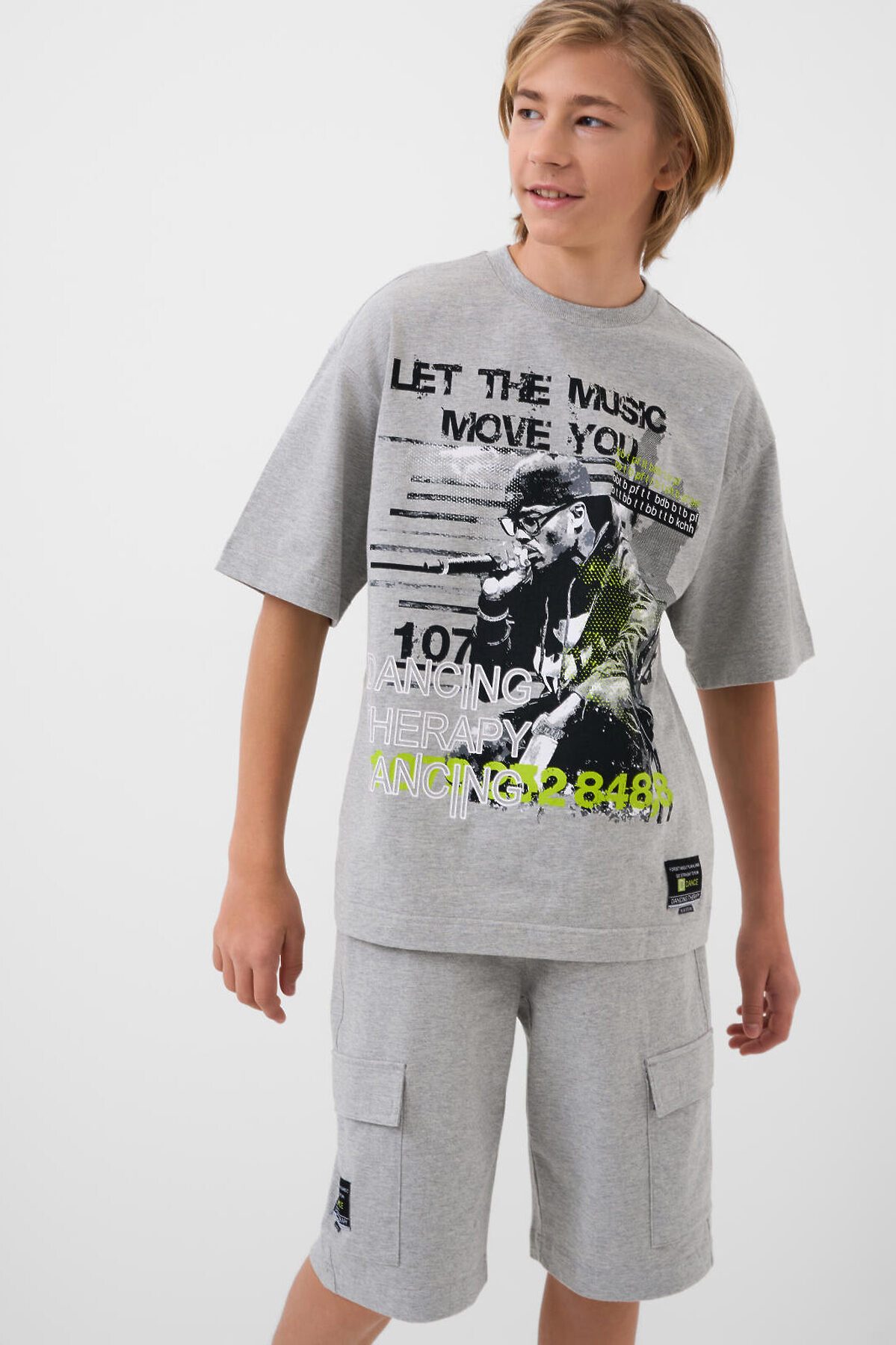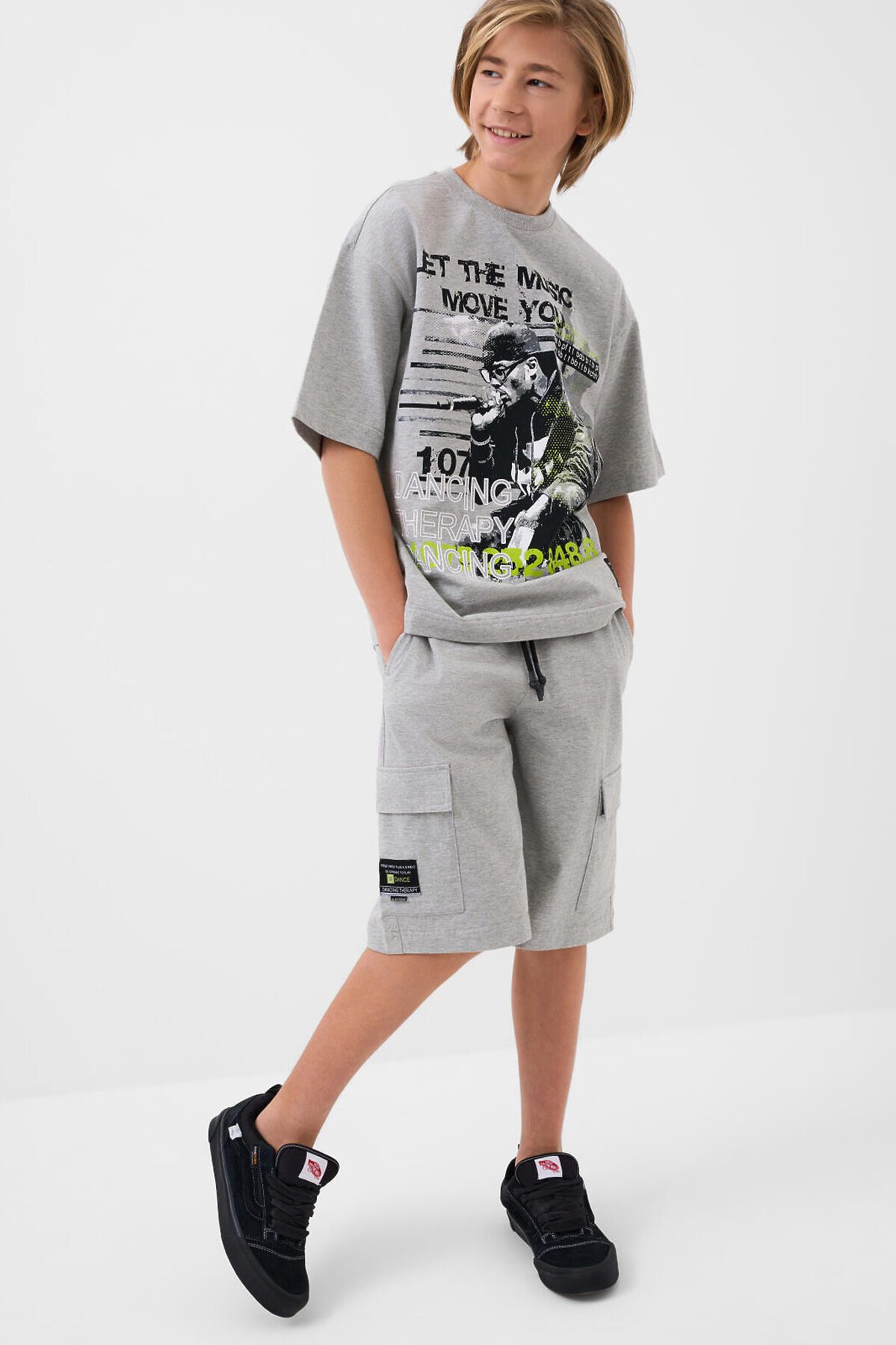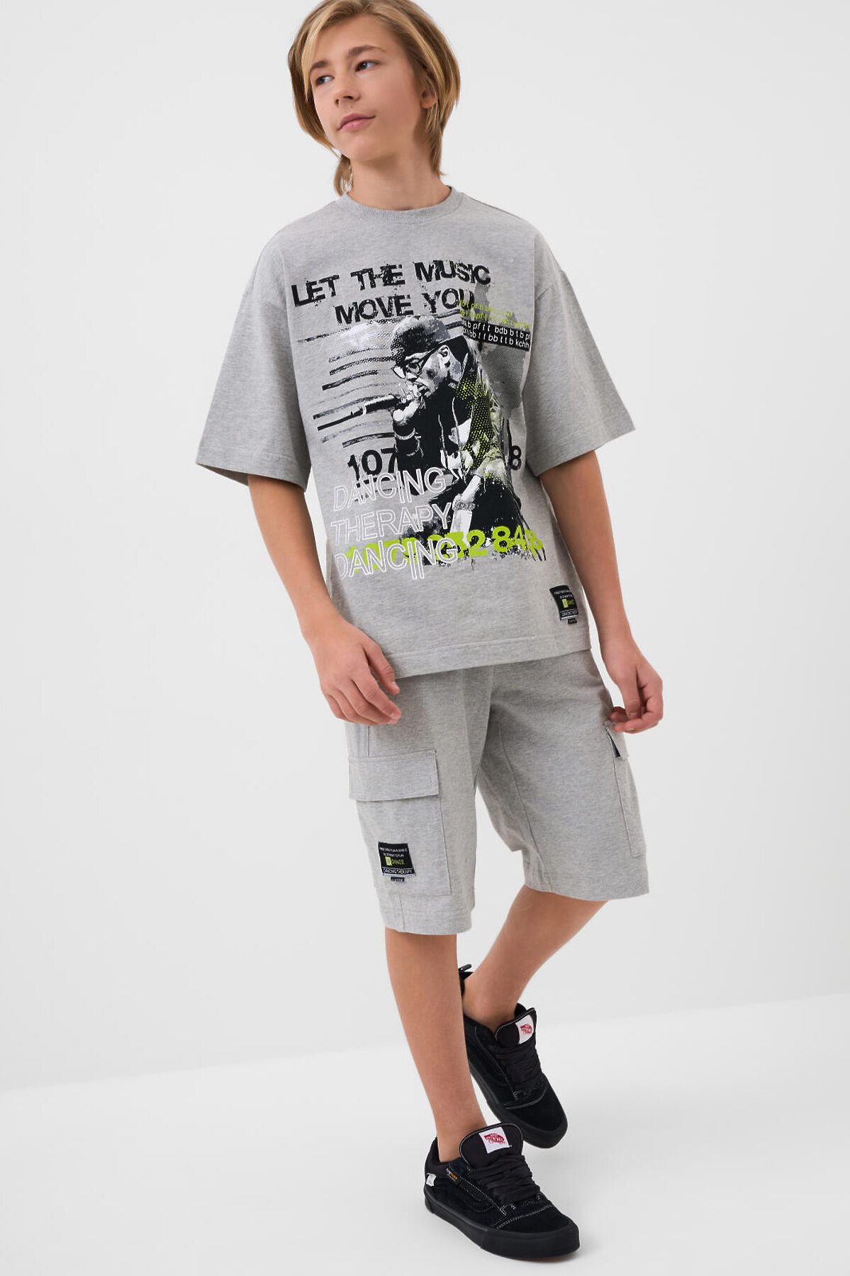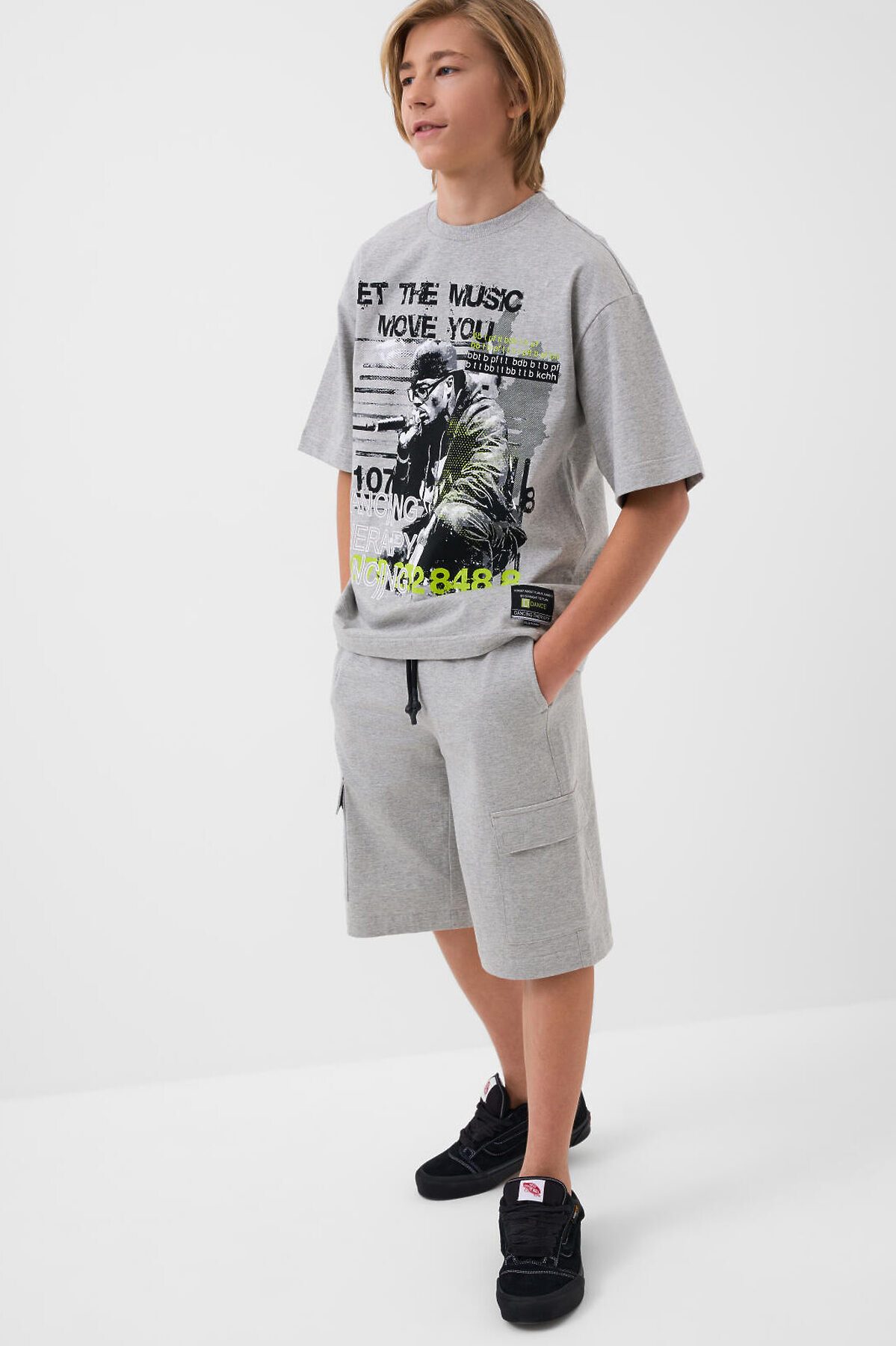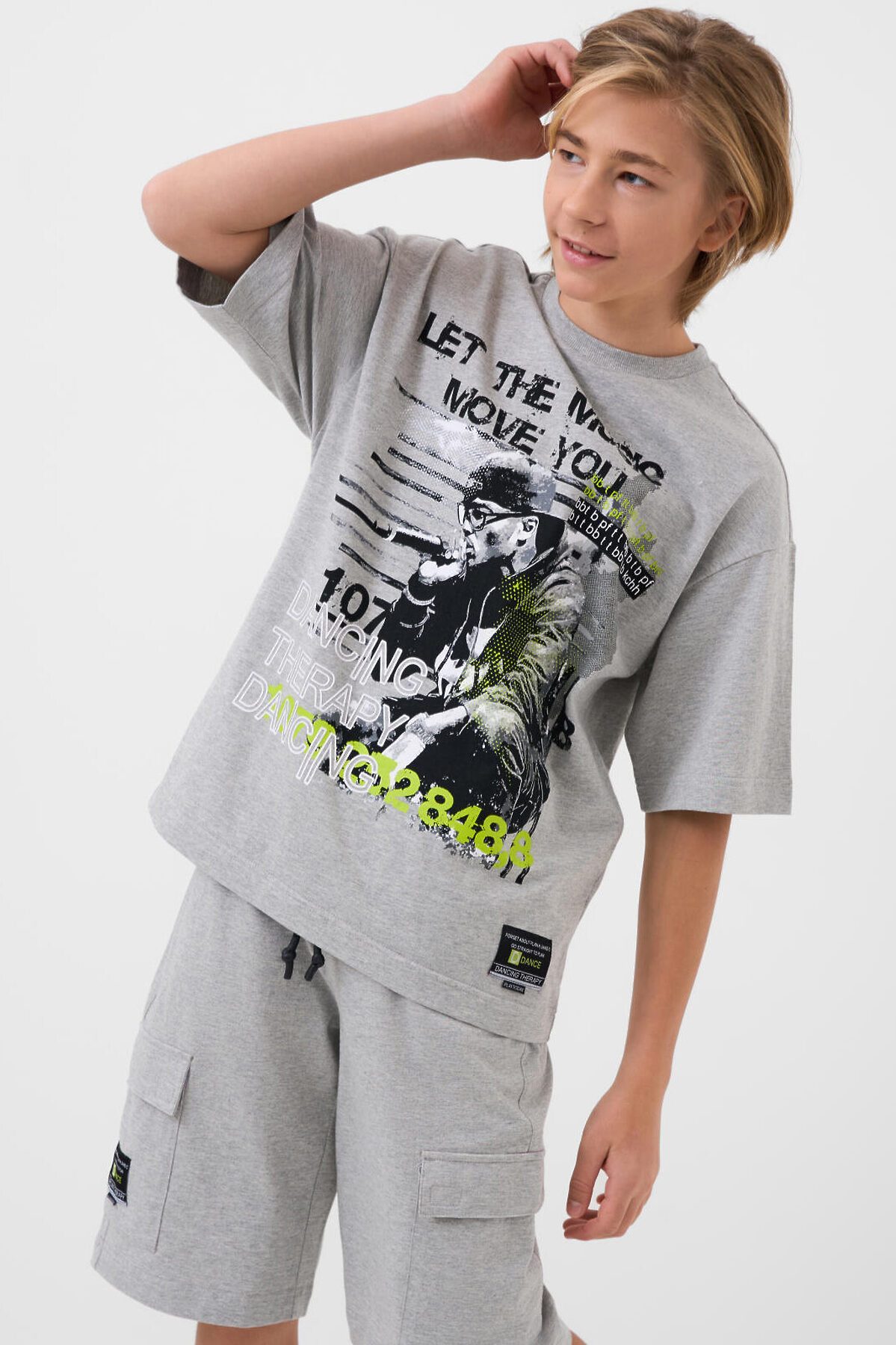 Костюм для мальчика подростка. Состоит из футболки и шорт. Выполнен из хлопкового трикотажа. Футболка оверсайз, с коротким рукавом. Красочные принты и нашивки. Шорты свободные, с эластичным поясом и шнурком для регулировки посадки. Удобные боковые карманы и накладные карманы-карго.