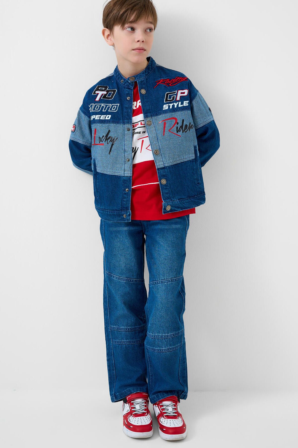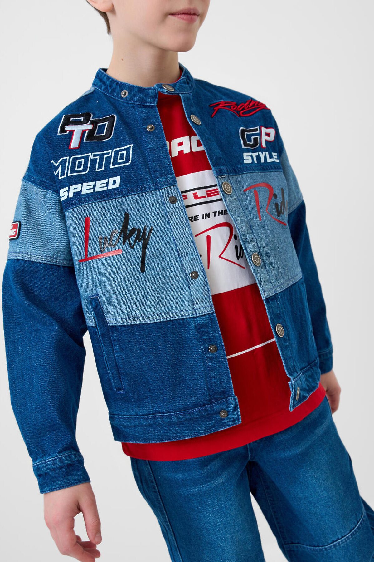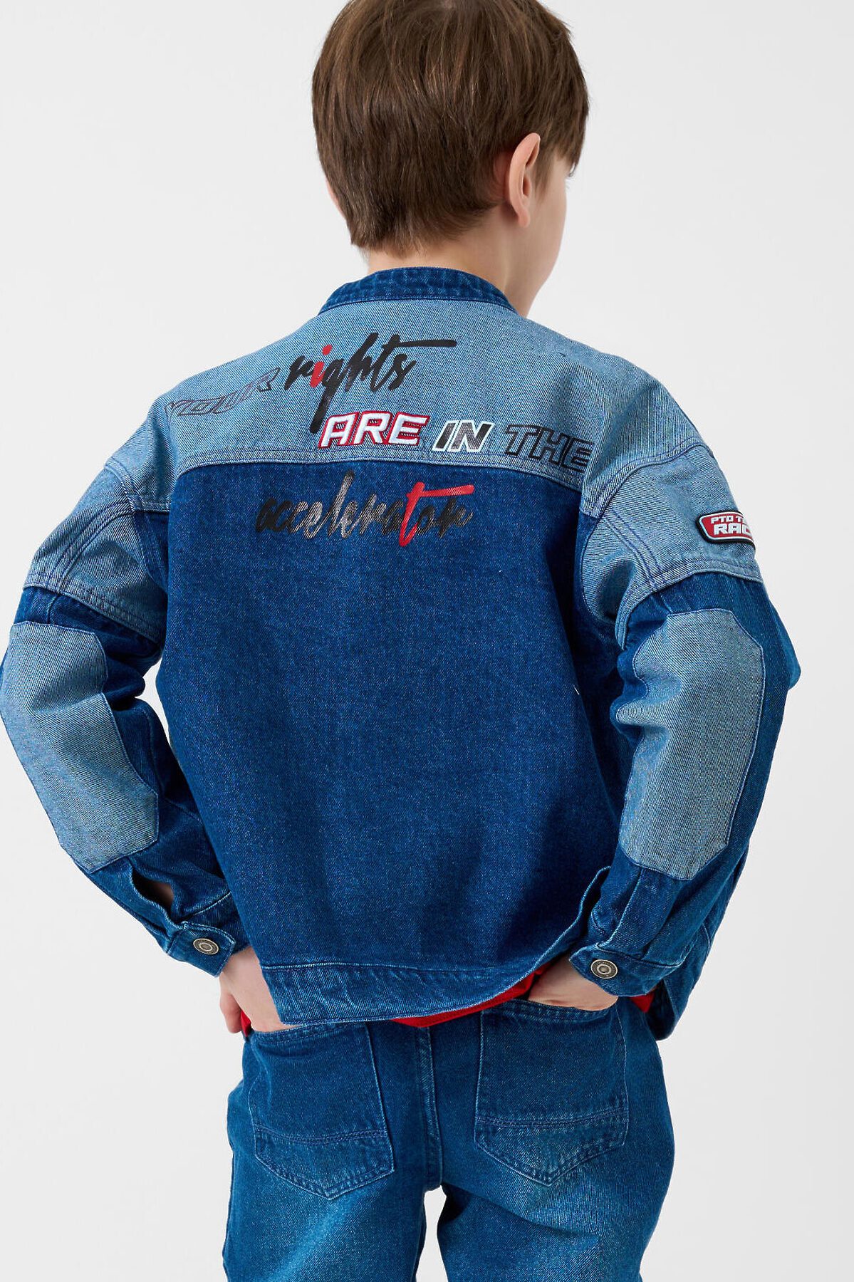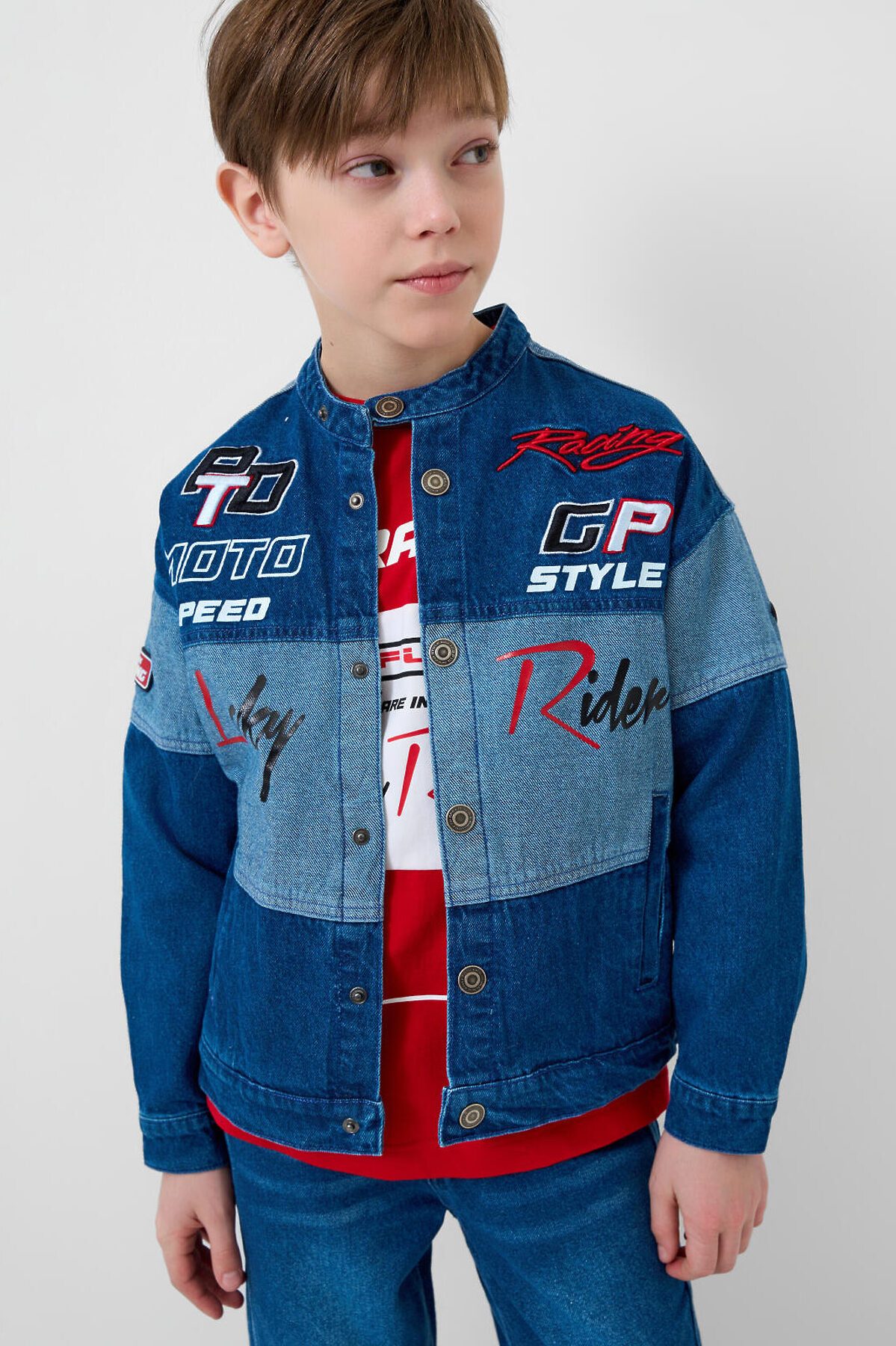 Джинсовая куртка в байкерском стиле, выполнена из плотного тёмно-синего денима с эффектом варки для мальчика подростка. Температурный режим до 15 °C. Модель имеет прямой силуэт и застёжку на кнопках. Два кармана с клапанами на кнопках. Дизайн с декоративными принтами, силиконовыми патчами и текстовыми вставками на спине, рукавах и передней части. Подростковая джинсовка для мальчиков — подойдёт для тёплой весны или ранней осени.