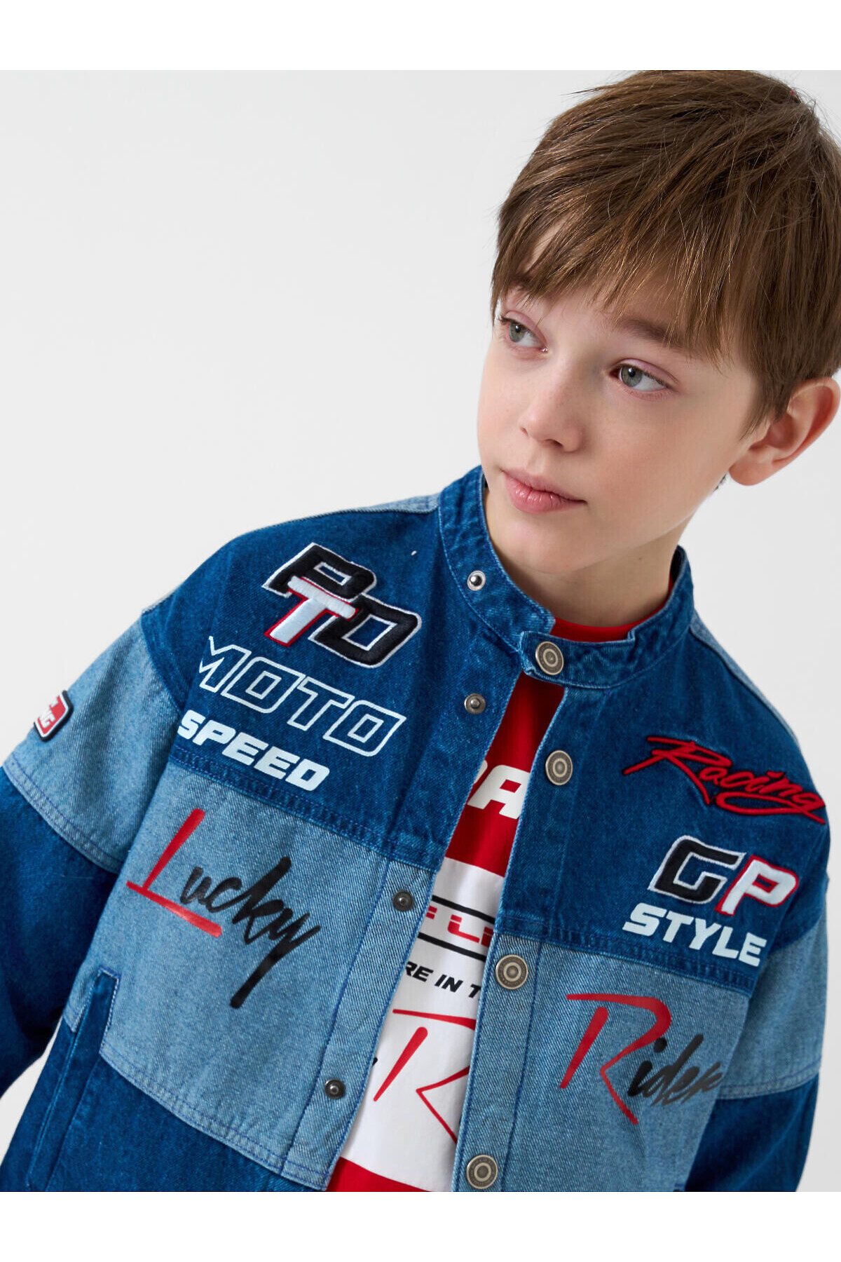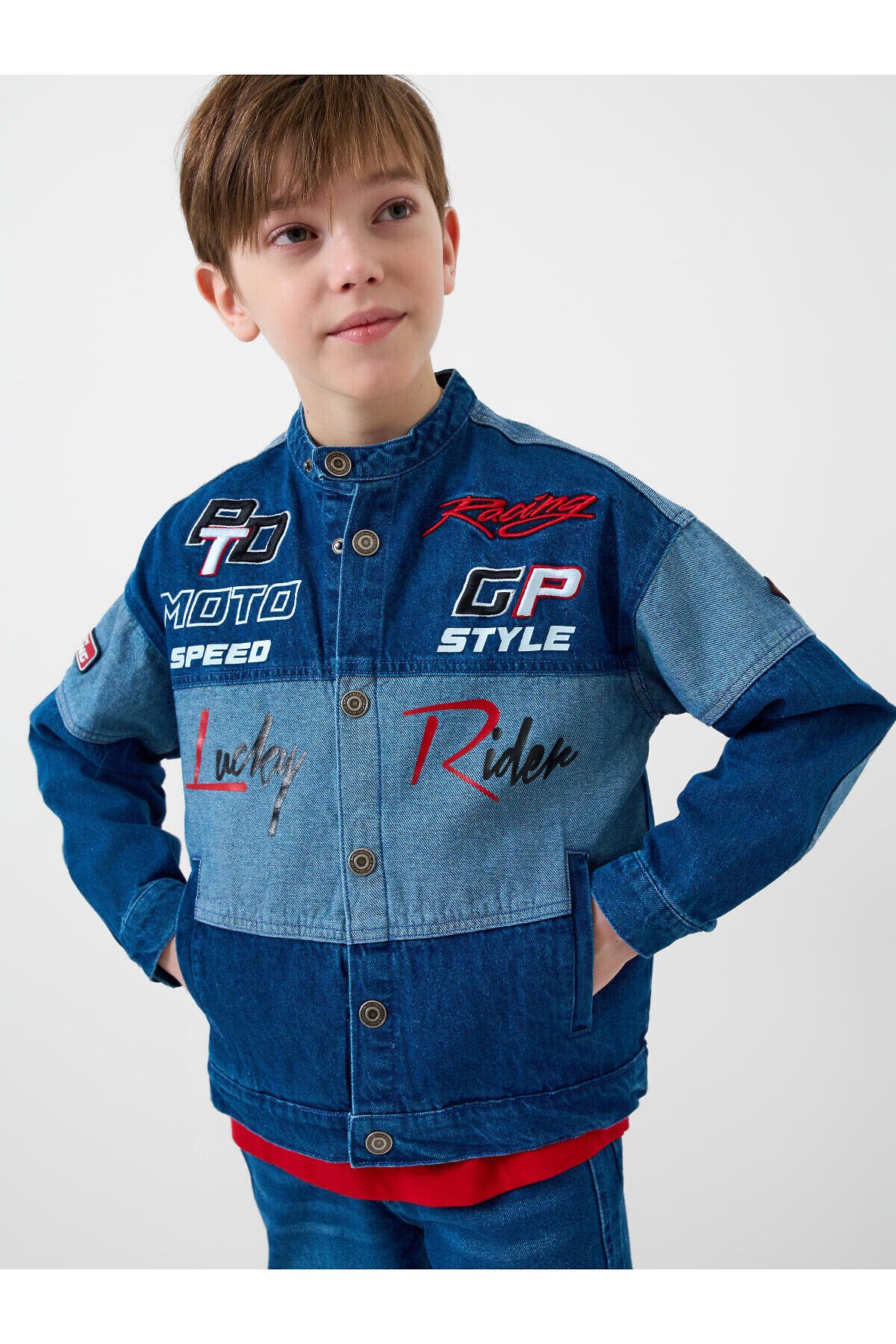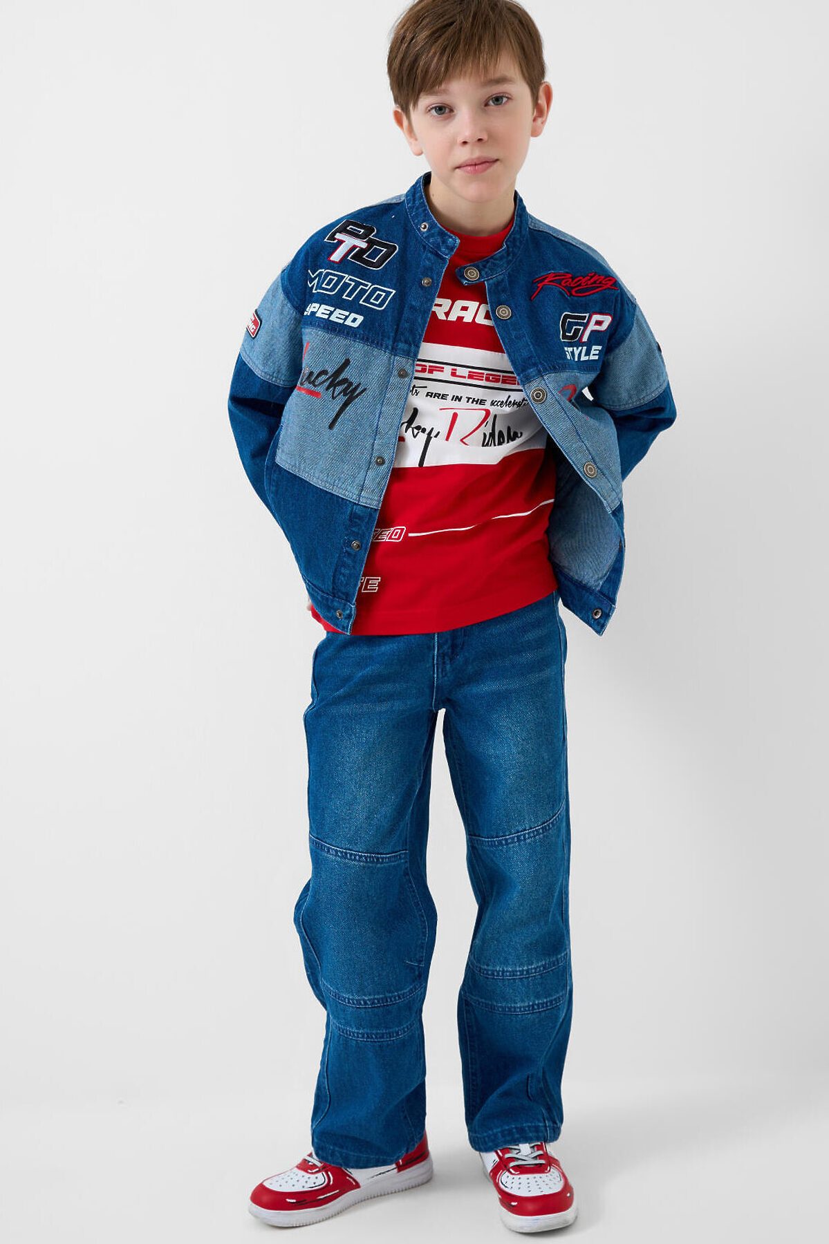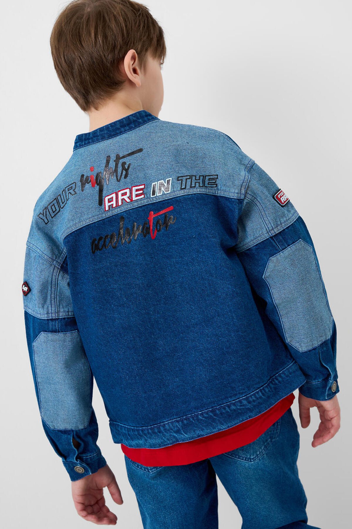 Джинсовая куртка в байкерском стиле, выполнена из плотного тёмно-синего денима с эффектом варки для мальчика подростка. Температурный режим до 15 °C. Модель имеет прямой силуэт и застёжку на кнопках. Два кармана с клапанами на кнопках. Дизайн с декоративными принтами, силиконовыми патчами и текстовыми вставками на спине, рукавах и передней части. Подростковая джинсовка для мальчиков — подойдёт для тёплой весны или ранней осени.