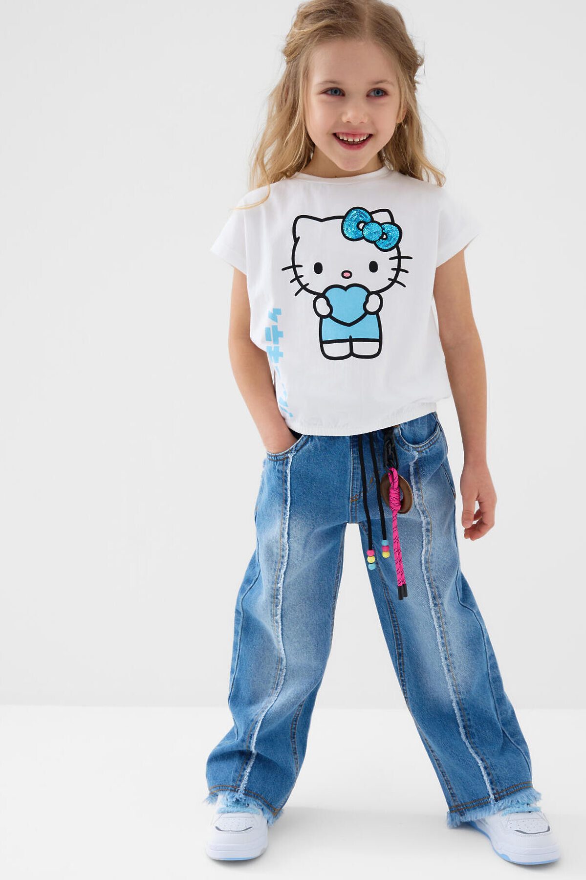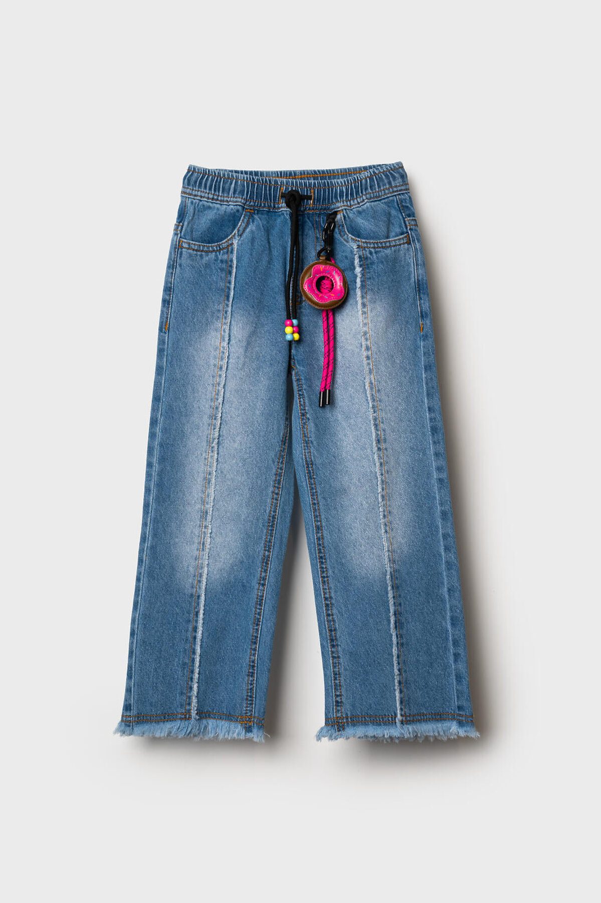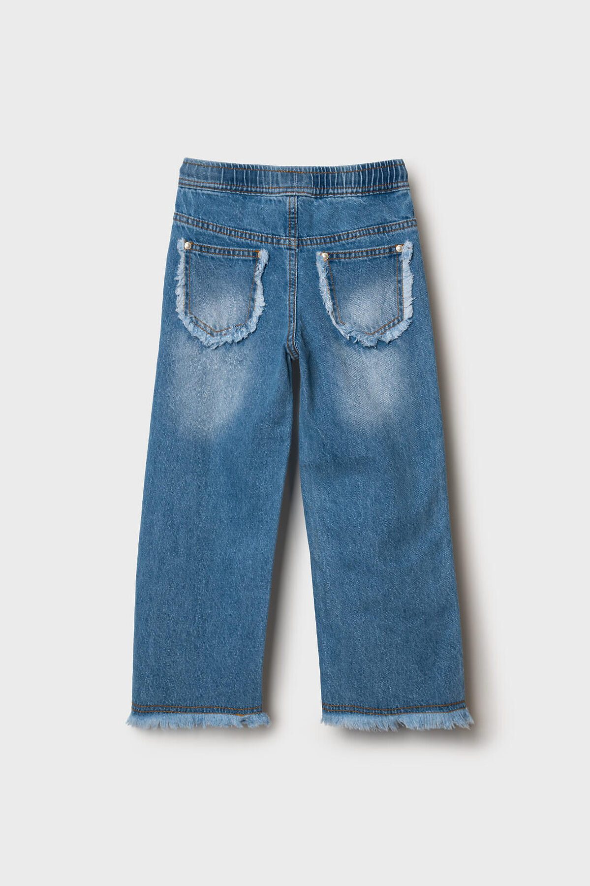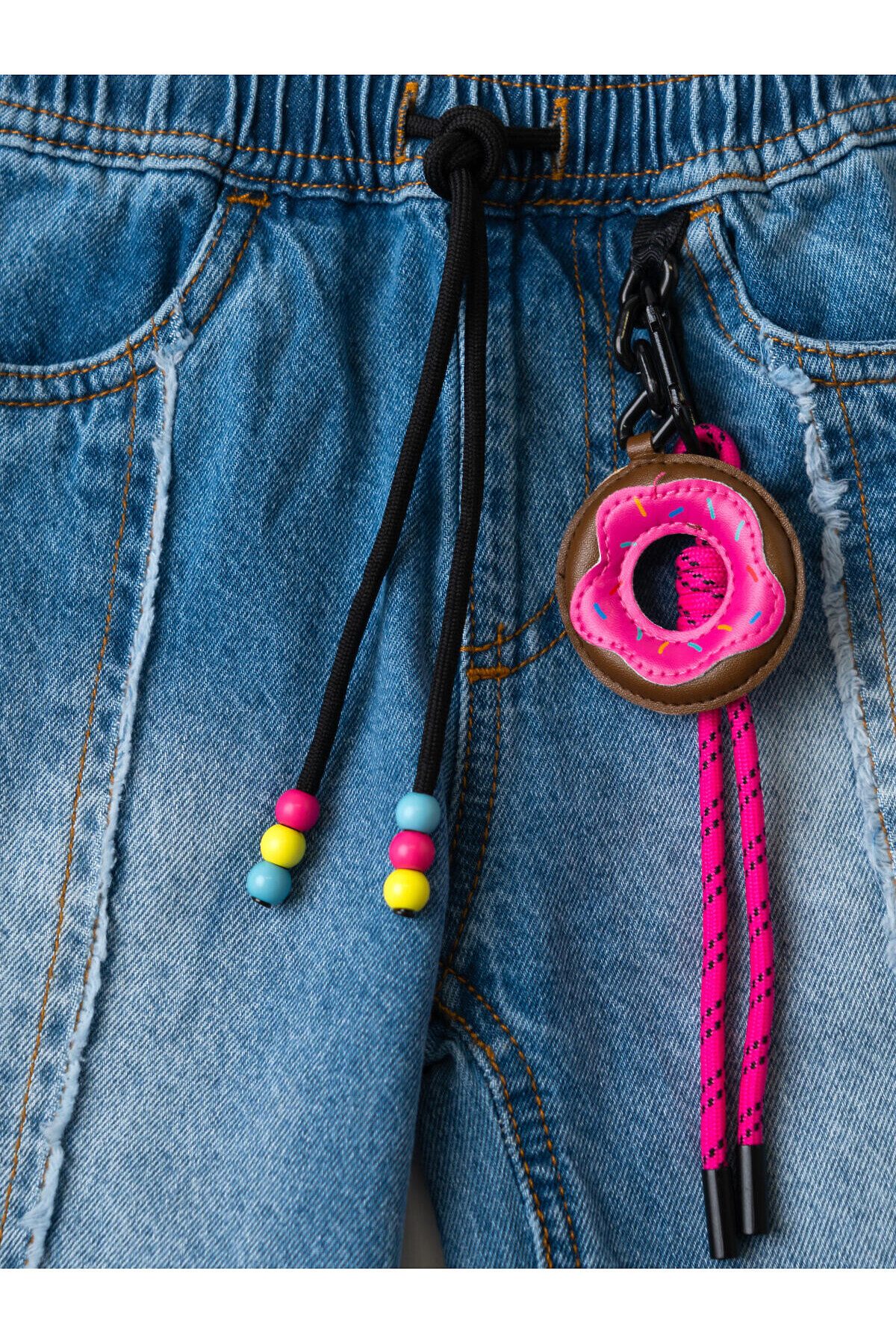 Детские свободные джинсы для девочки. Посадка на талии комфортная — на широкой резинке, с декоративными шнурами и яркими бусинами. Спереди — классические карманы, сзади — карманы с модной бахромой. Cвободный loose fit, с прямыми штанинами. Вдоль штанин — стилизованные вертикальные полосы. К низу брючин — декоративная бахрома. Украшением служит подвес-брелок в области пояса.