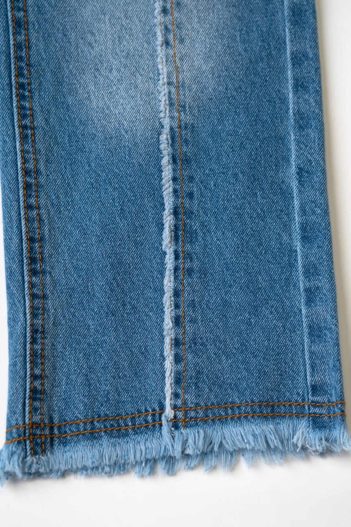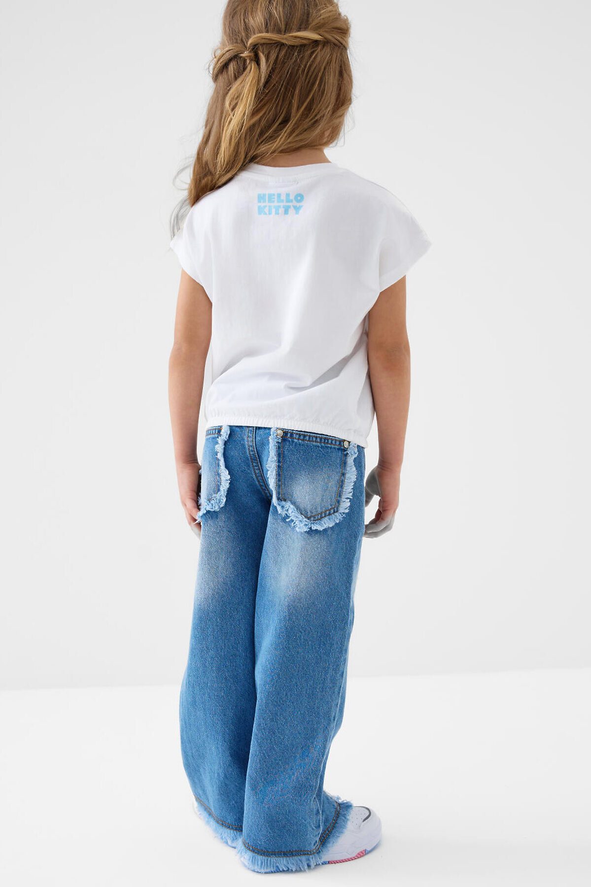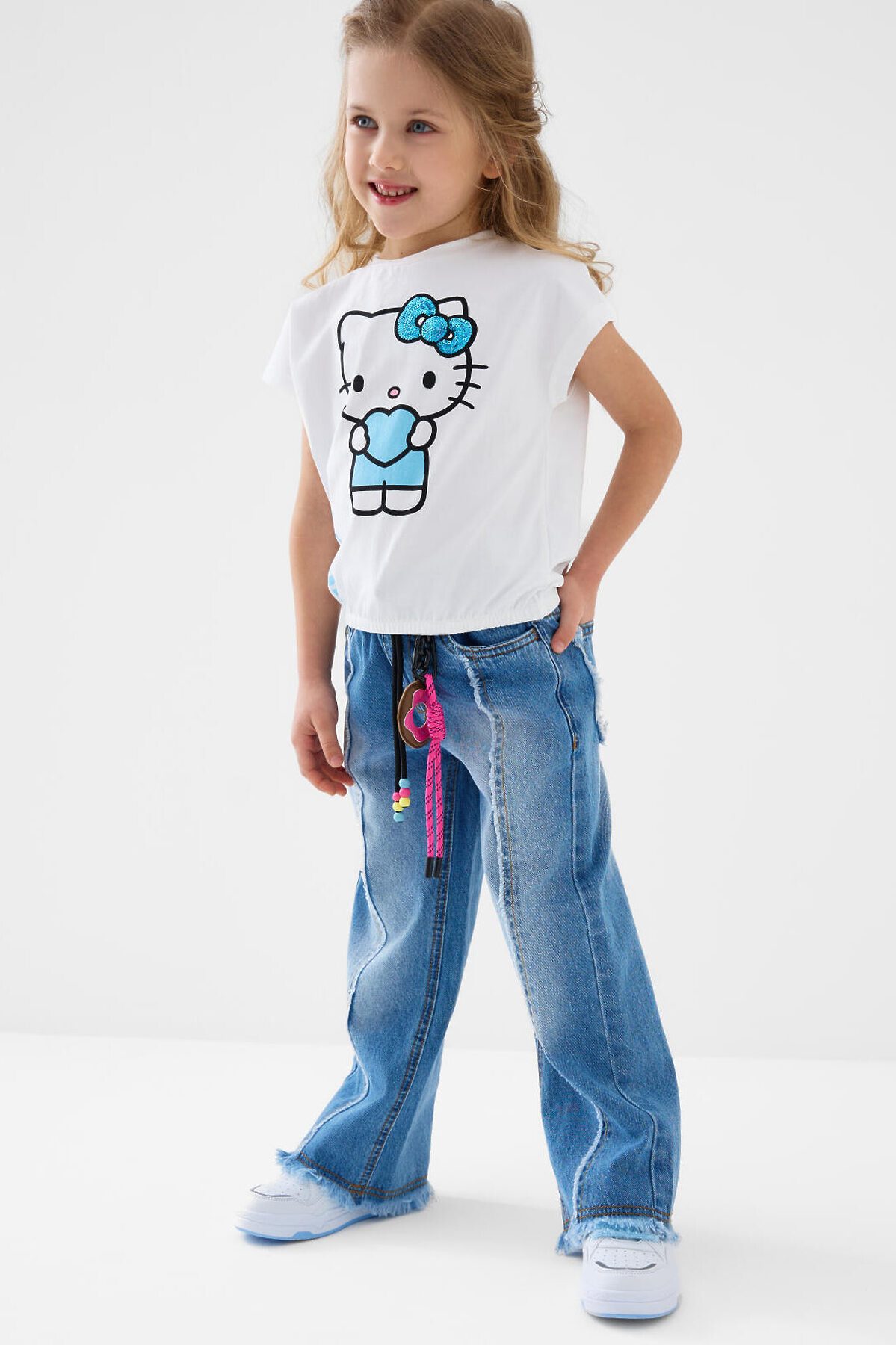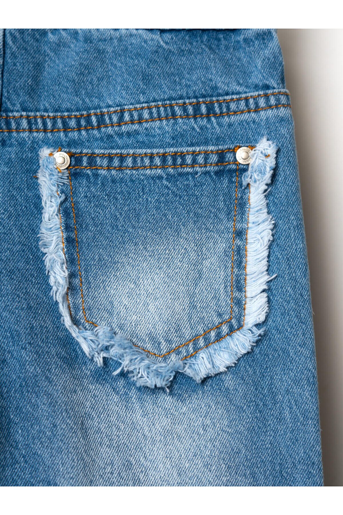 Детские свободные джинсы для девочки. Посадка на талии комфортная — на широкой резинке, с декоративными шнурами и яркими бусинами. Спереди — классические карманы, сзади — карманы с модной бахромой. Cвободный loose fit, с прямыми штанинами. Вдоль штанин — стилизованные вертикальные полосы. К низу брючин — декоративная бахрома. Украшением служит подвес-брелок в области пояса.