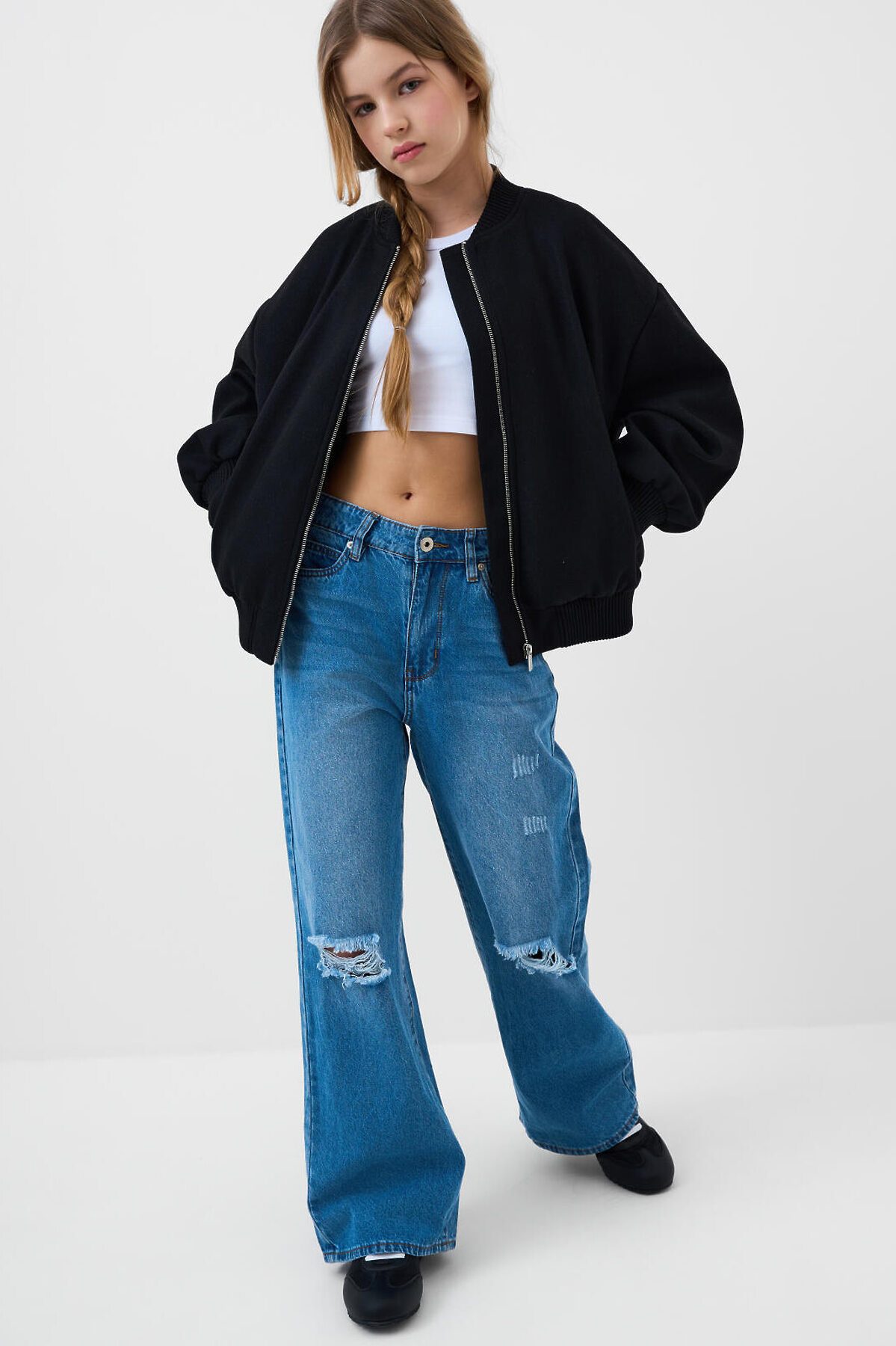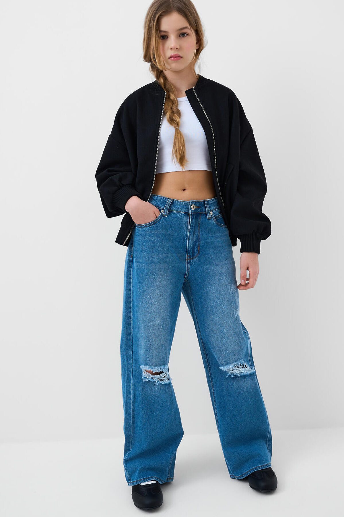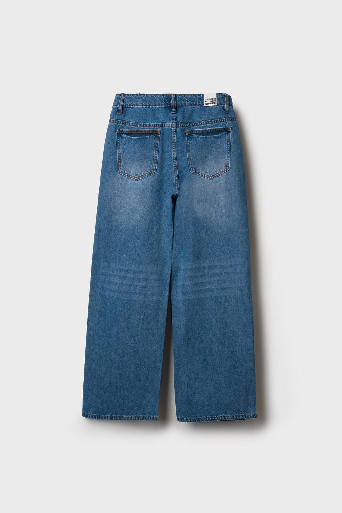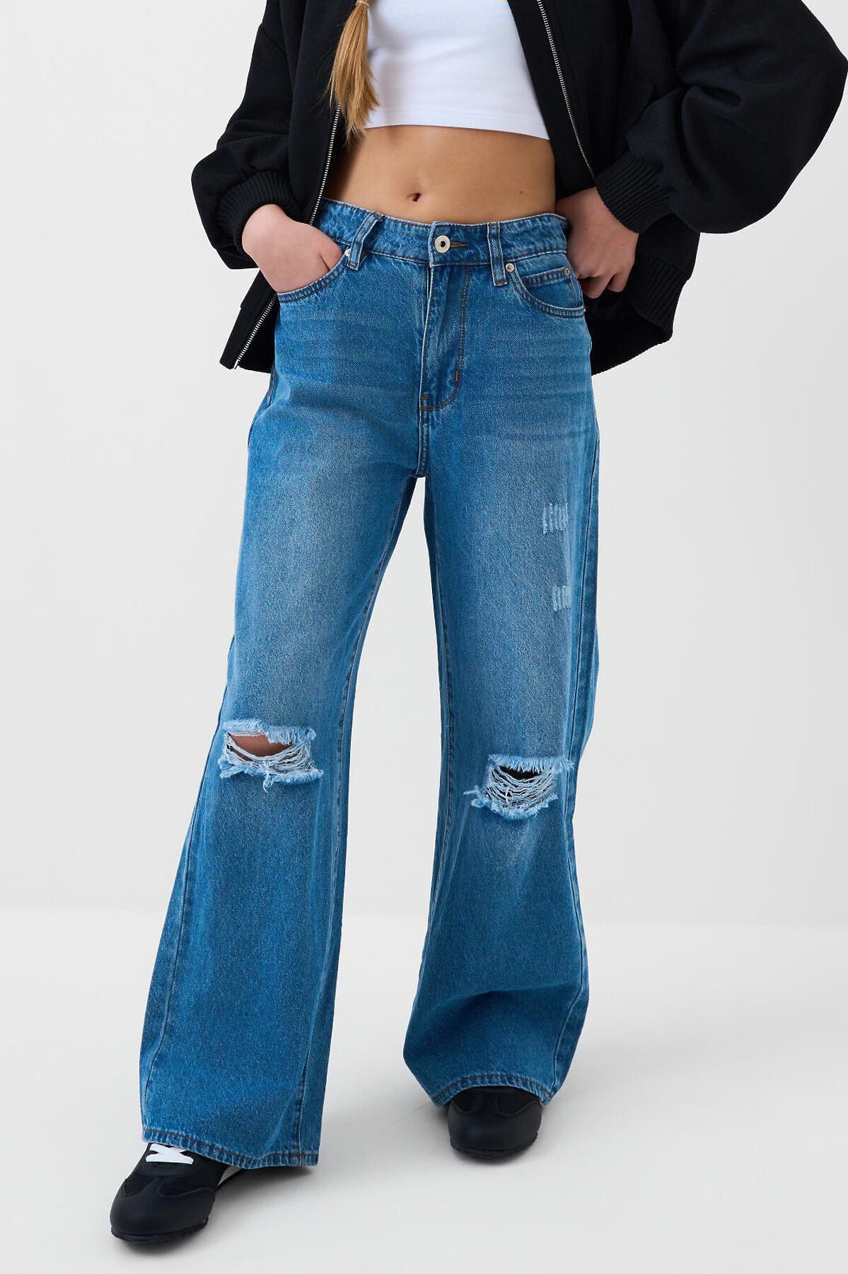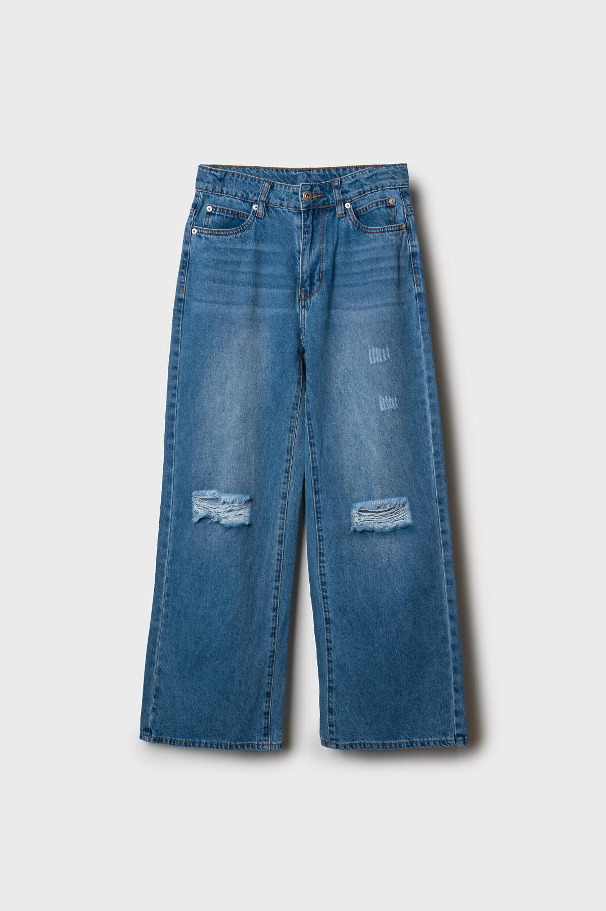 Широкие джинсы wide leg для девочки подростка. Застежка на молнию и болт, пояс дополнительно регулируется внутри с помощью эластичной тесьмы и пуговицы. Изделие выполнено из светло-голубого денима с характерными потертостями и прорезями на передней части. Джинсы имеют свободный крой с прямыми широкими штанинами и посадку на талии. Спереди — два кармана, сзади — два накладных кармана. На одном из них — этикетка с надписью.