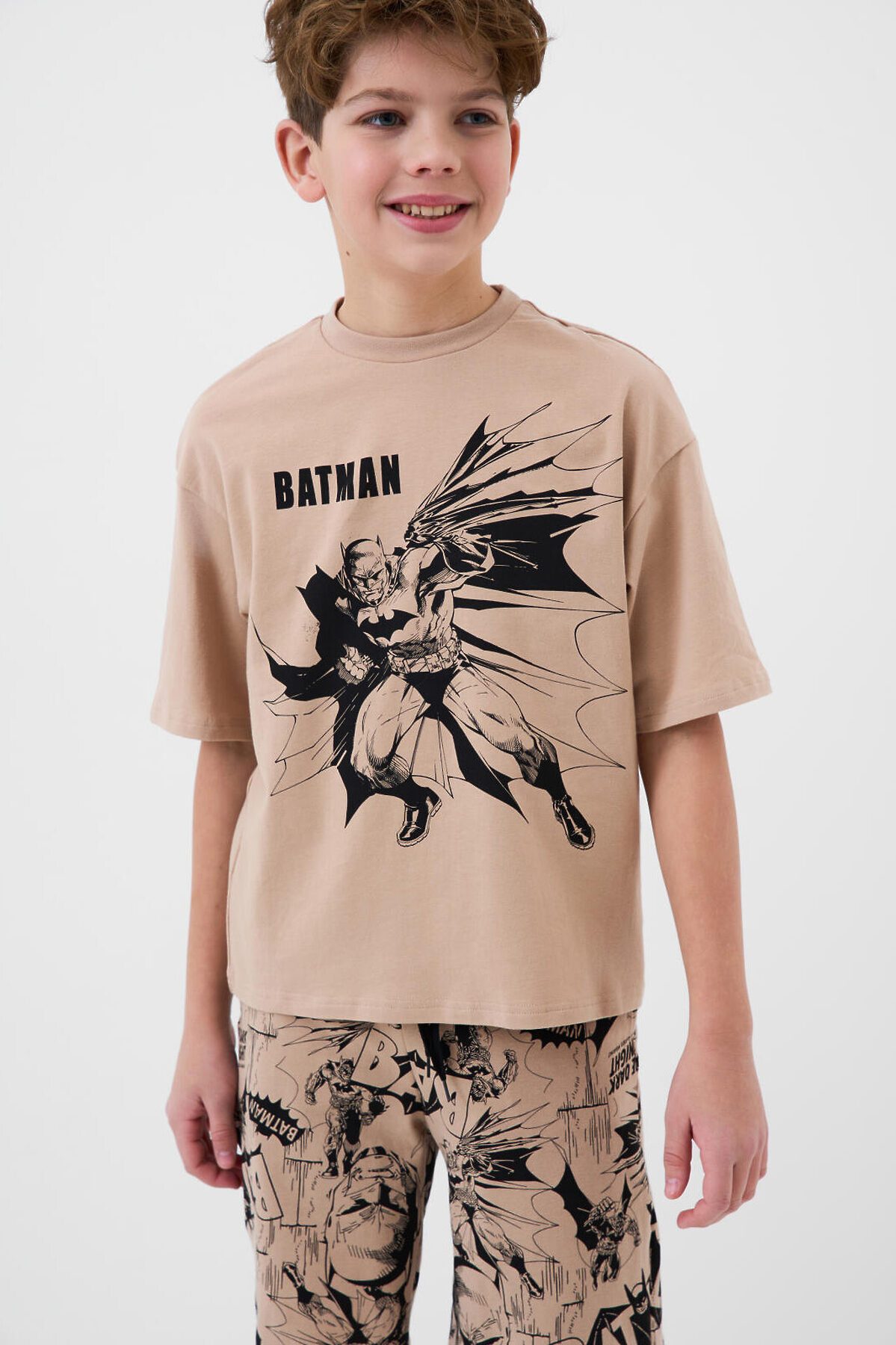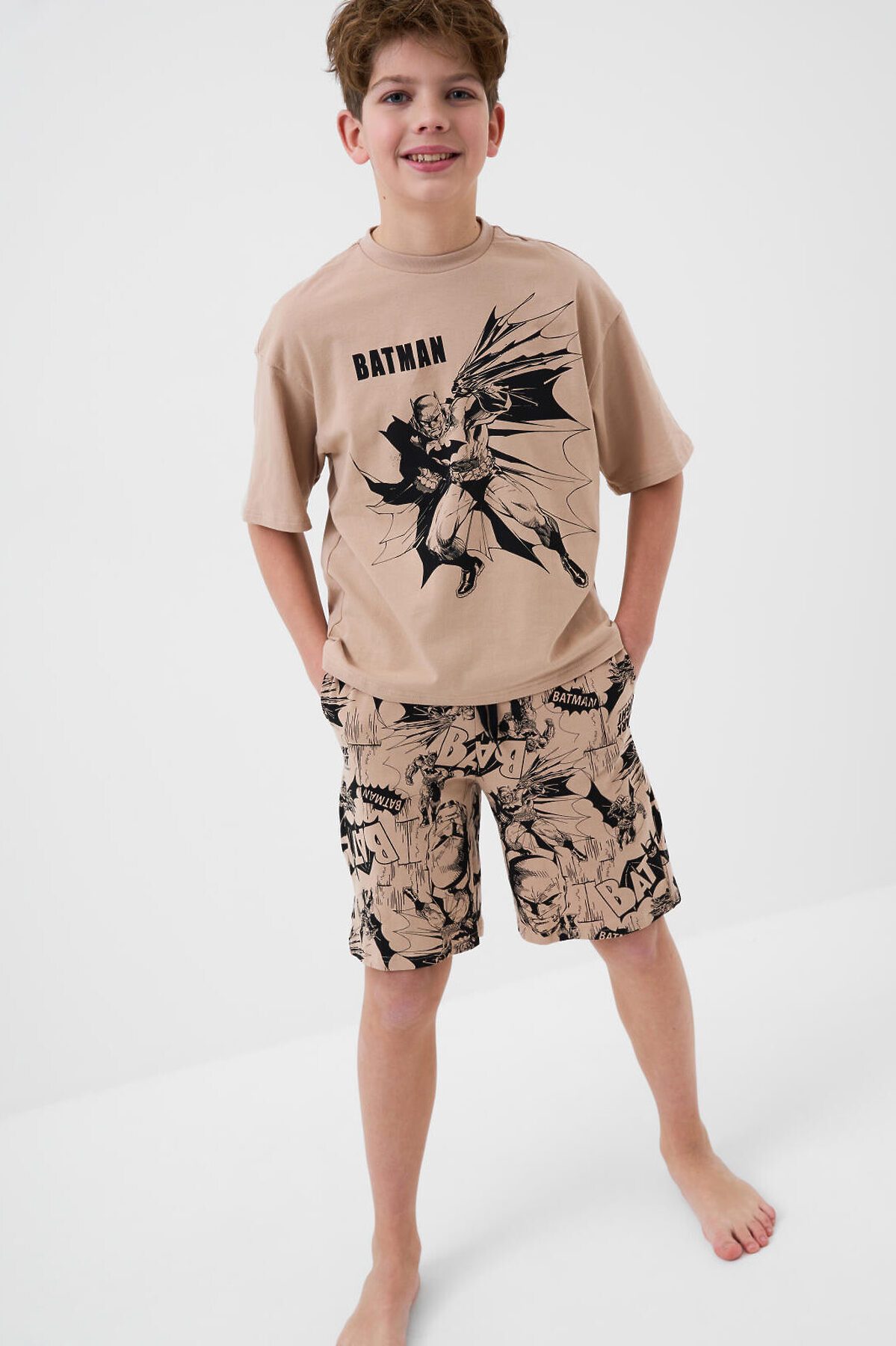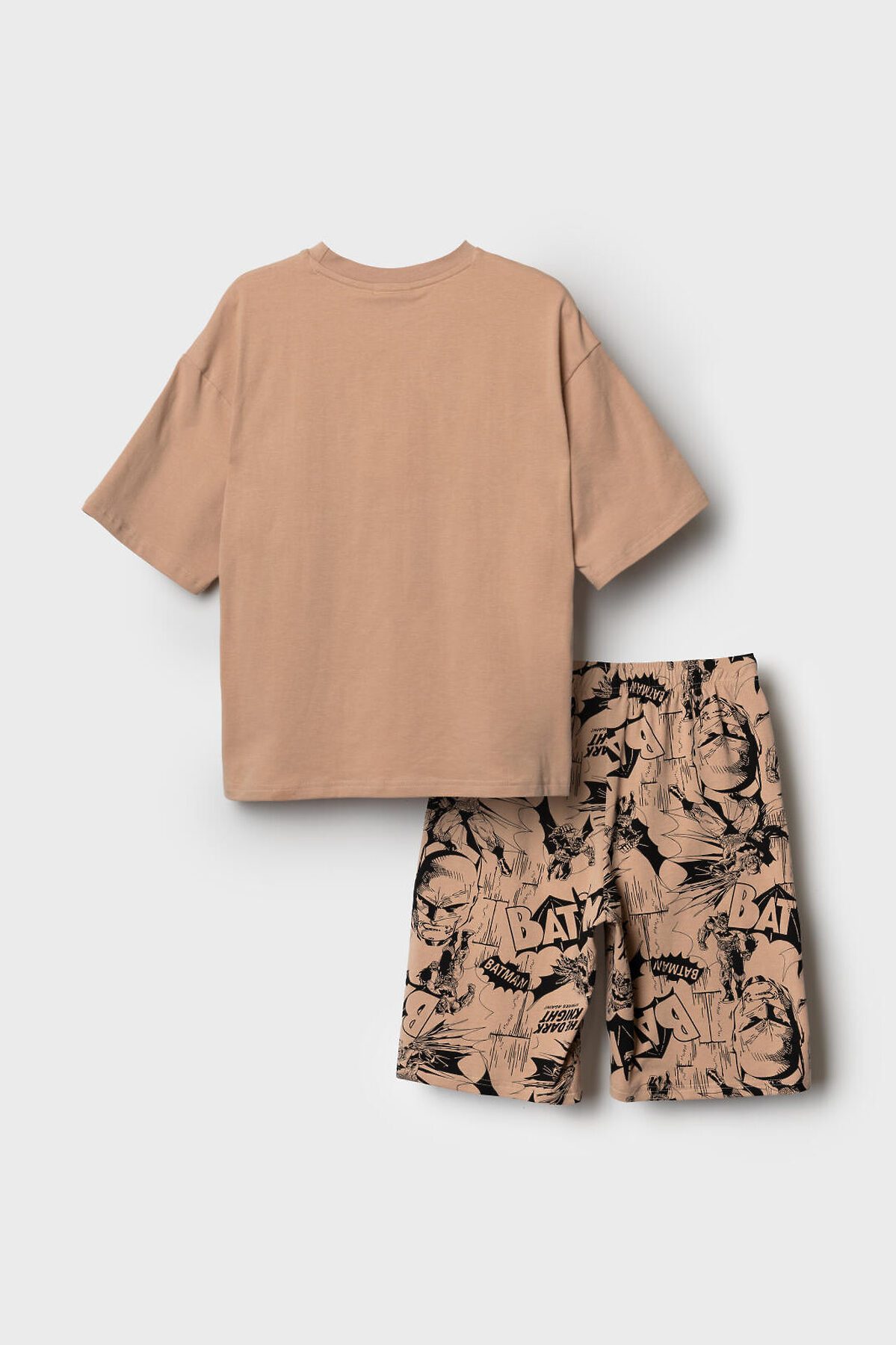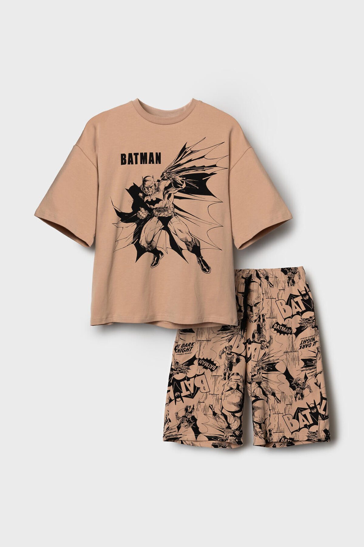 Пижама для мальчика подростка. В набор входят оверсайз футболка с коротким рукавом и шорты. Футболка выполнена украшена крупным черным принтом с изображением Бэтмена и логотипом. Шорты выполнены с принтами в стиле комикса. У шорт эластичный пояс с дополнительной регулировкой на шнурке. Боковые карманы. Материал - мягкий, хлопковый трикотаж.