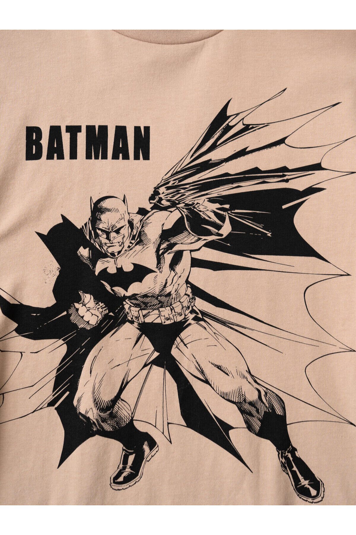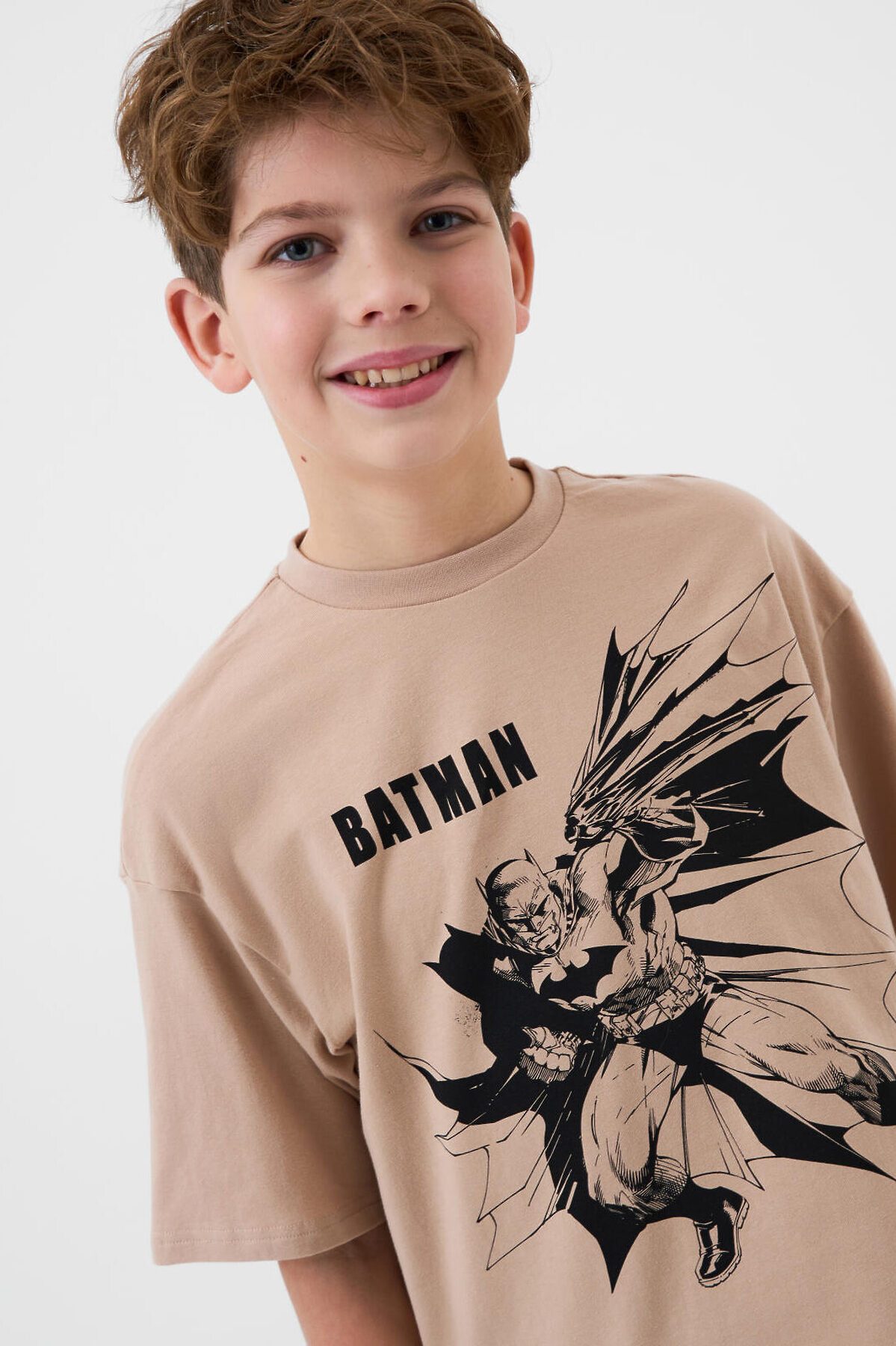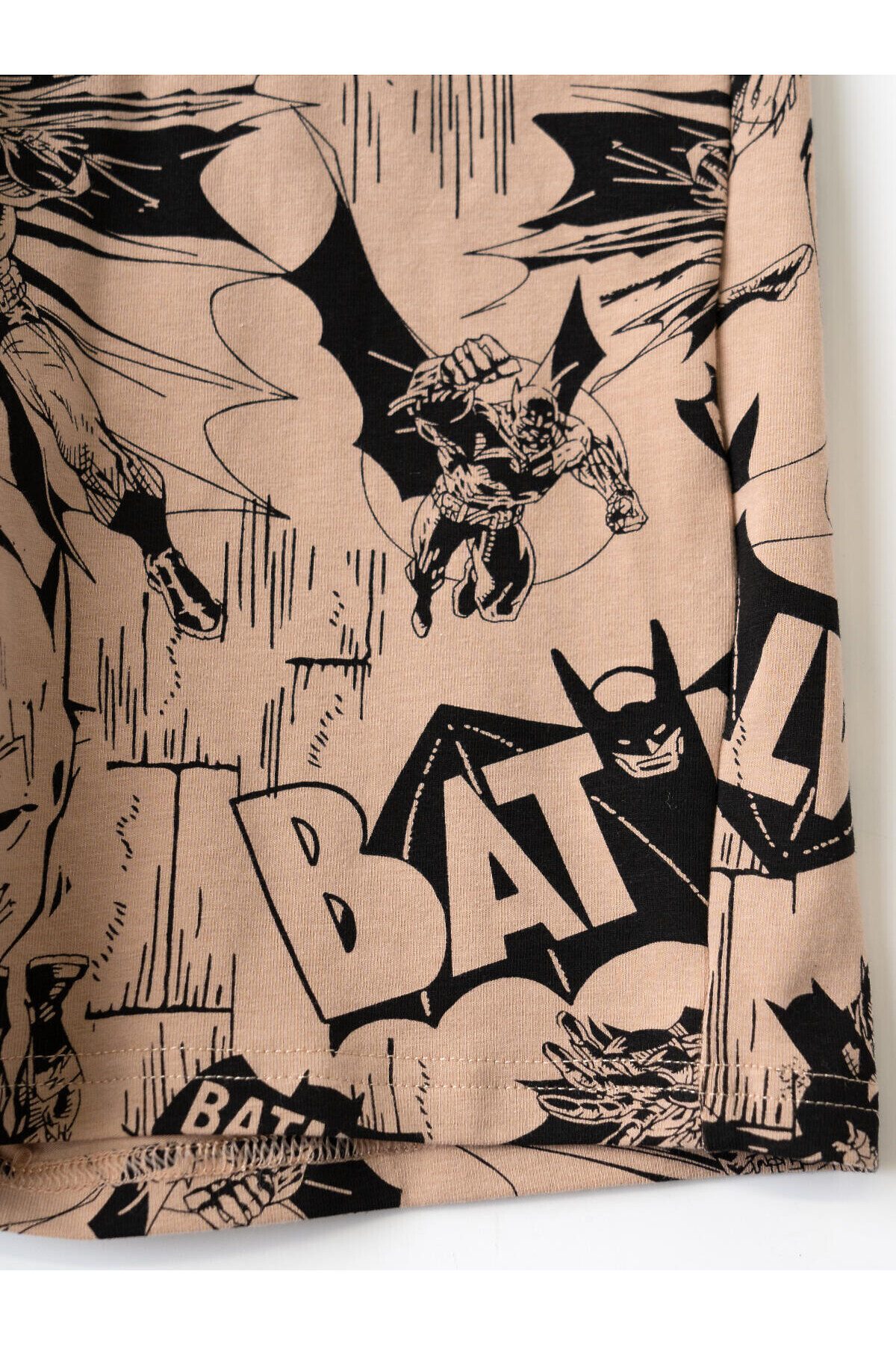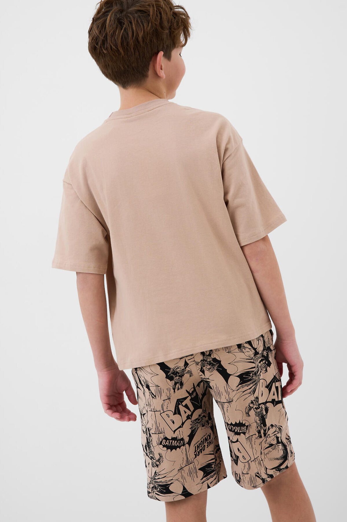 Пижама для мальчика подростка. В набор входят оверсайз футболка с коротким рукавом и шорты. Футболка выполнена украшена крупным черным принтом с изображением Бэтмена и логотипом. Шорты выполнены с принтами в стиле комикса. У шорт эластичный пояс с дополнительной регулировкой на шнурке. Боковые карманы. Материал - мягкий, хлопковый трикотаж.