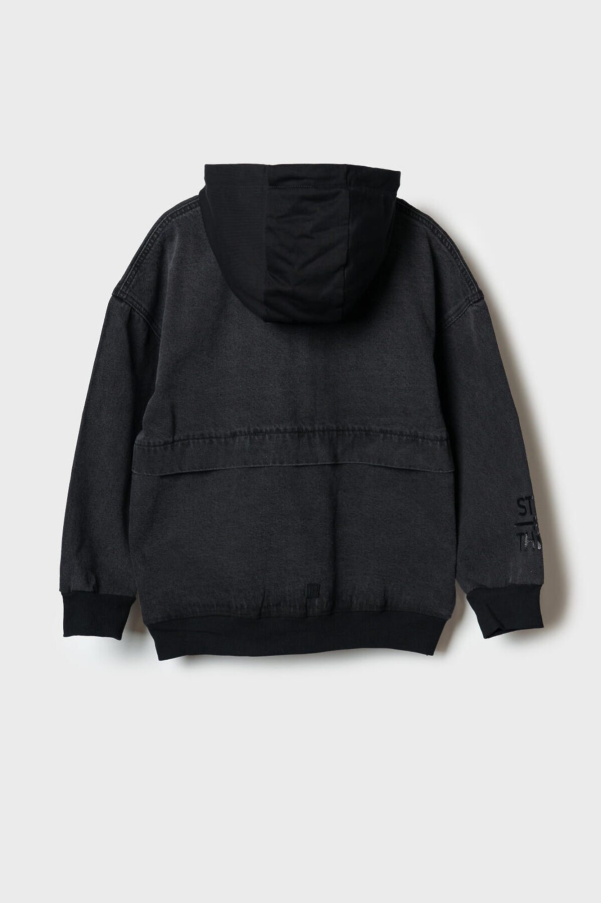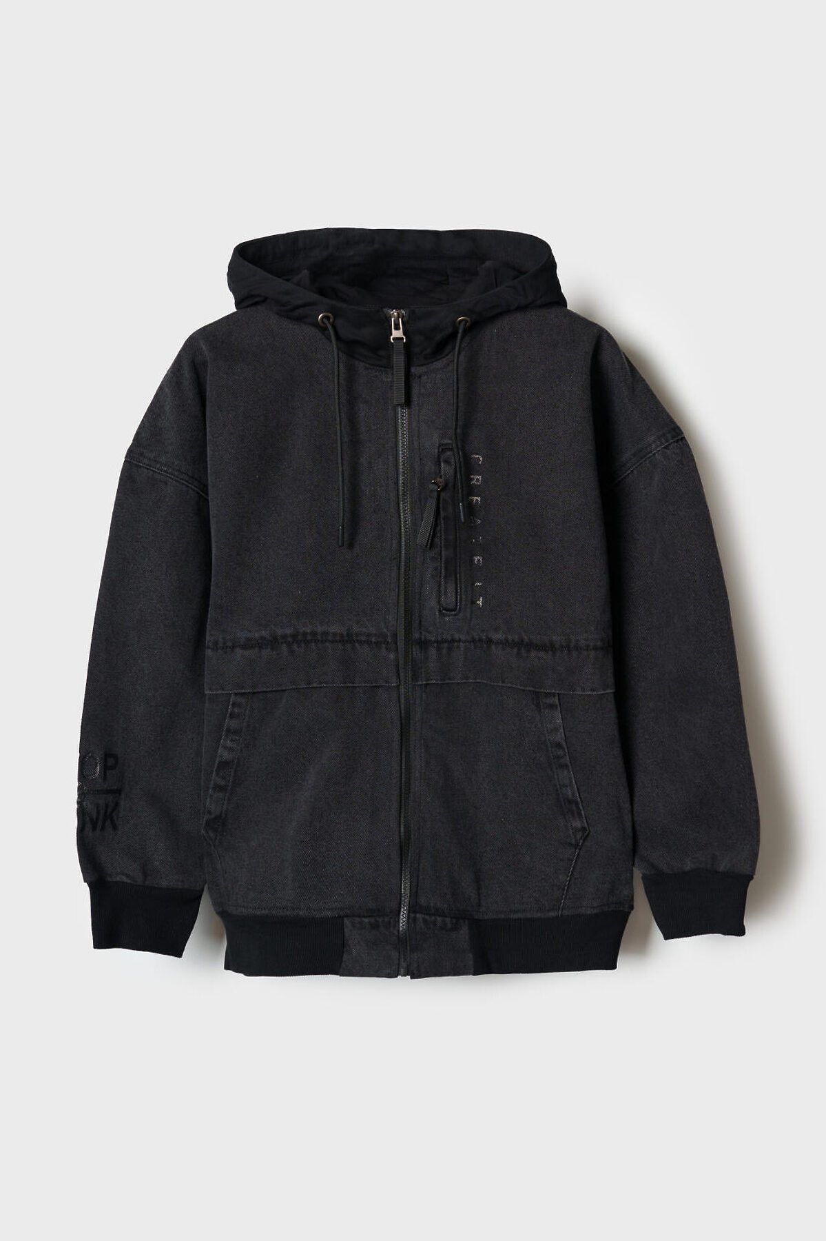 Джинсовая легкая куртка свободного кроя с удлиненным рукавом и капюшоном для мальчика подростка. Бомбер оверсайз джинсовый выполнен в графитовом оттенке с чёрными акцентами на капюшоне и манжетах. Капюшон регулируется шнурком. Спереди — застежка на молнию, два удобных кармана и вертикальный принт. На правом рукаве расположен дополнительный принт. Светоотражающие элементы на груди и спинке обеспечивают безопасность в темное время суток. Куртка выглядит современно и подходит для повседневного городского образа.