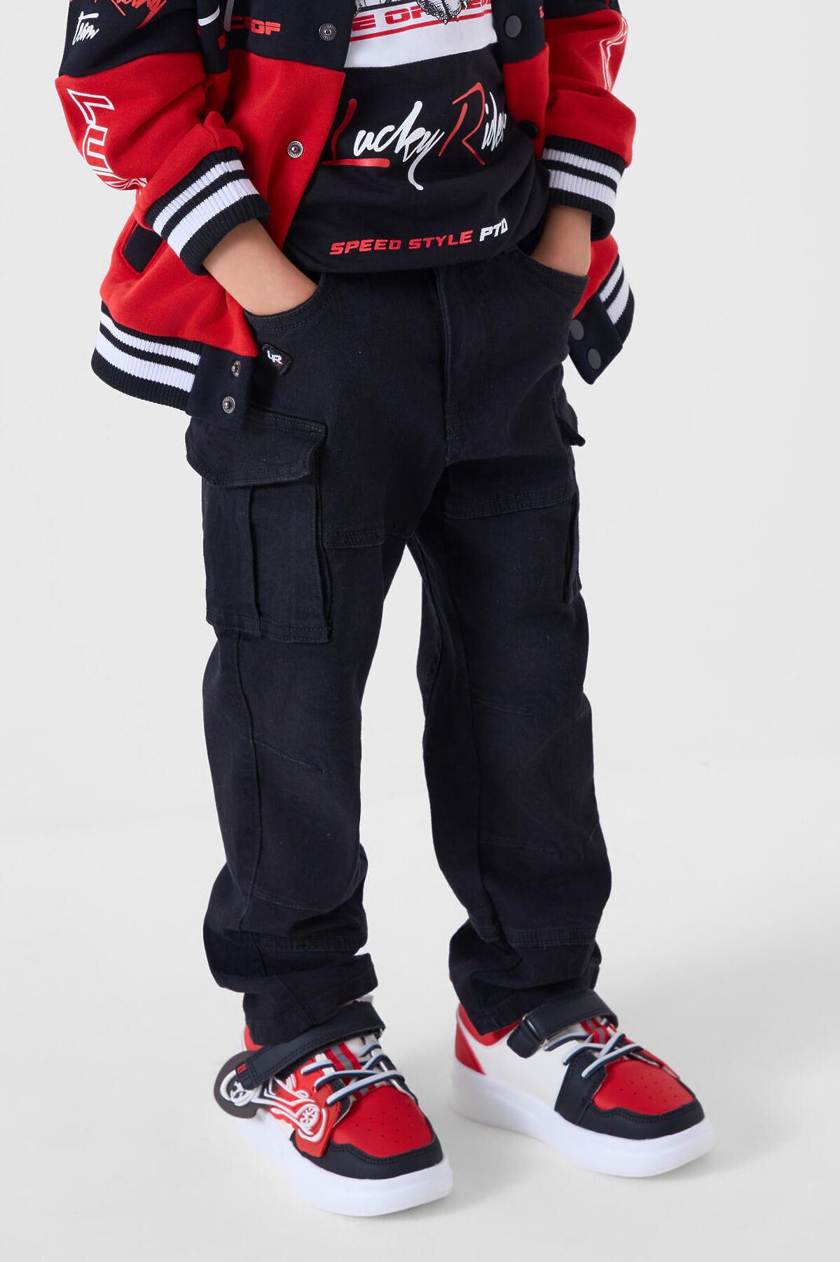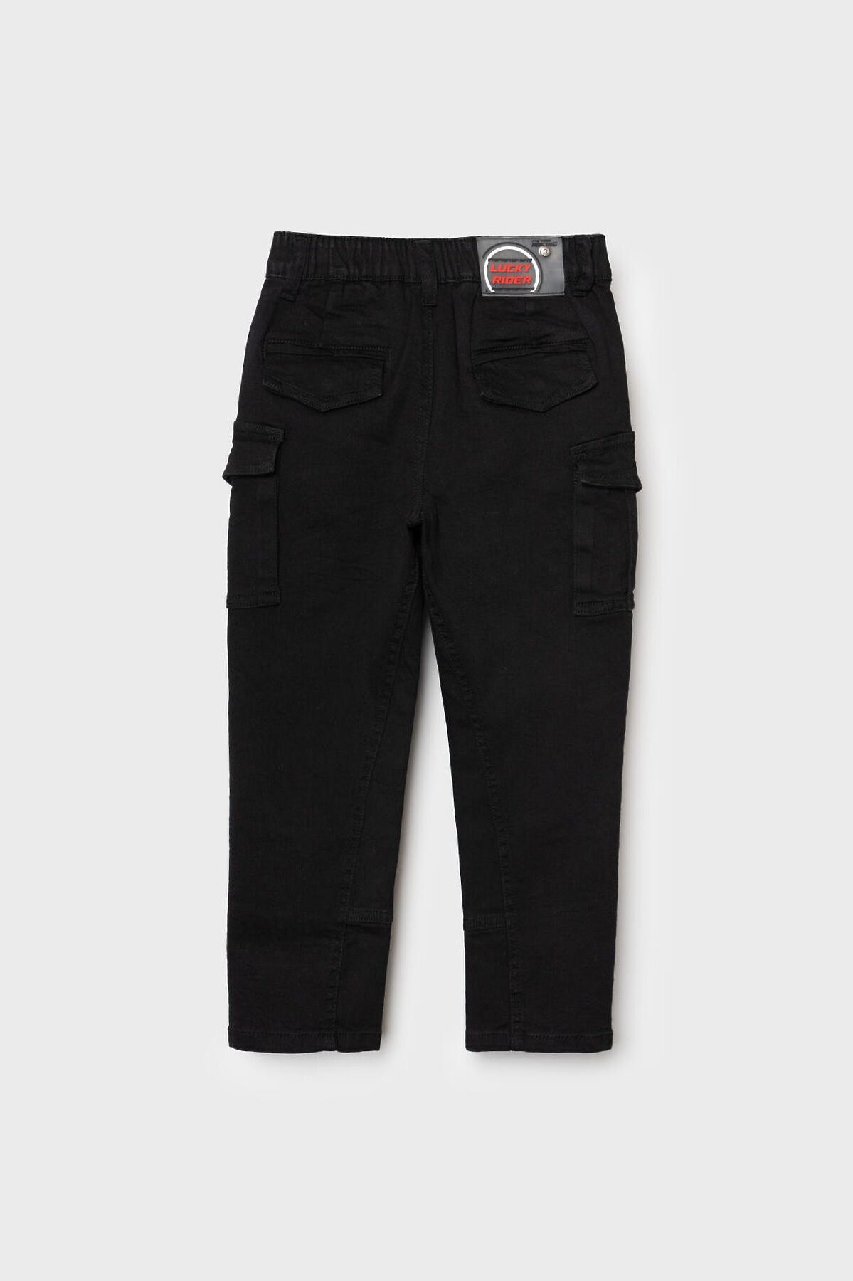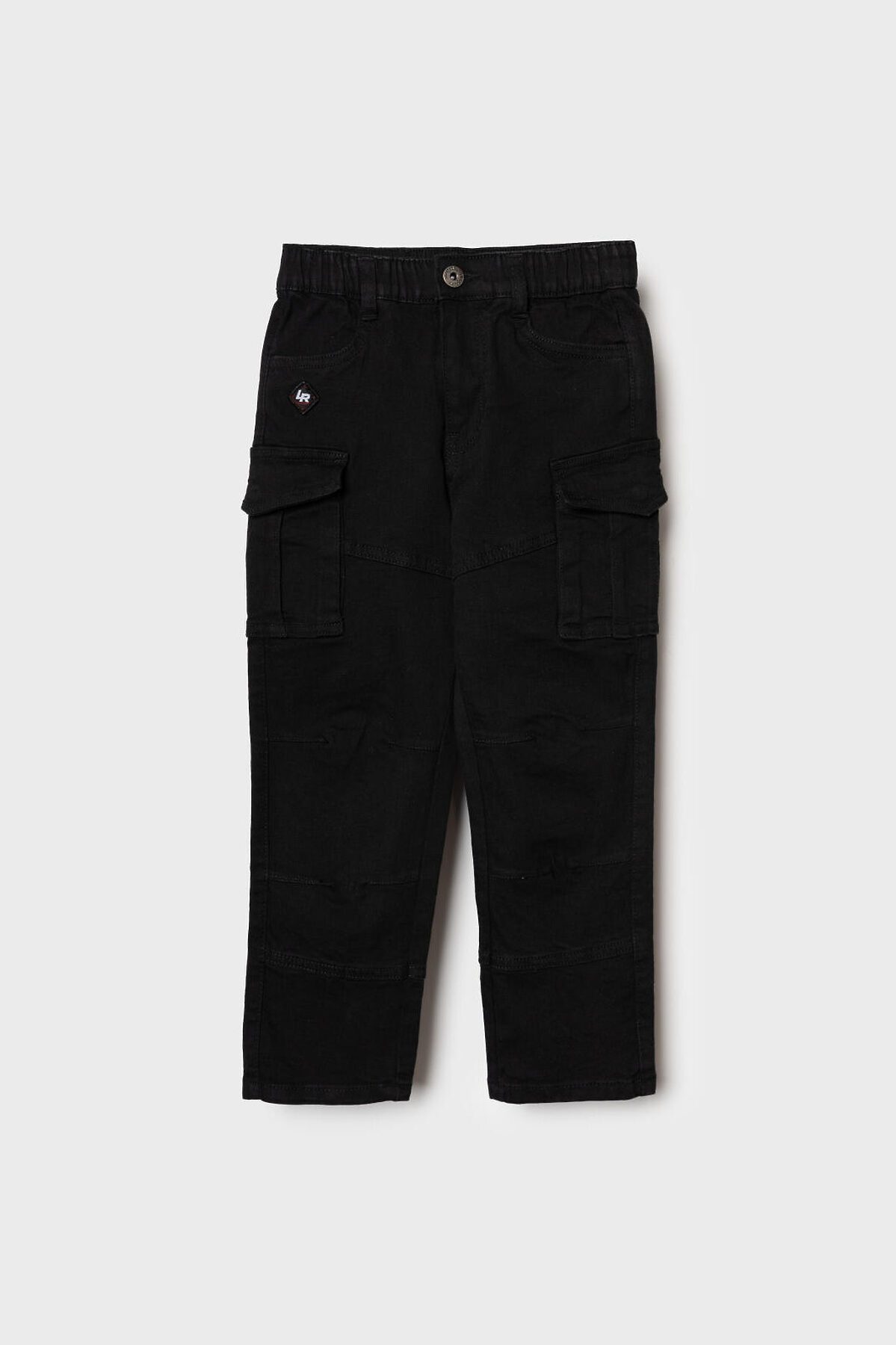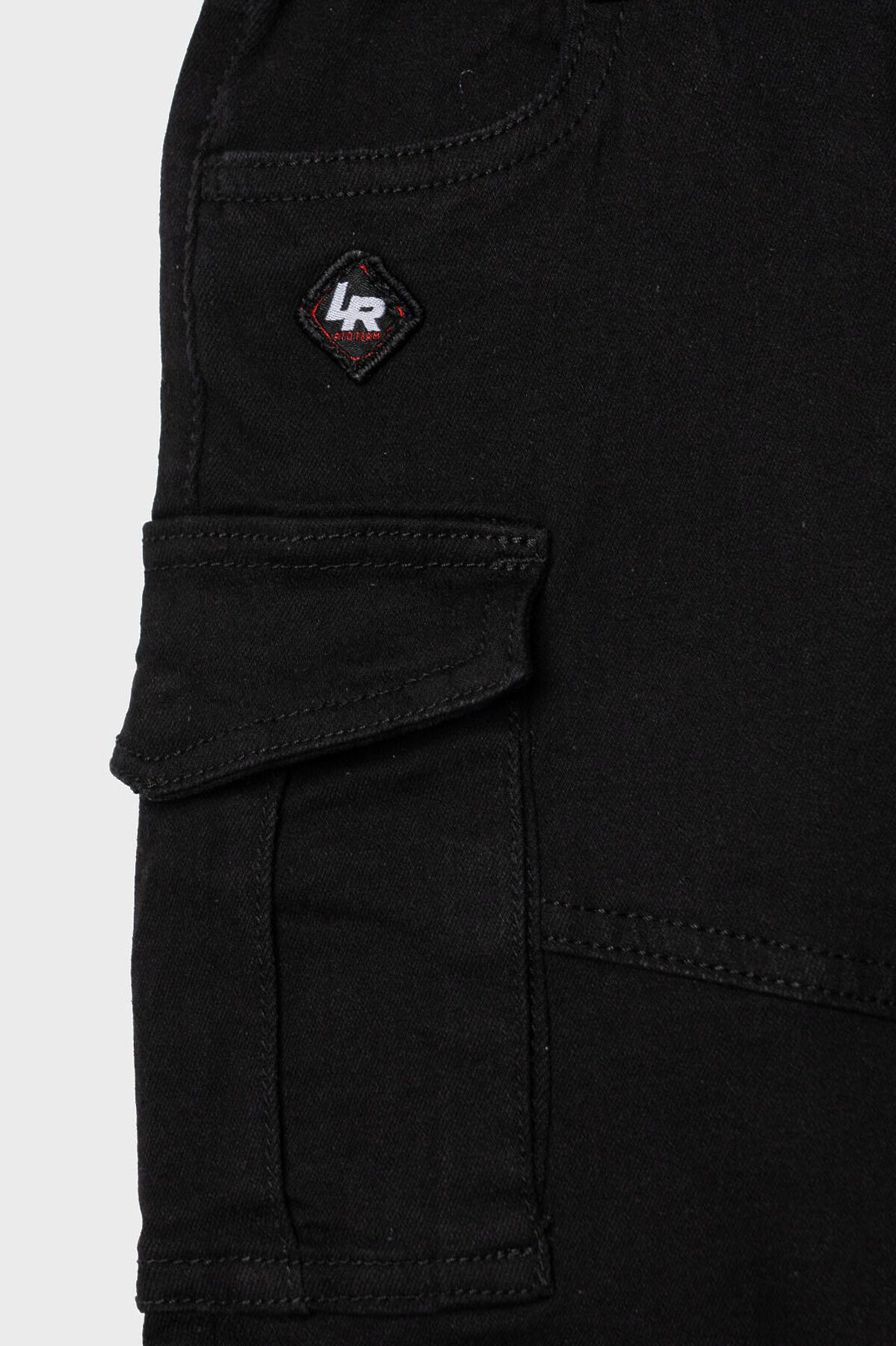 Детские джинсы карго для мальчика. Модель с прямым кроем и средней посадкой, выполненные из плотного денима. В дизайне предусмотрено много карманов: боковые, большие накладные-карго и два на задней части. Основная застёжка — болт и молния, в поясе встроена резинка, а также есть шлёвки под ремень. Карманы на бедрах закрываются на скрытые магнитные кнопки. Спереди есть декоративный шеврон, сзади — текстильная нашивка на поясе.