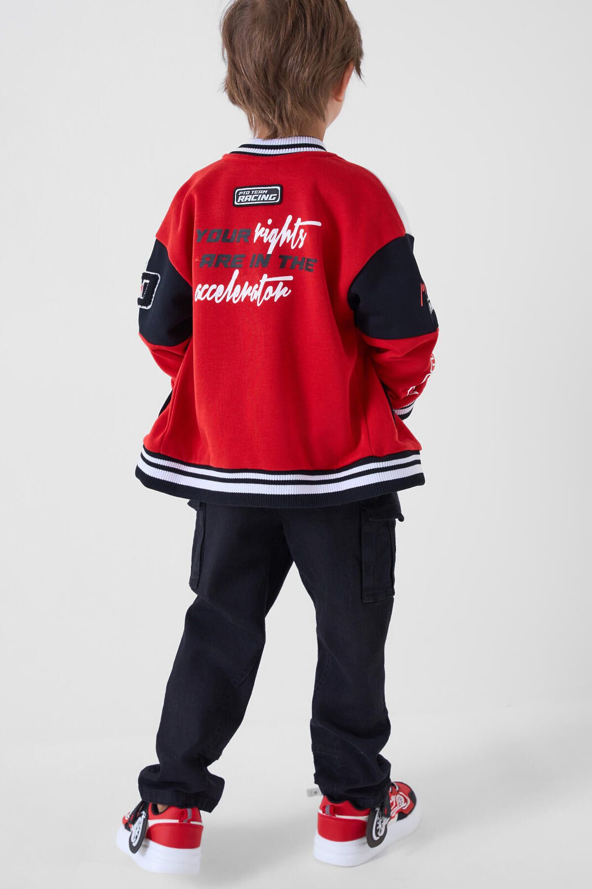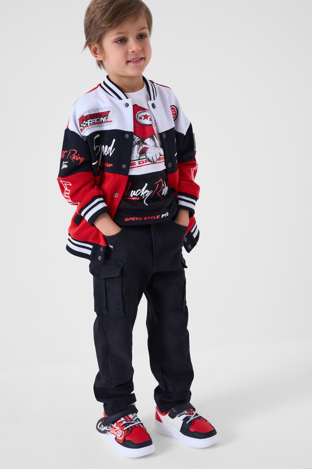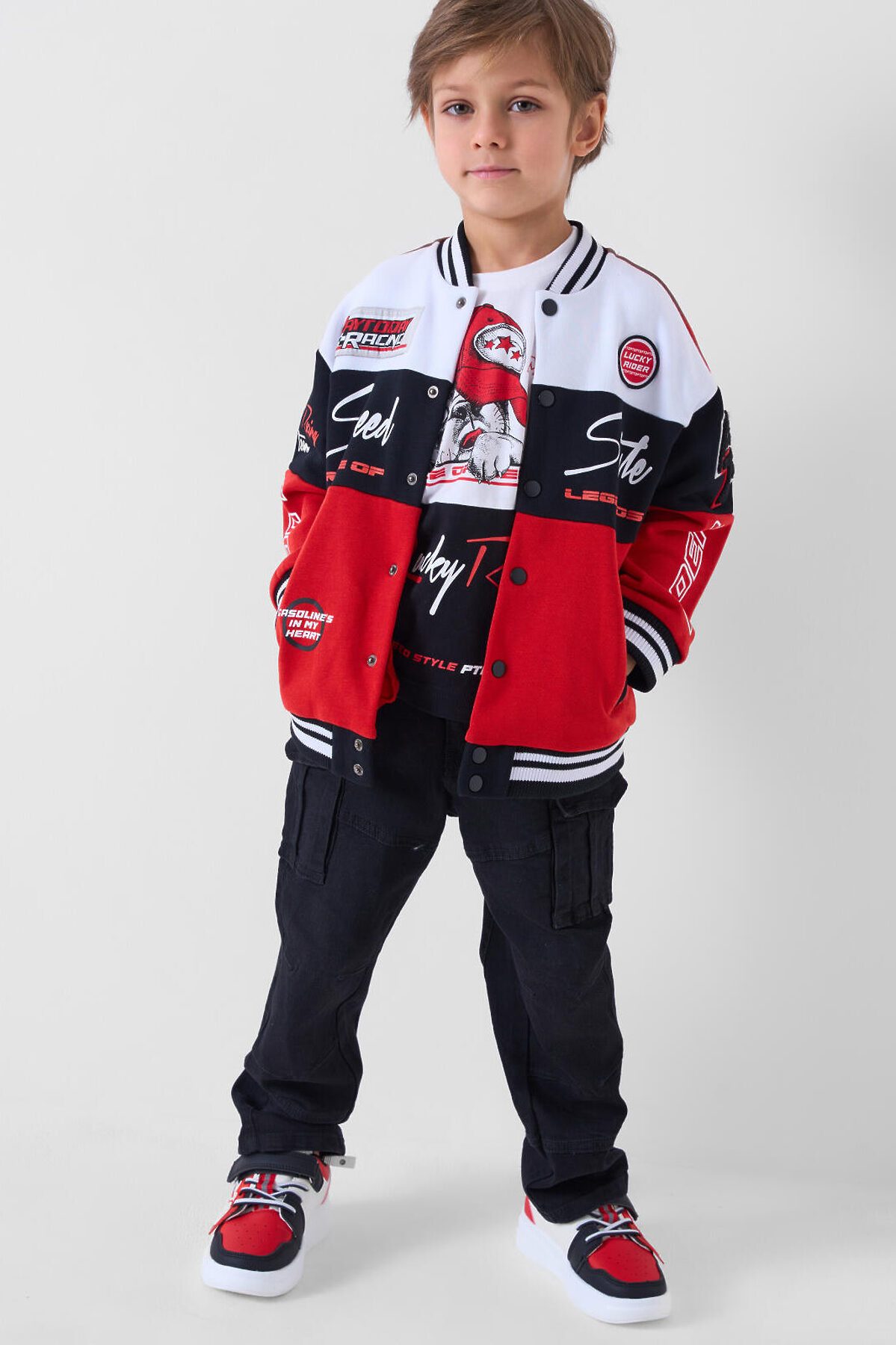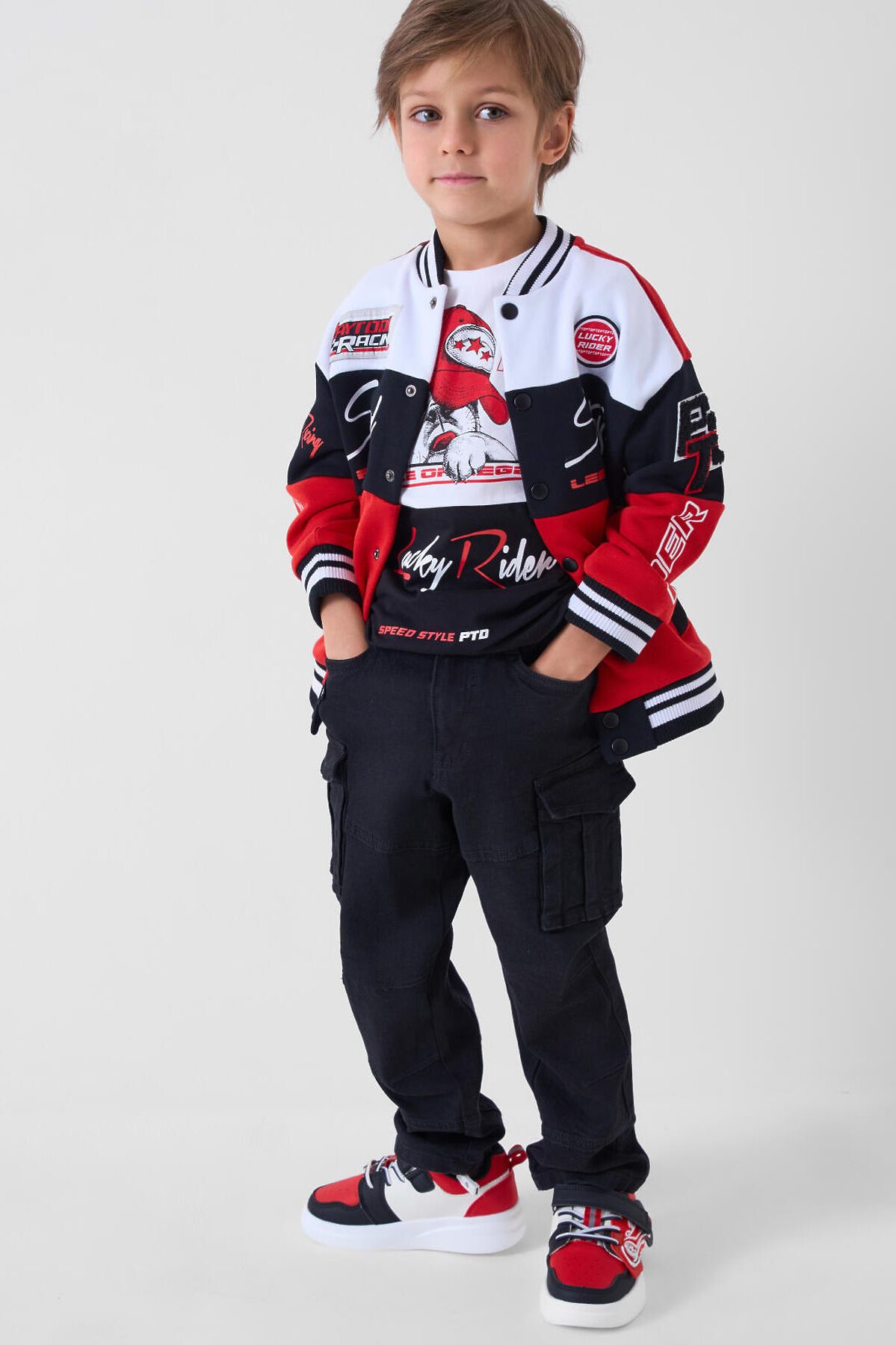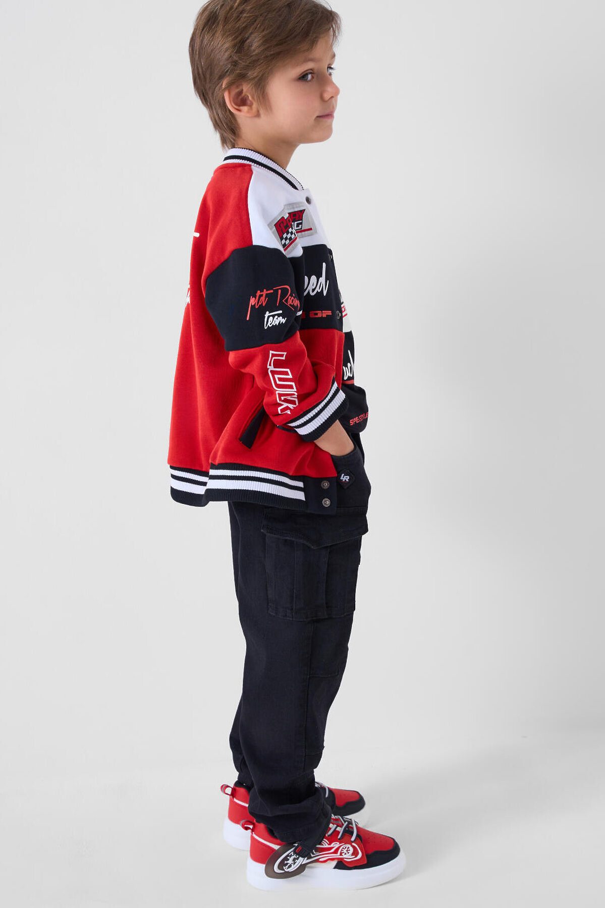 Детские джинсы карго для мальчика. Модель с прямым кроем и средней посадкой, выполненные из плотного денима. В дизайне предусмотрено много карманов: боковые, большие накладные-карго и два на задней части. Основная застёжка — болт и молния, в поясе встроена резинка, а также есть шлёвки под ремень. Карманы на бедрах закрываются на скрытые магнитные кнопки. Спереди есть декоративный шеврон, сзади — текстильная нашивка на поясе.