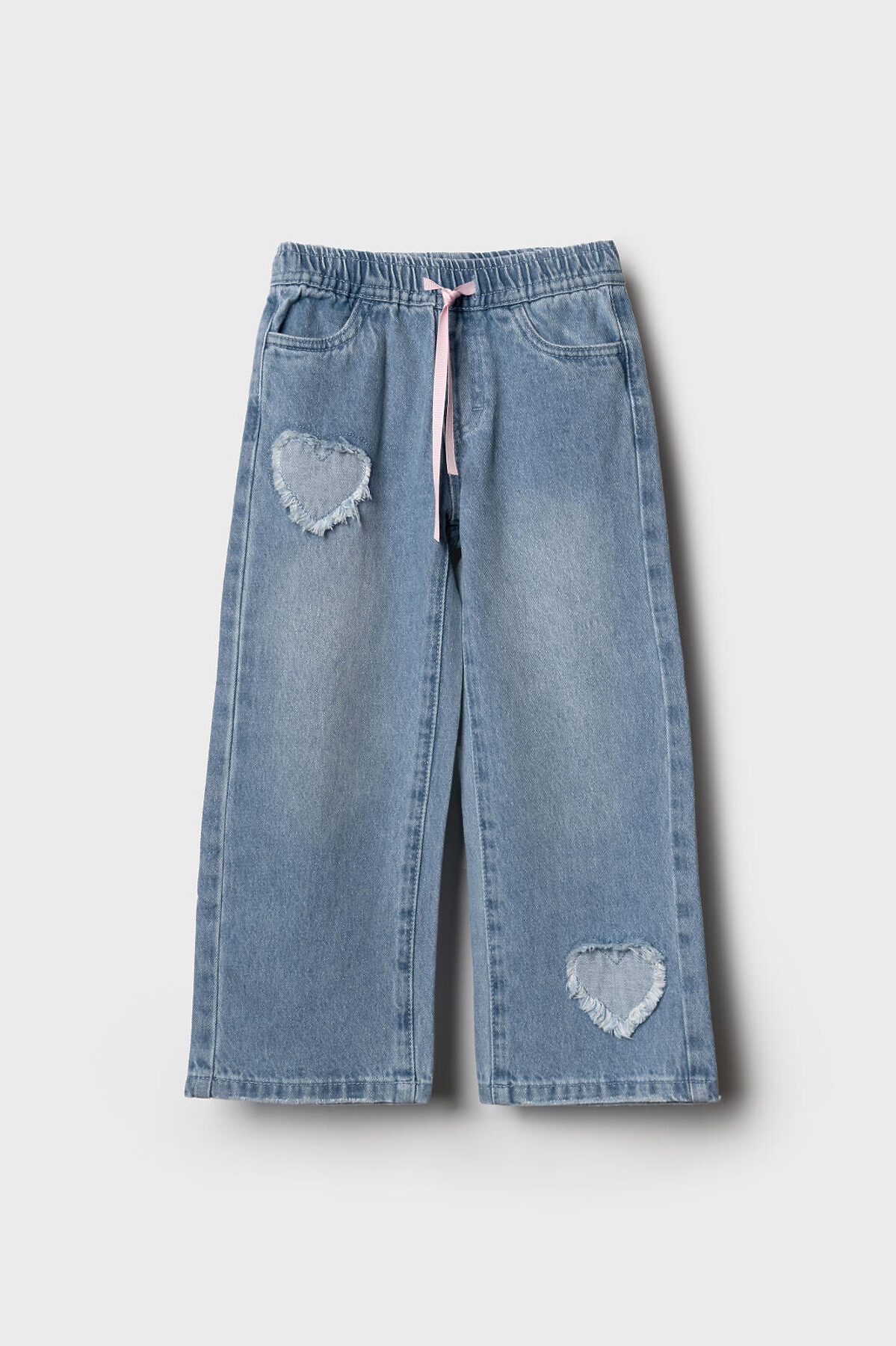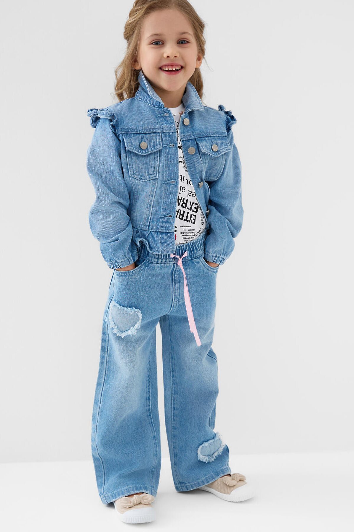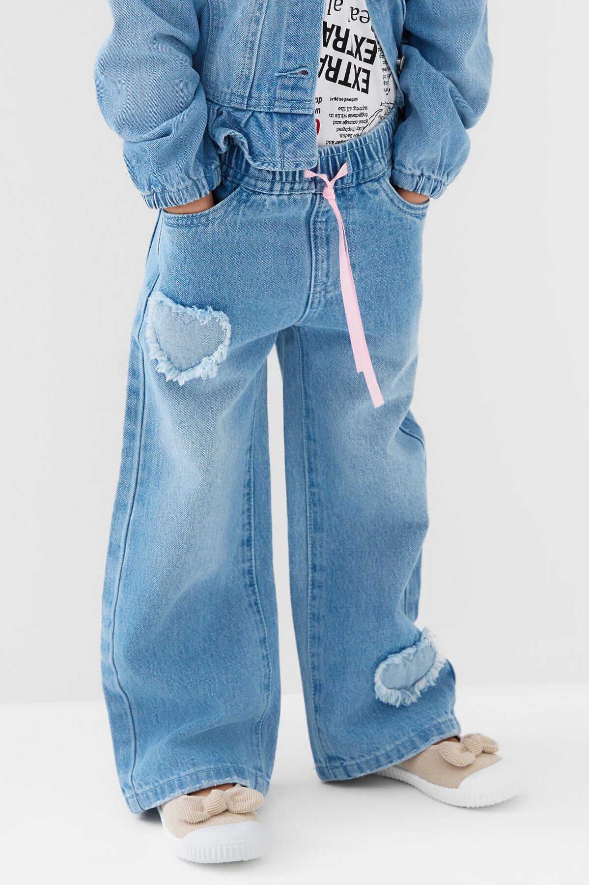 Детские джинсы для девочки. Пояс на мягкой резинке с декоративным бантом из розовой ленты. Модель прямого кроя, свободная с длиной до щиколотки. Спереди есть два удобных кармана, сзади — два накладных кармана.