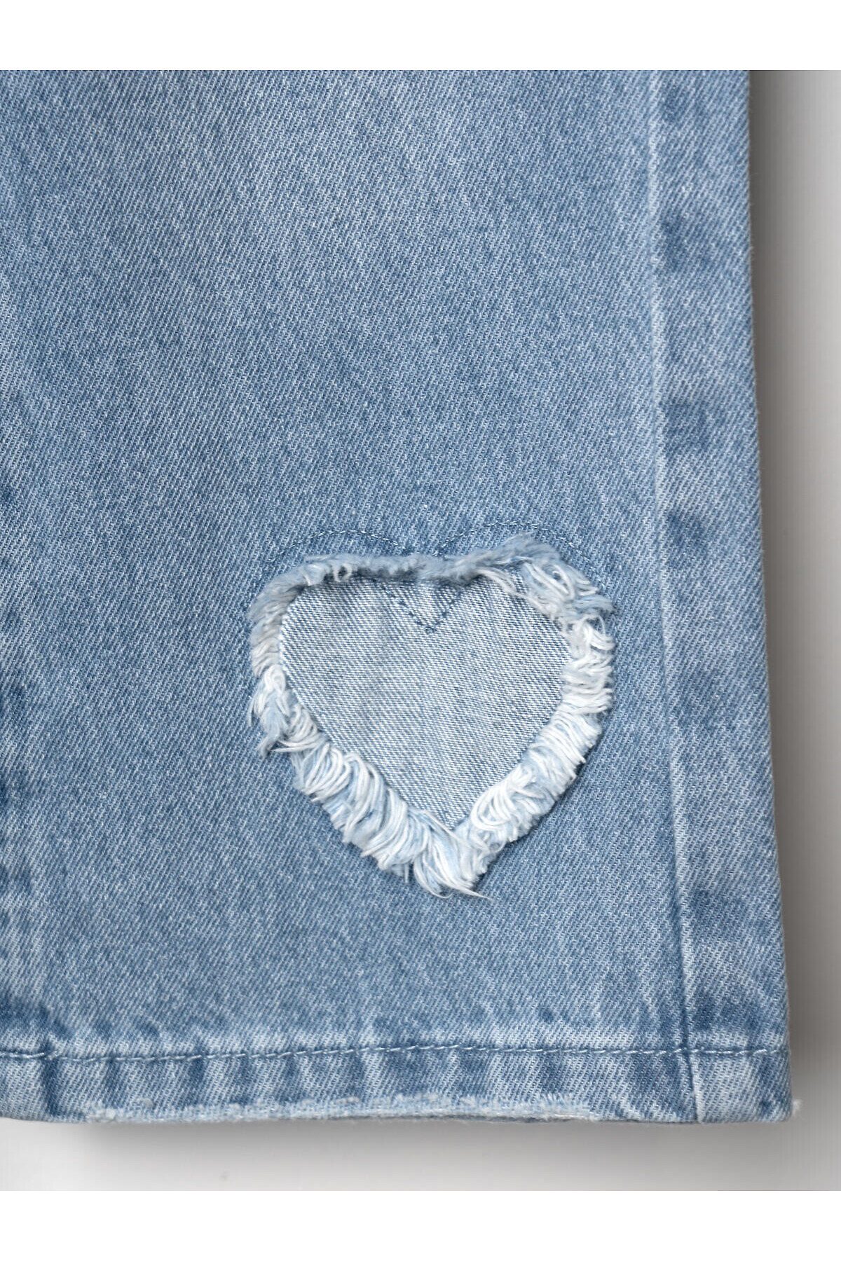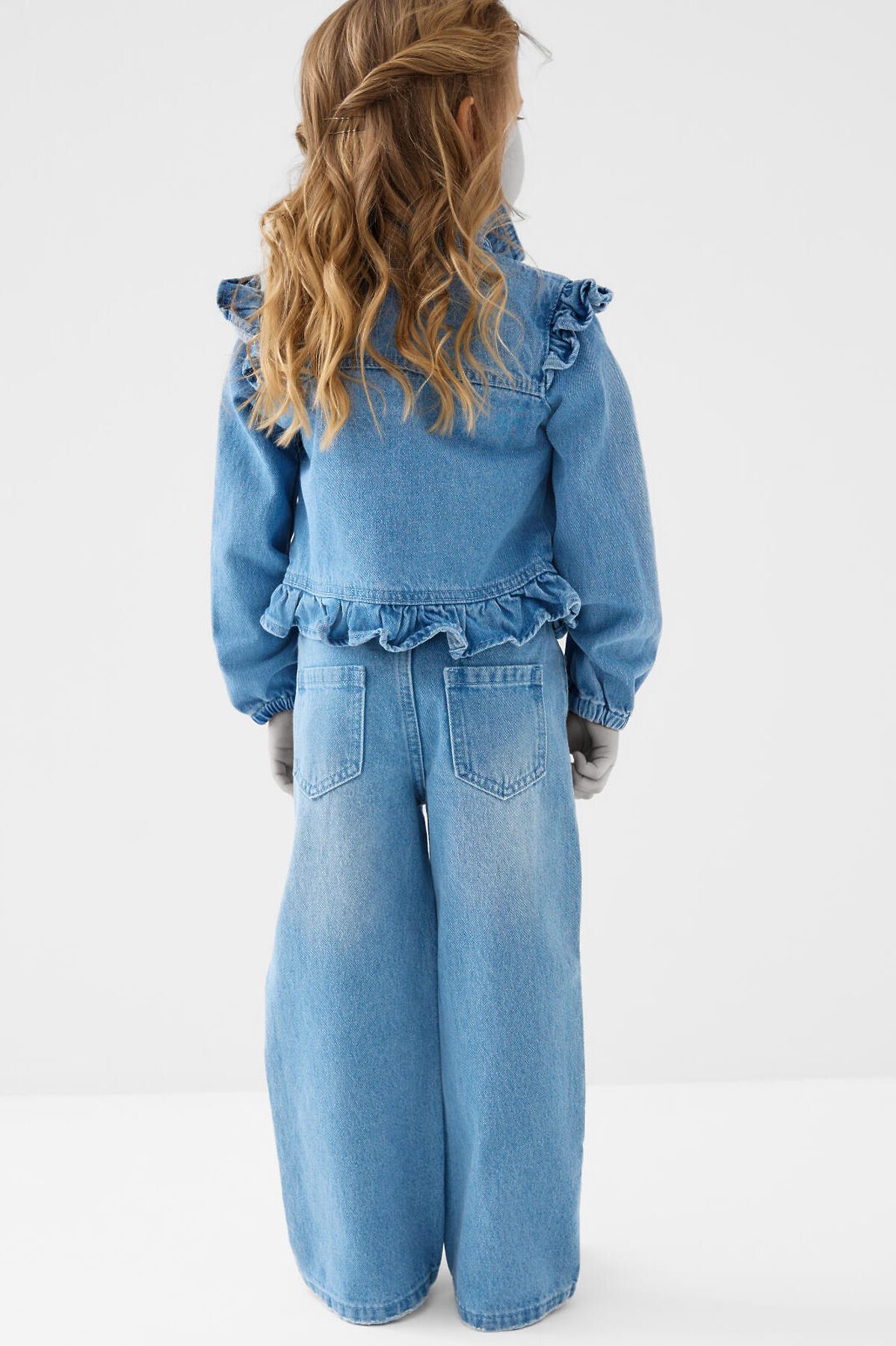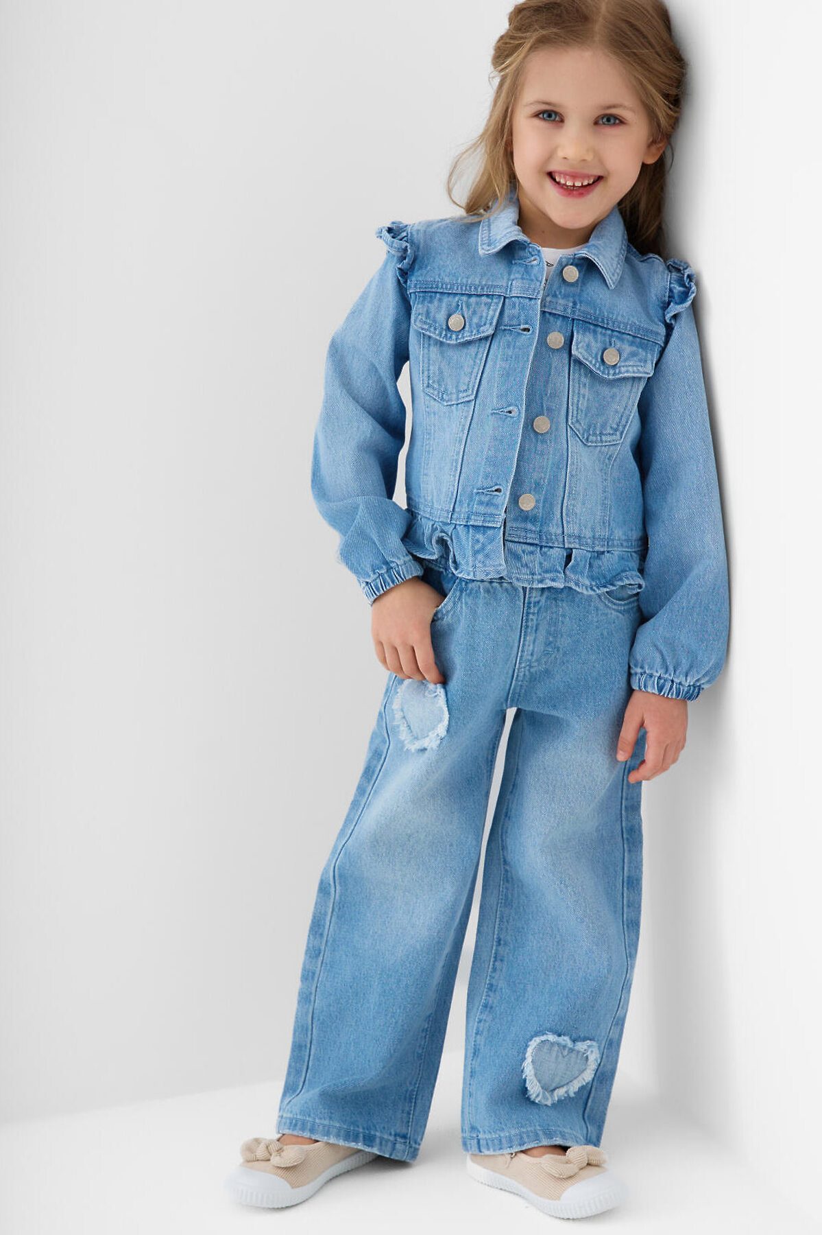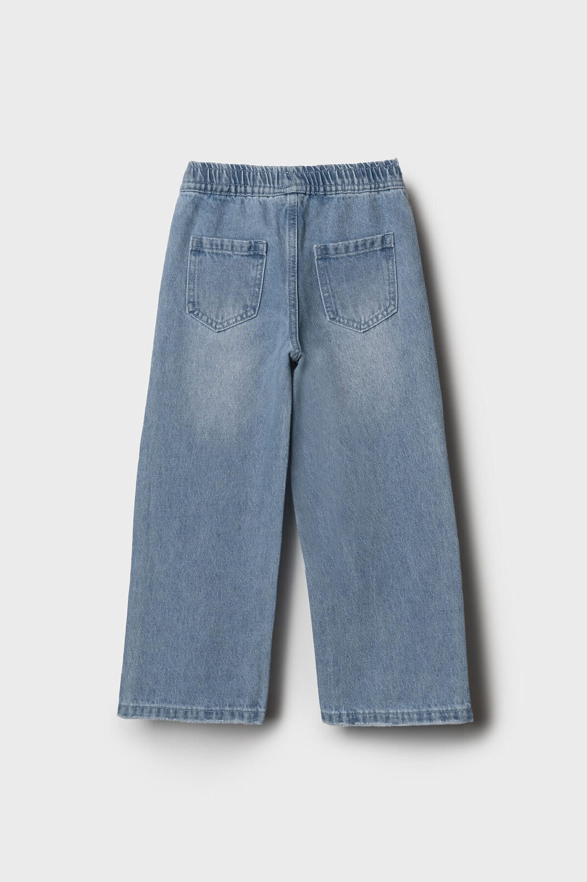 Детские джинсы для девочки. Пояс на мягкой резинке с декоративным бантом из розовой ленты. Модель прямого кроя, свободная с длиной до щиколотки. Спереди есть два удобных кармана, сзади — два накладных кармана.