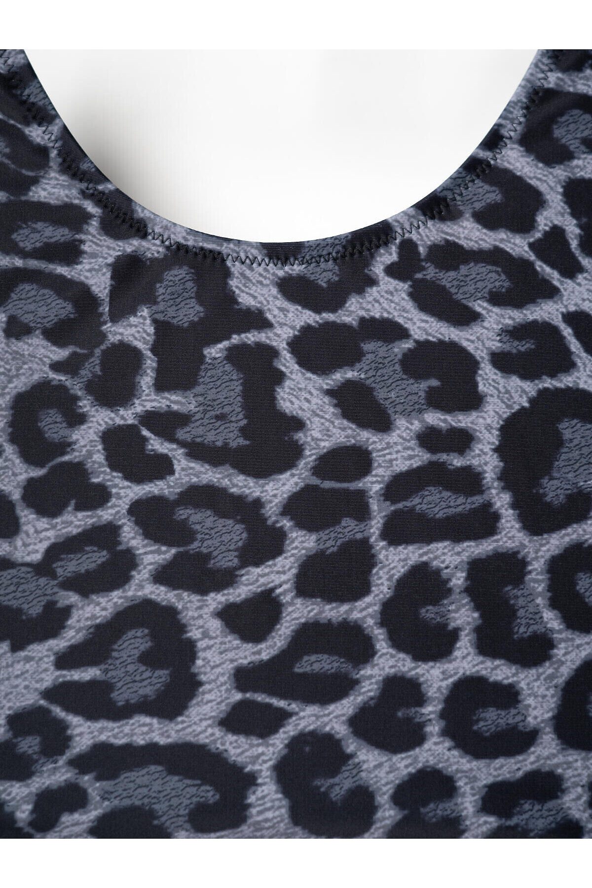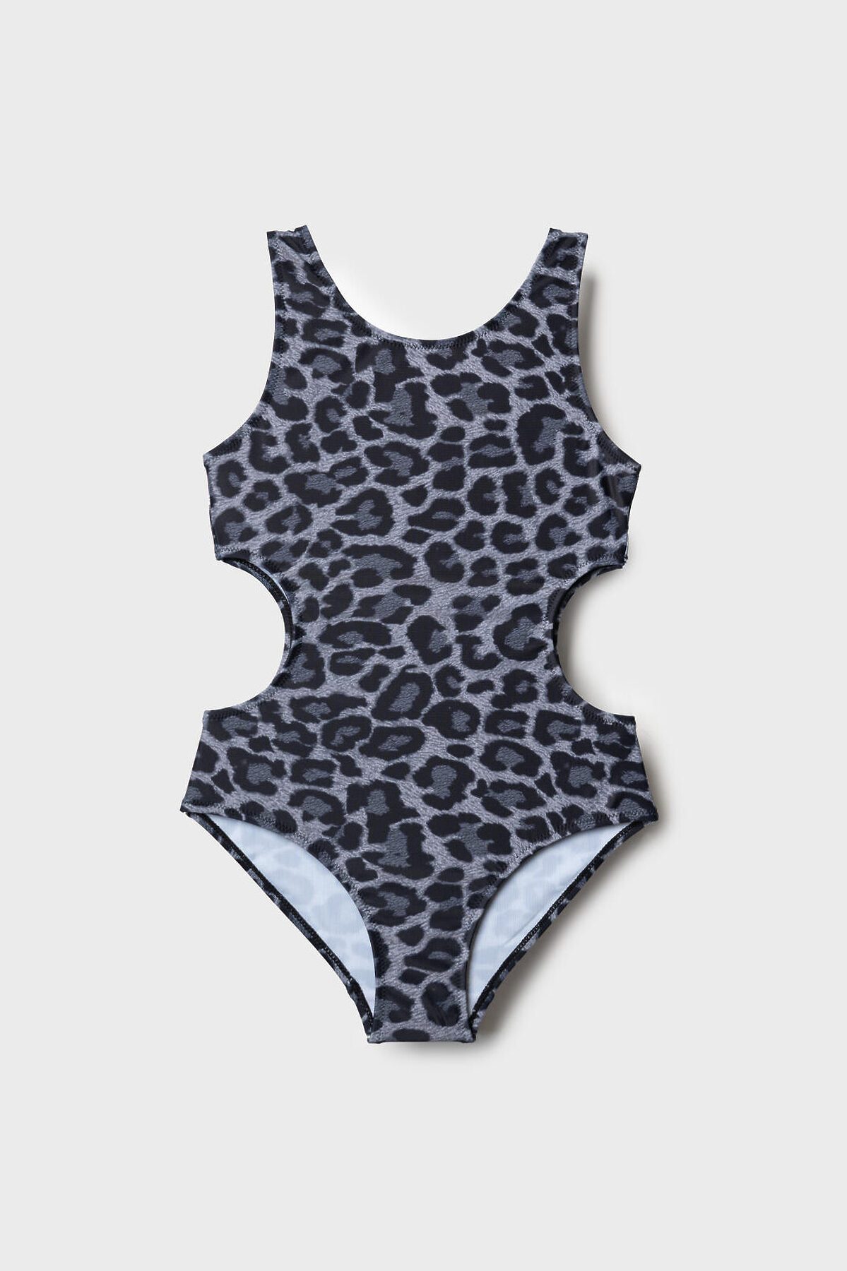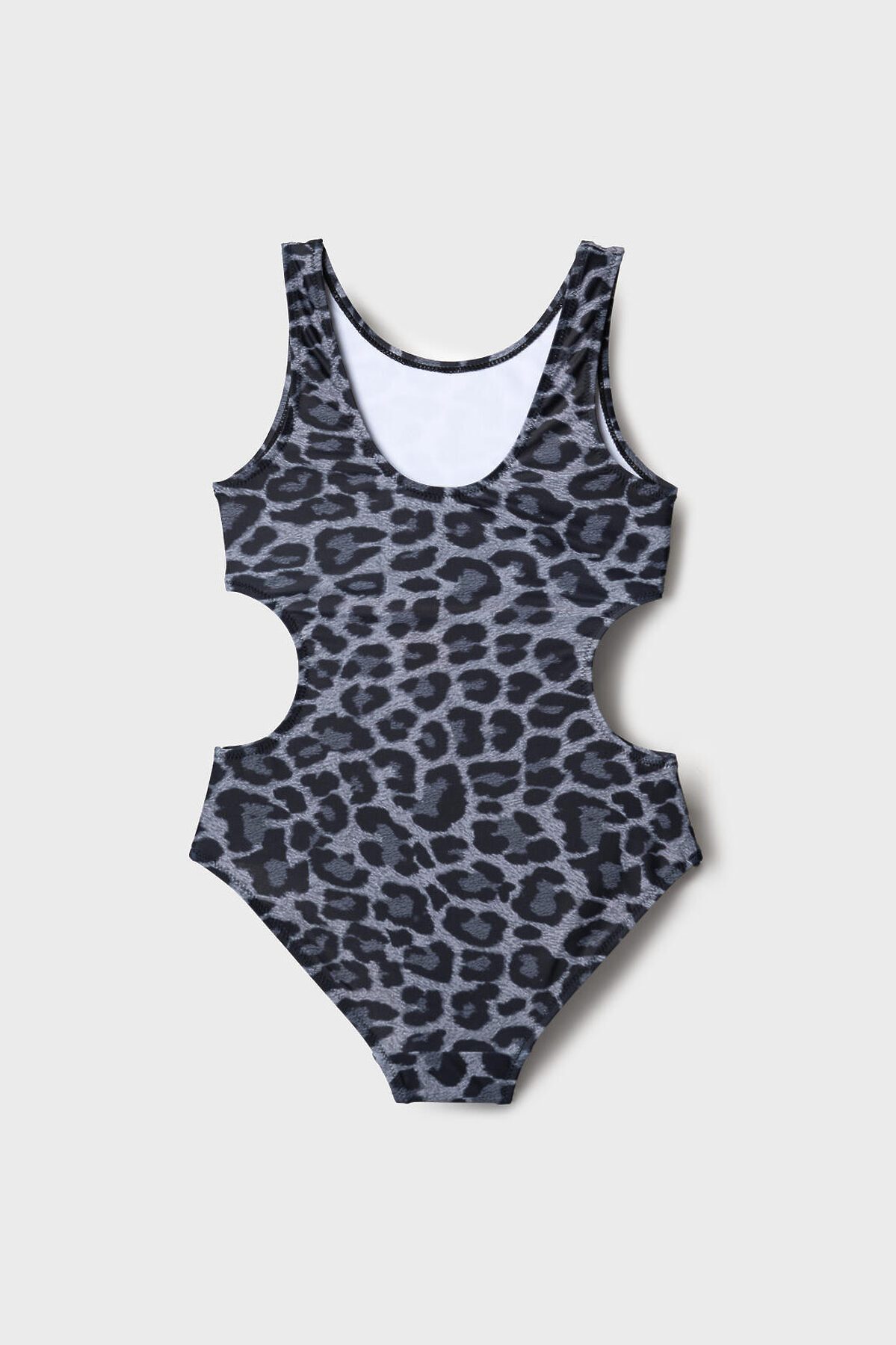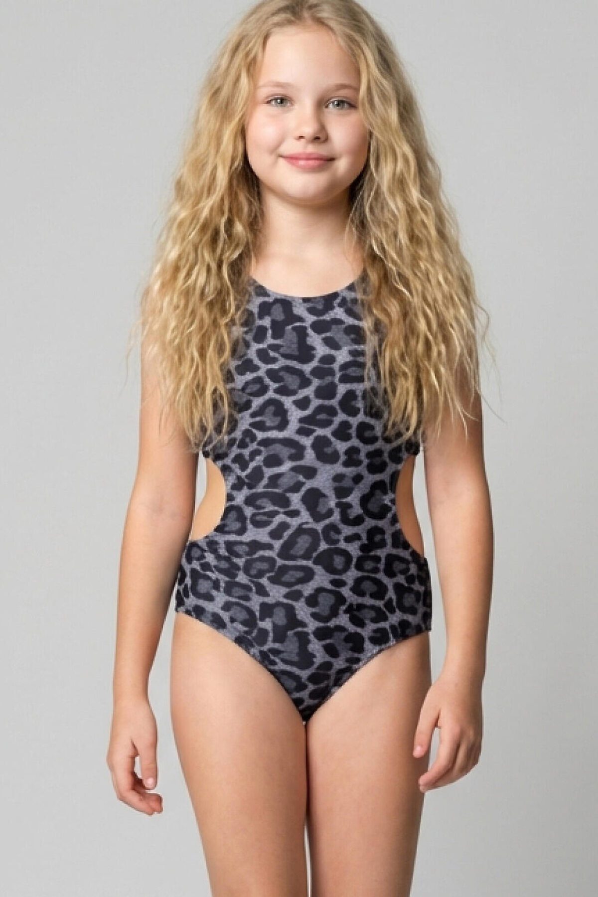 Слитный купальник для девочки подростка. Необычный дизайн с глубокими вырезами по бокам и открытой спиной. Он выполнен из эластичного материала с эффектным леопардовым принтом в серо-черной гамме. Внутри на подкладке — в зоне переда и ластовицы. Съемные чаши. Все края обработаны эластичной лентой для комфортной посадки. Купальник удобен и эффектен, отлично подойдет для отдыха и плавания.