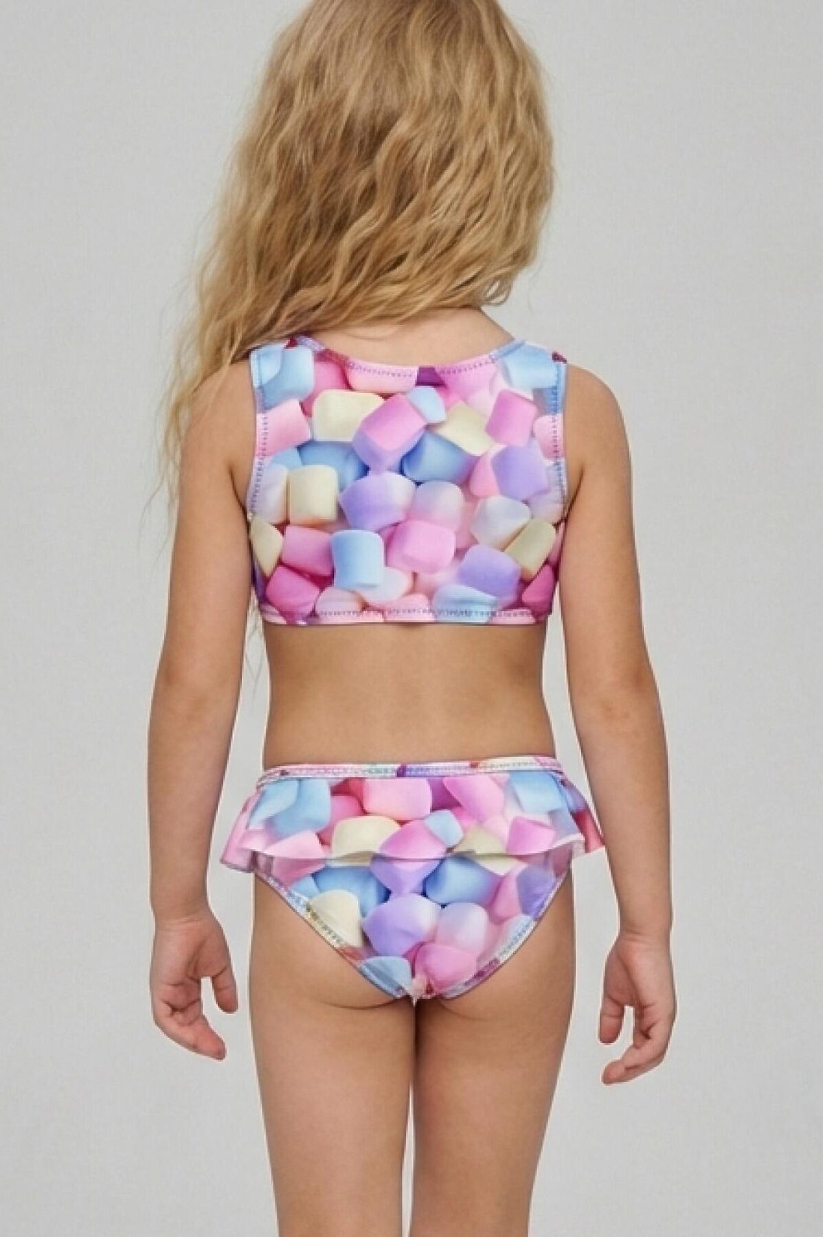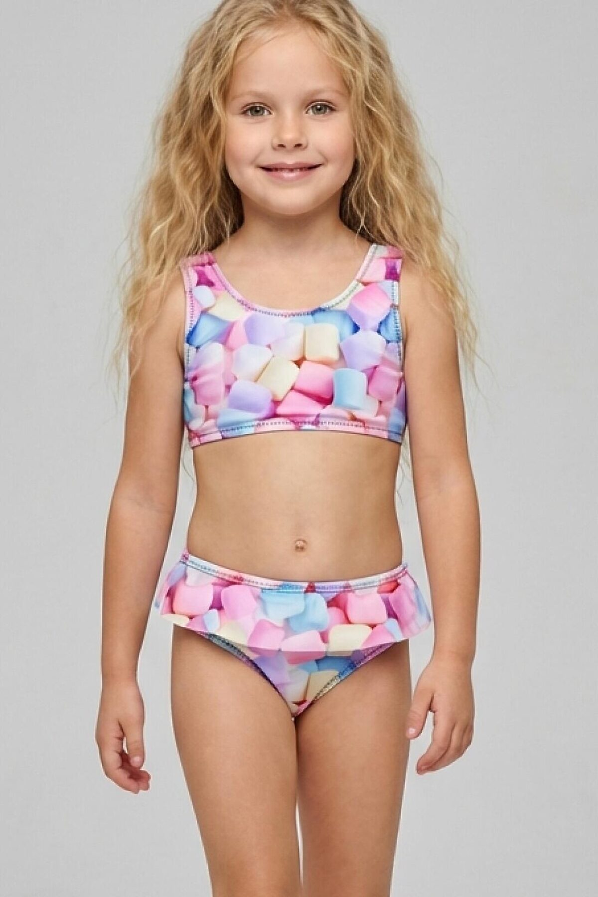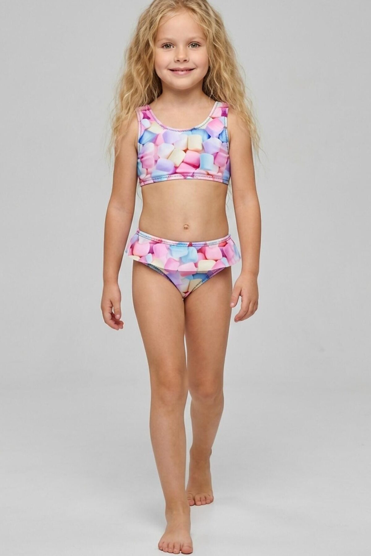 Купальник детский раздельный для девочки. Верх имеет круглый вырез и плотно прилегает к телу, а плавки средней посадки украшены оборкой по поясу. Яркий фотопринт с изображением разноцветного маршмеллоу делает изделие особенно привлекательным и веселым. Внутри предусмотрена подкладка. Все края обработаны эластичной тесьмой, чтобы изделие хорошо сидело на теле и не натирало. Благодаря UF-защите, ткань сохраняет первоначальный вид даже при длительном пребывании на солнце. Подходит для плавания и активного отдыха.
