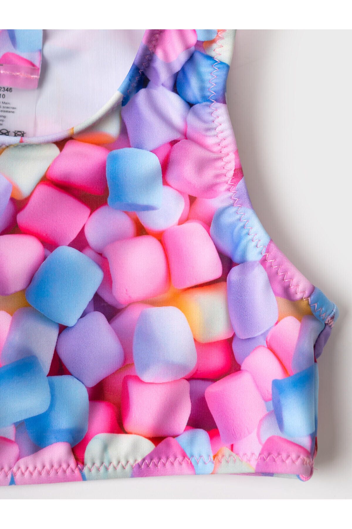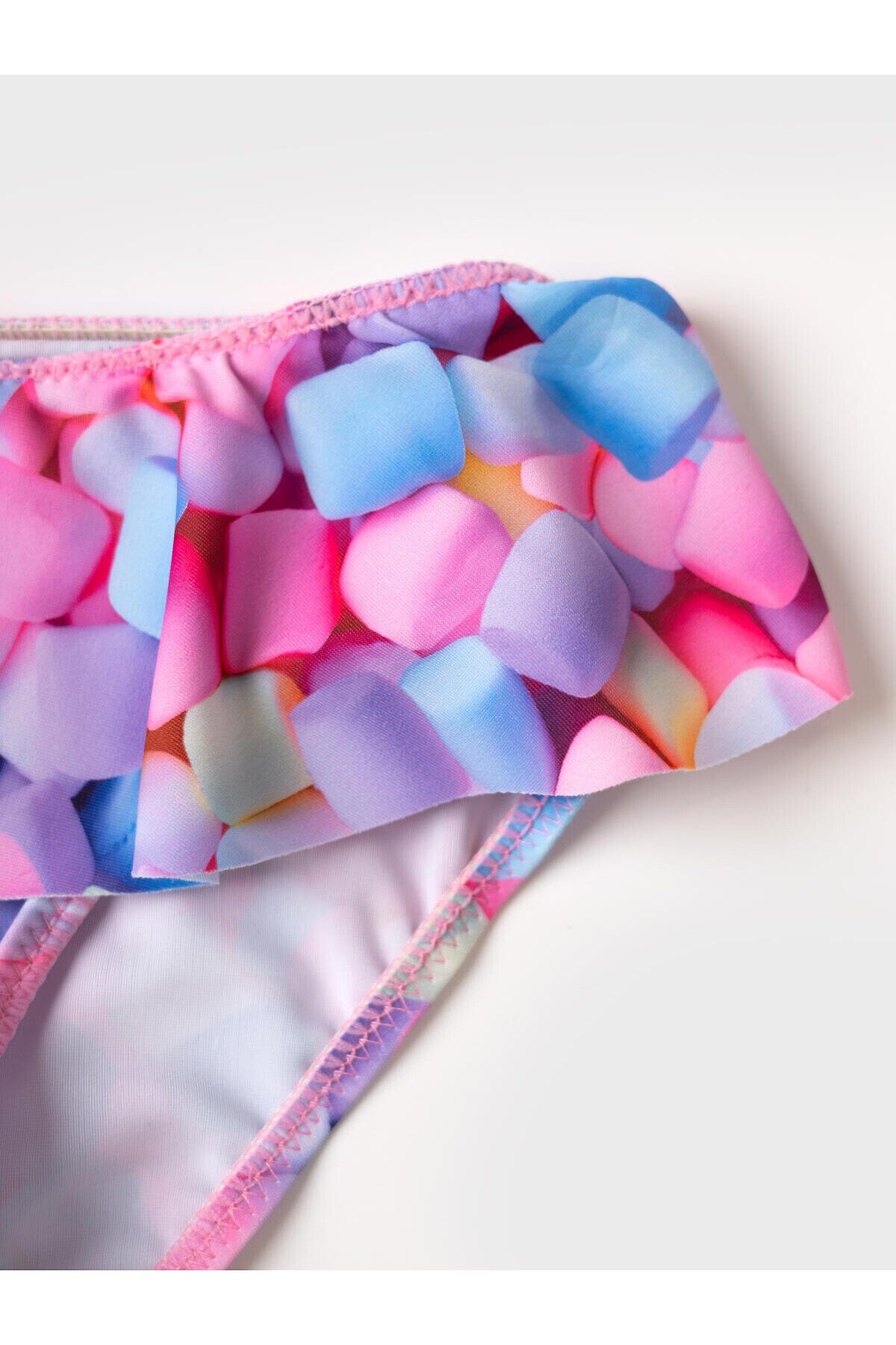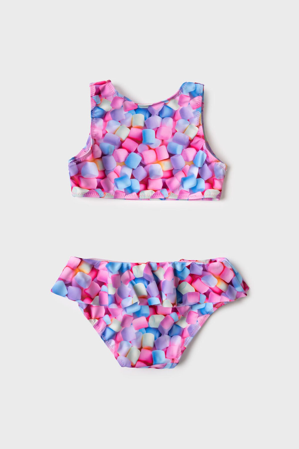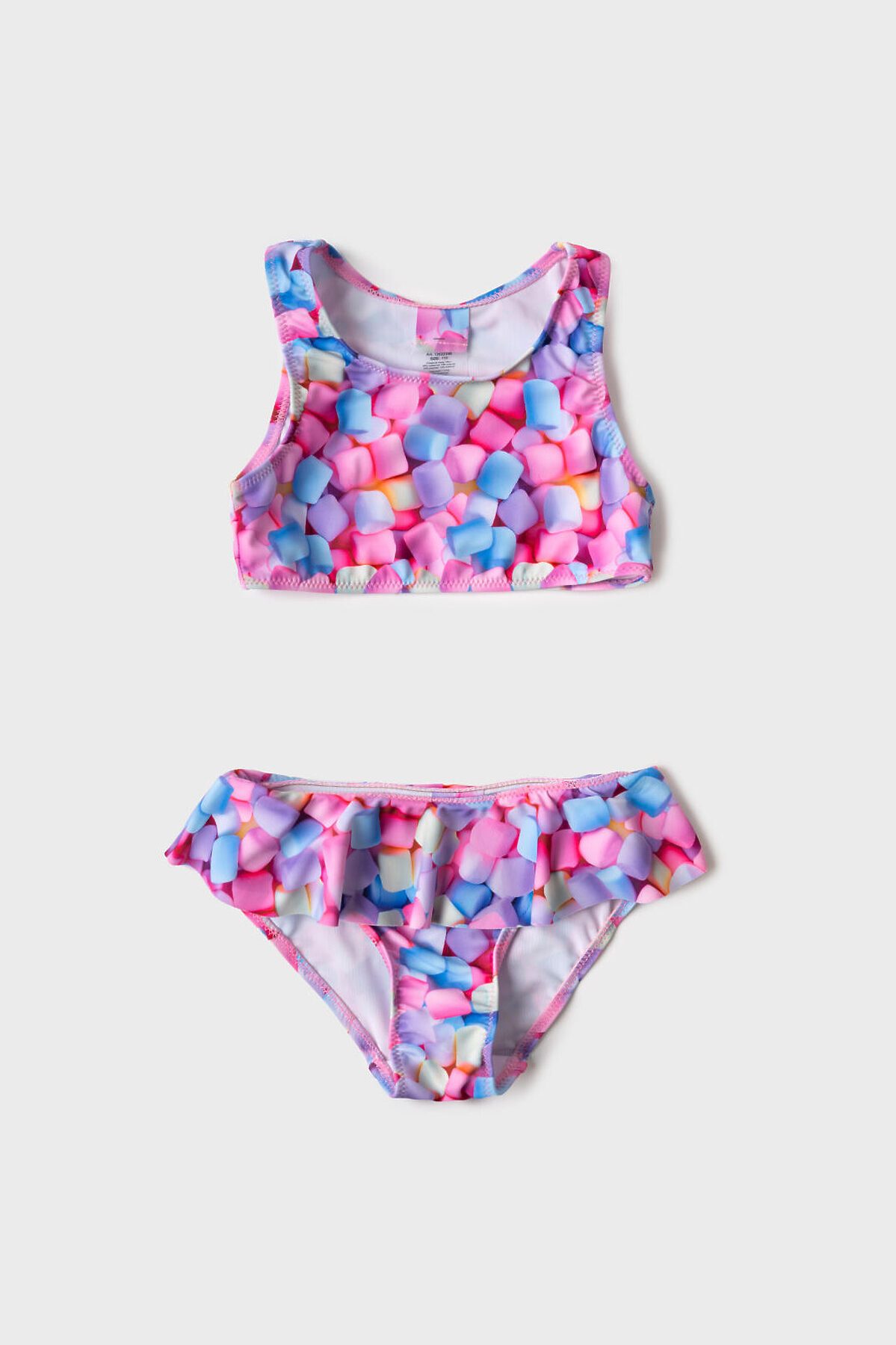 Купальник детский раздельный для девочки. Верх имеет круглый вырез и плотно прилегает к телу, а плавки средней посадки украшены оборкой по поясу. Яркий фотопринт с изображением разноцветного маршмеллоу делает изделие особенно привлекательным и веселым. Внутри предусмотрена подкладка. Все края обработаны эластичной тесьмой, чтобы изделие хорошо сидело на теле и не натирало. Благодаря UF-защите, ткань сохраняет первоначальный вид даже при длительном пребывании на солнце. Подходит для плавания и активного отдыха.