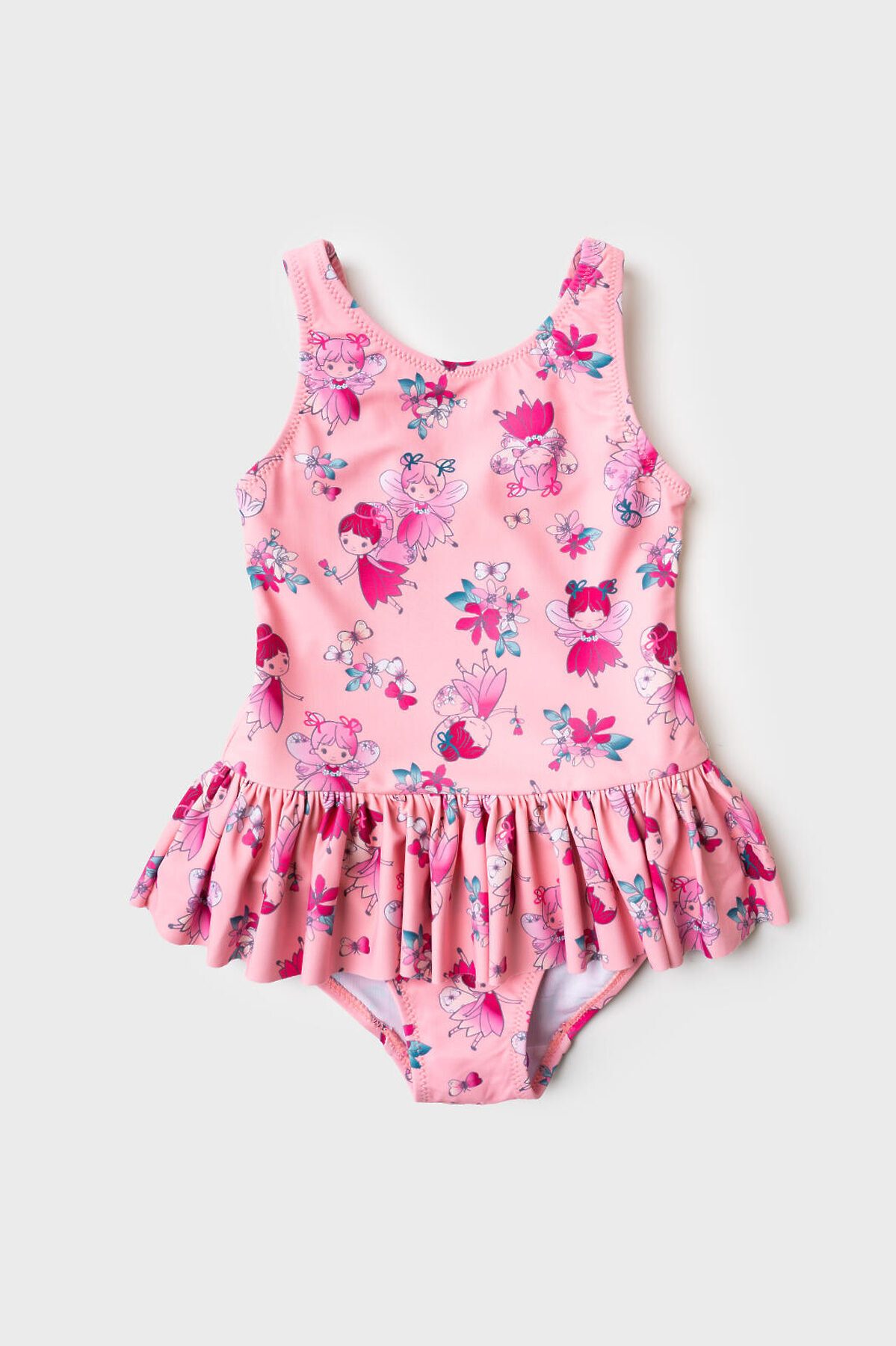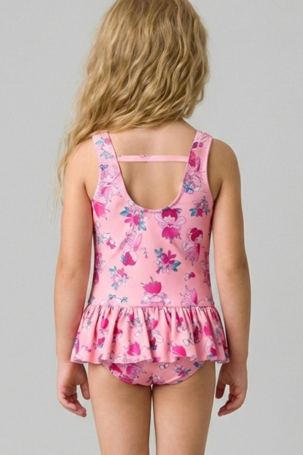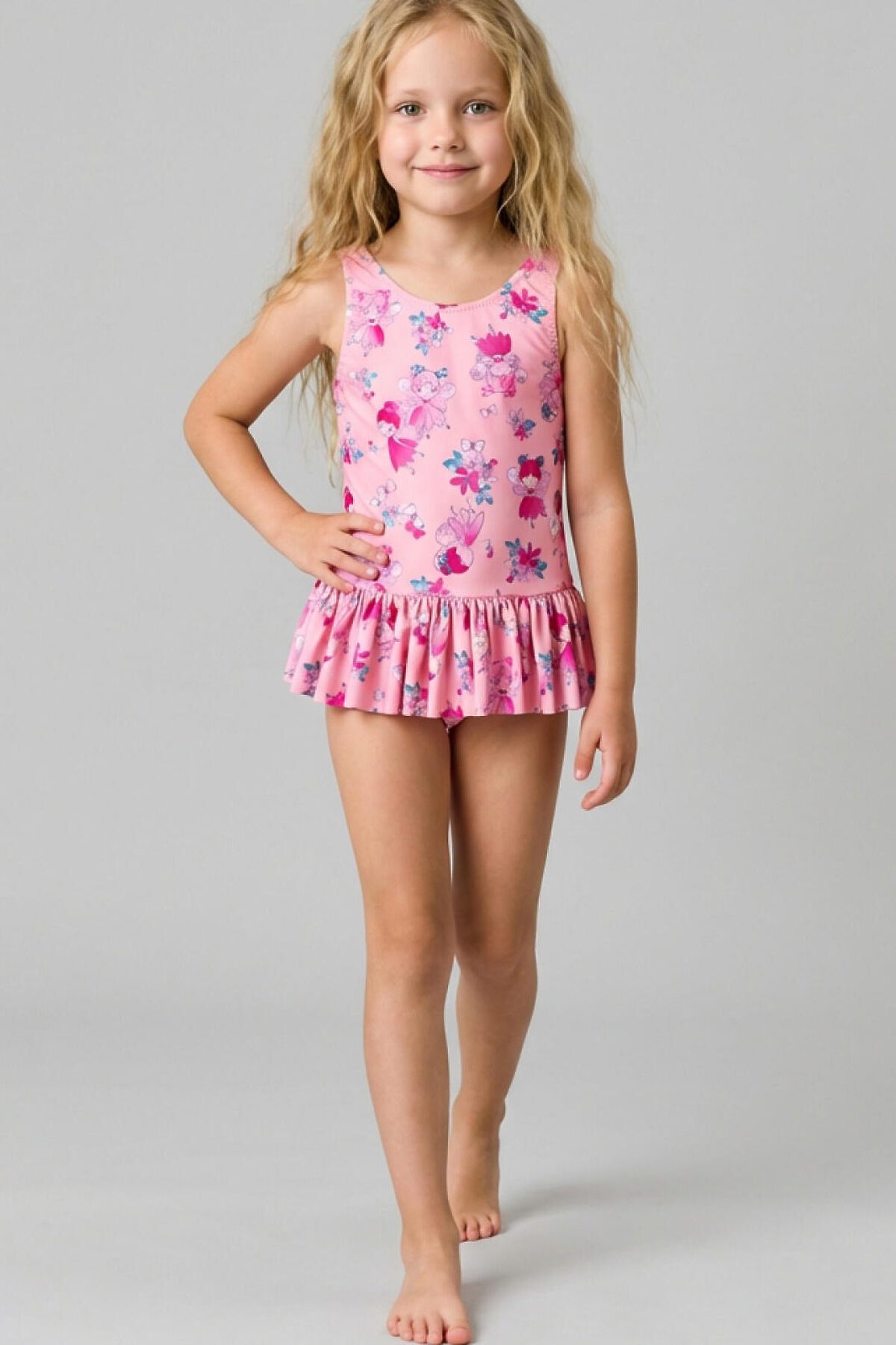 Детский слитный купальник для девочки. Выполнен с ярким принтом фей, цветов и бабочек. Спереди полностью закрытый, с широкой круглой горловиной. На спинке — глубокий вырез с декоративной вставкой в виде тонкой полоски с бахромой. По линии талии пришита короткая юбочка с пышной сборкой. Внутри — мягкая подкладка и гигиеническая наклейка. Все края обработаны эластичной тесьмой, чтобы изделие хорошо сидело на теле и не натирало. Благодаря UF-защите, ткань сохраняет первоначальный вид даже при длительном пребывании на солнце. Подходит для плавания и активного отдыха.