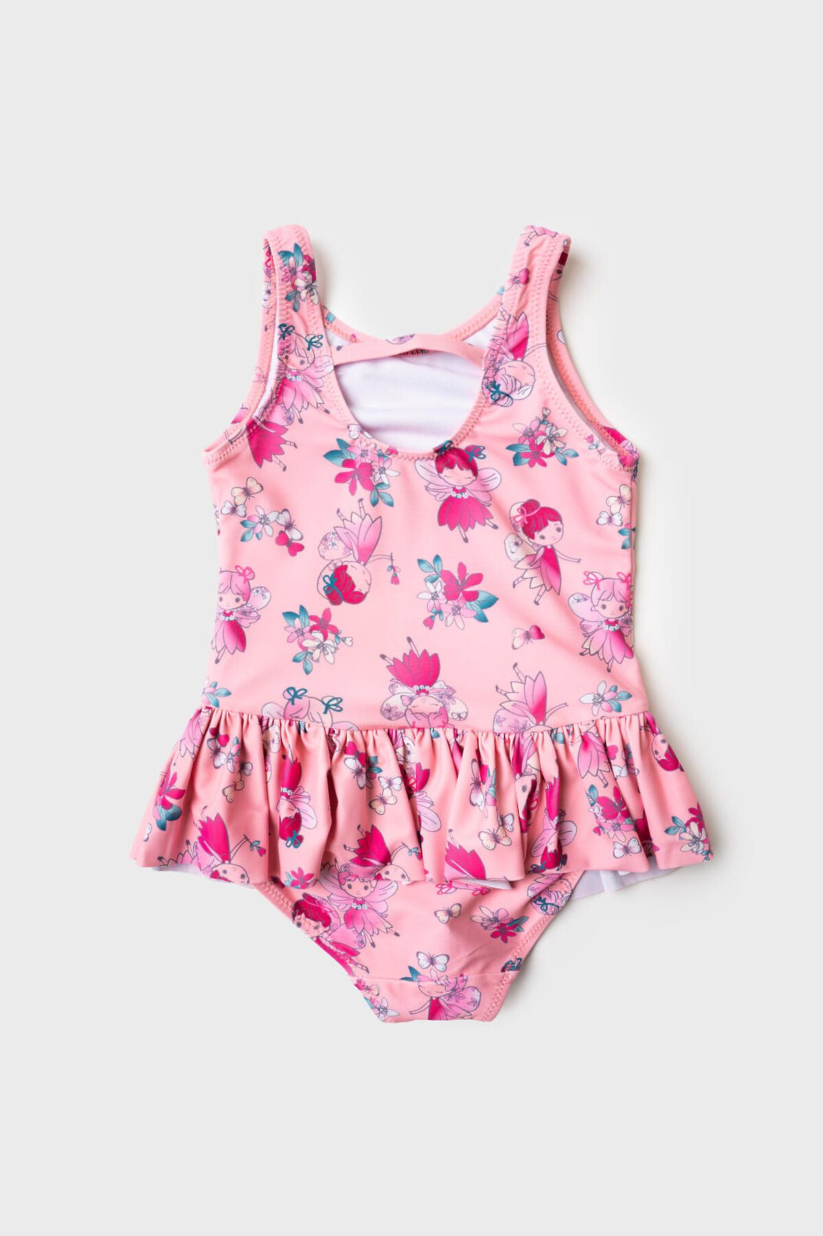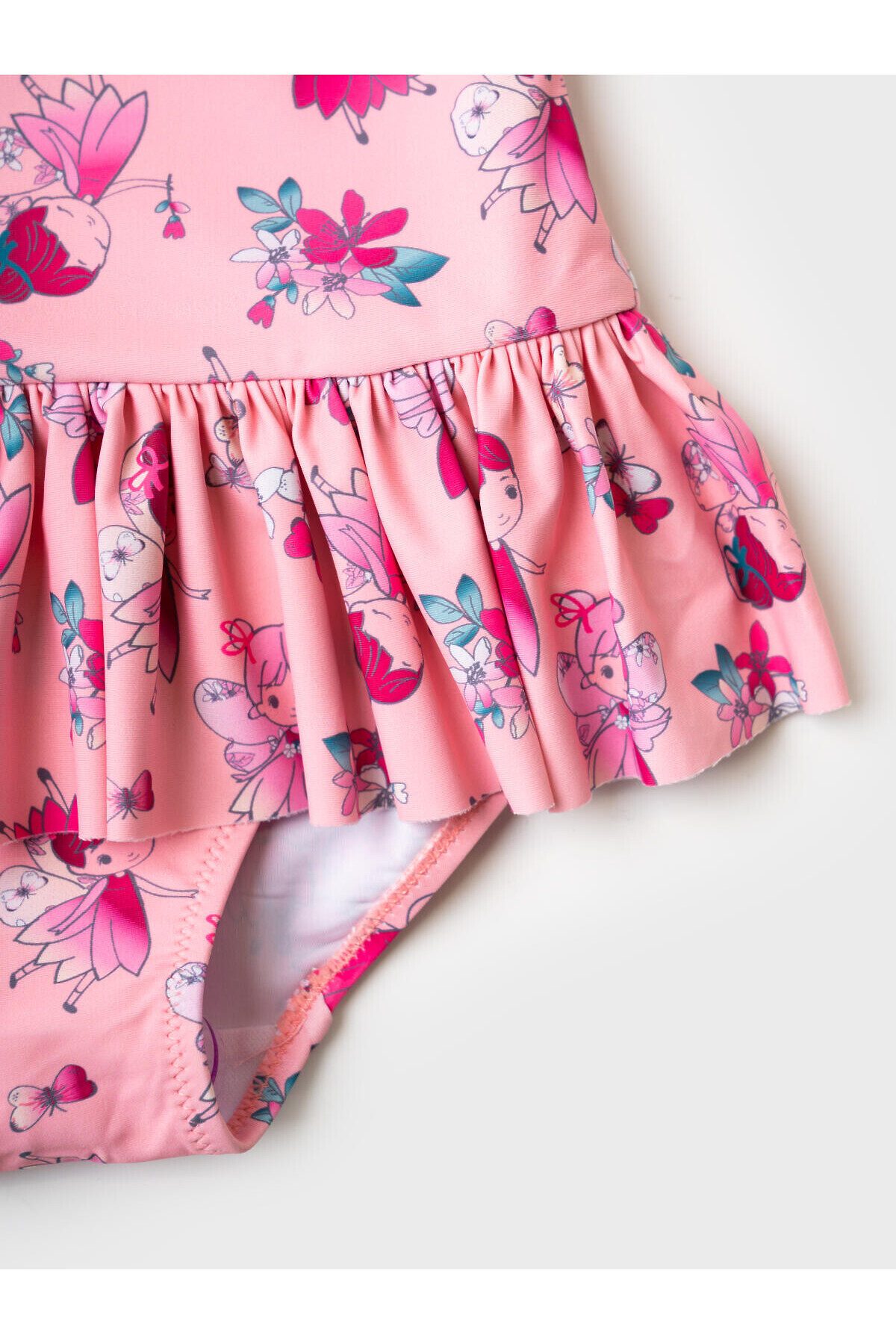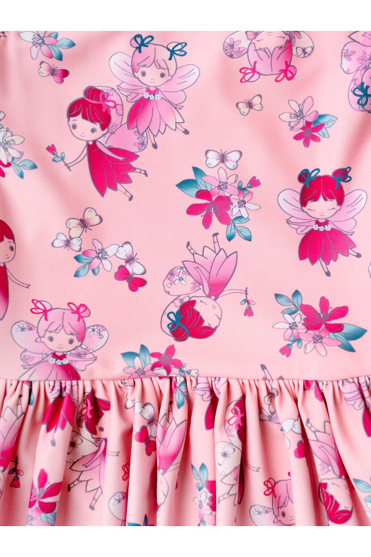 Детский слитный купальник для девочки. Выполнен с ярким принтом фей, цветов и бабочек. Спереди полностью закрытый, с широкой круглой горловиной. На спинке — глубокий вырез с декоративной вставкой в виде тонкой полоски с бахромой. По линии талии пришита короткая юбочка с пышной сборкой. Внутри — мягкая подкладка и гигиеническая наклейка. Все края обработаны эластичной тесьмой, чтобы изделие хорошо сидело на теле и не натирало. Благодаря UF-защите, ткань сохраняет первоначальный вид даже при длительном пребывании на солнце. Подходит для плавания и активного отдыха.