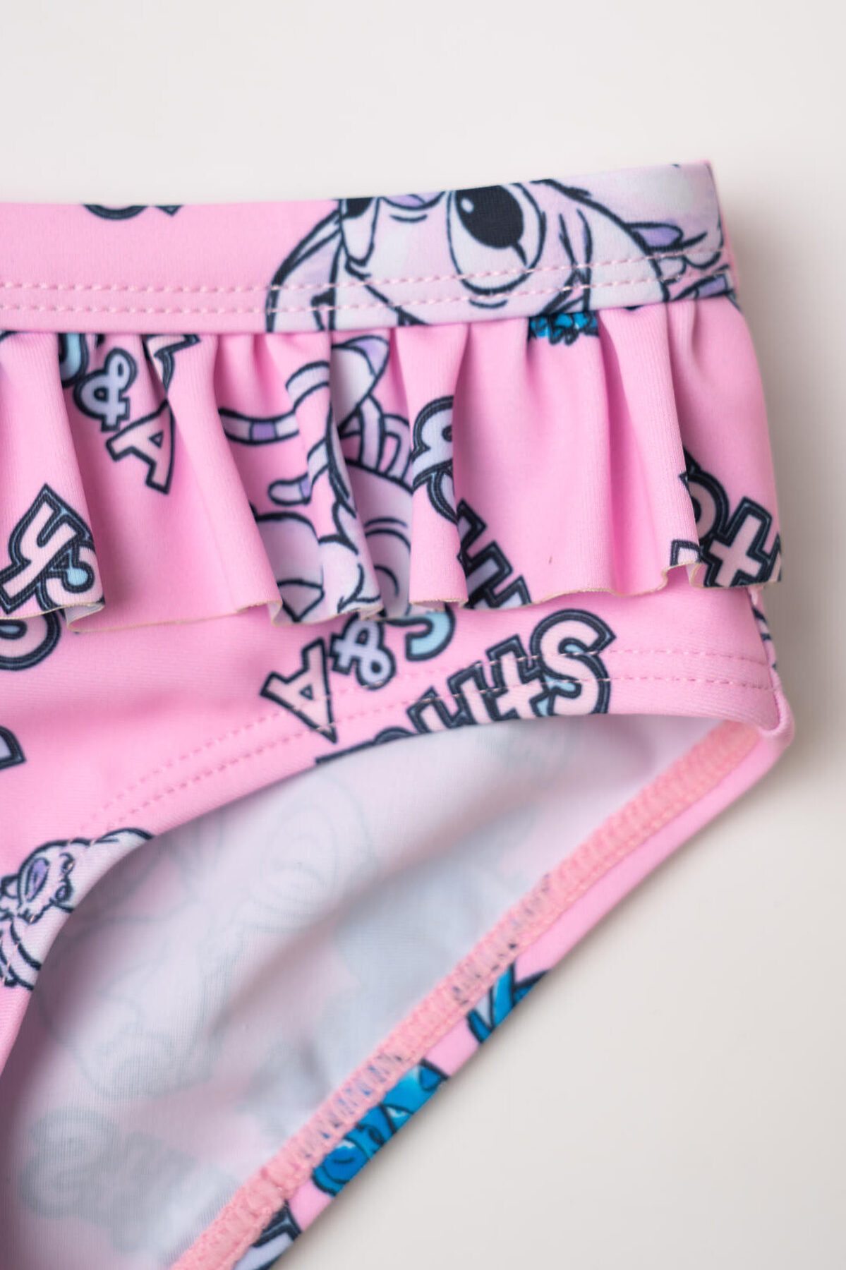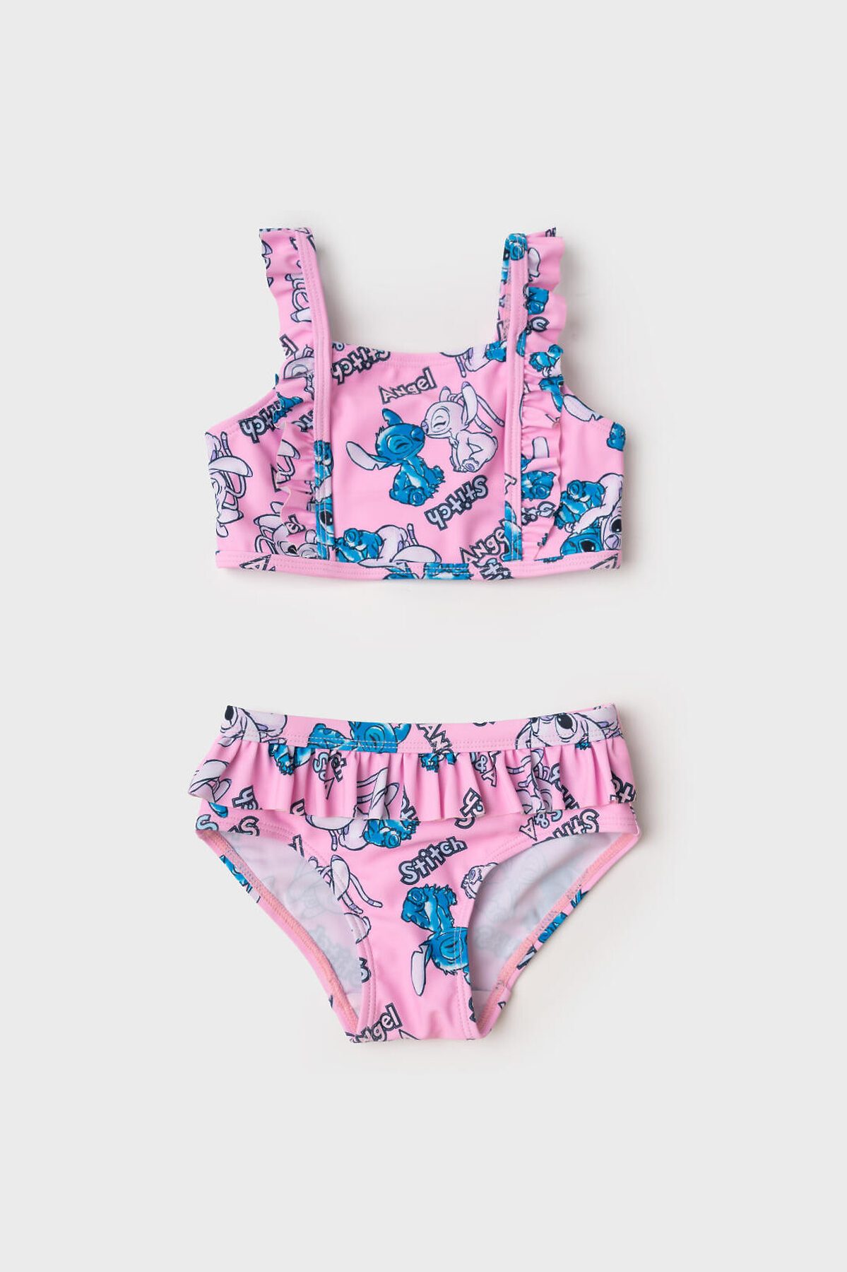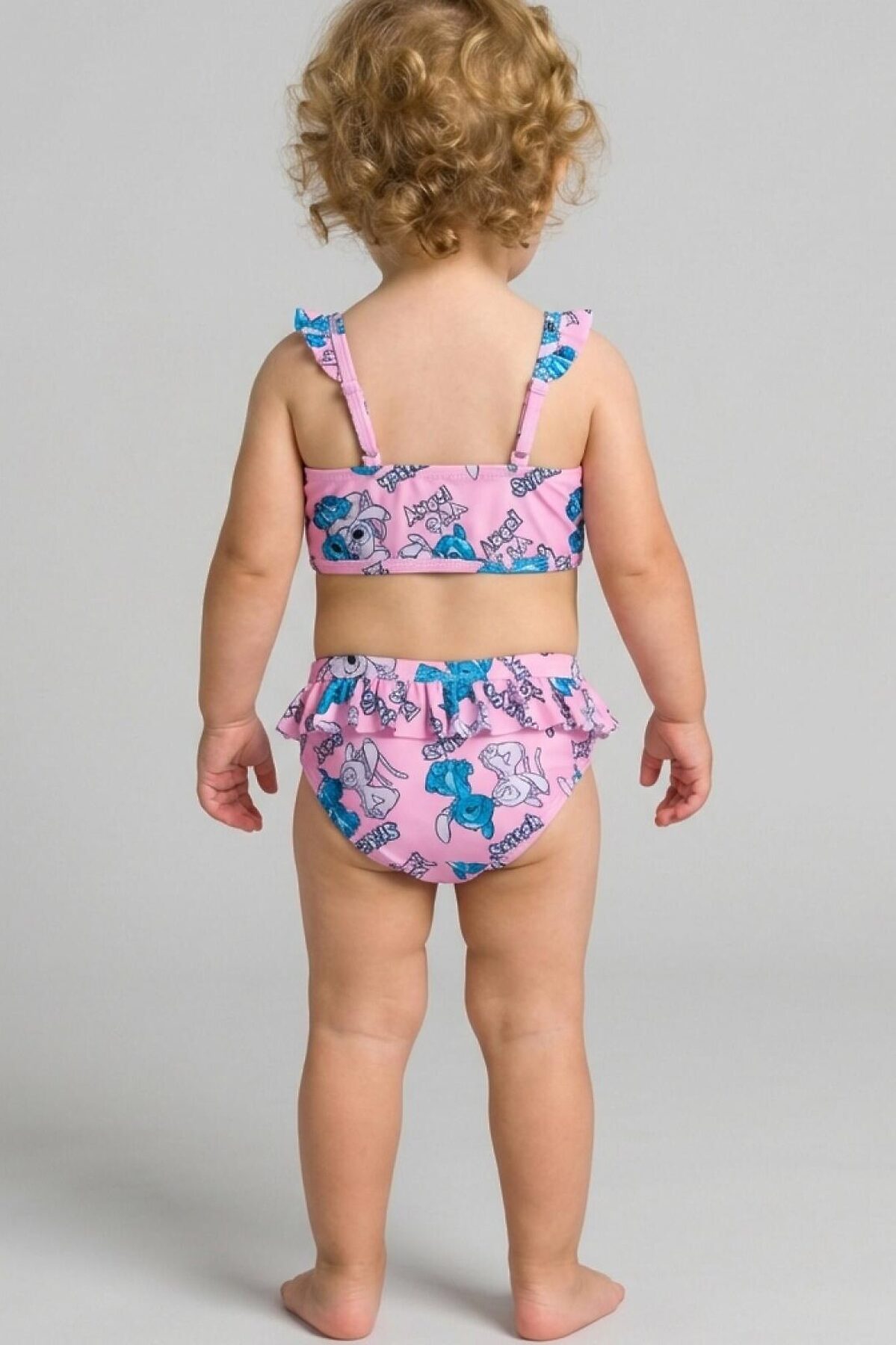 Купальник детский раздельный для девочки. Верхняя часть — укороченный топ с прямым вырезом и очаровательными рюшами на бретелях, которые можно отрегулировать. Плавки с подкладкой и высокой посадкой также украшены рюшами по поясу. Вся поверхность костюма украшена ярким принтом с персонажами Лило и Стич на розовом фоне. Все края обработаны эластичной тесьмой, чтобы изделие хорошо сидело на теле и не натирало. Благодаря UF-защите, ткань сохраняет первоначальный вид даже при длительном пребывании на солнце. Подходит для пляжа и бассейна.