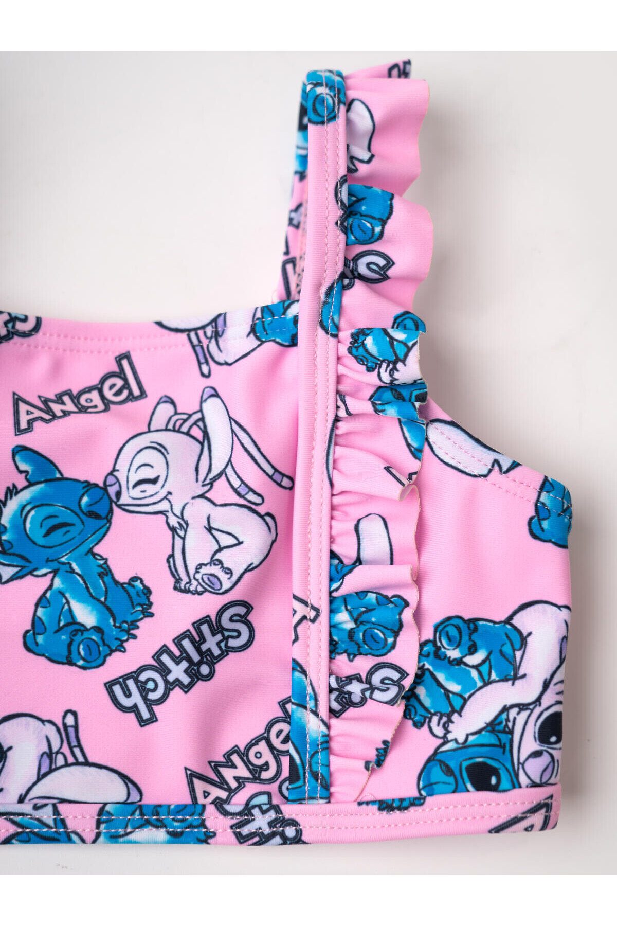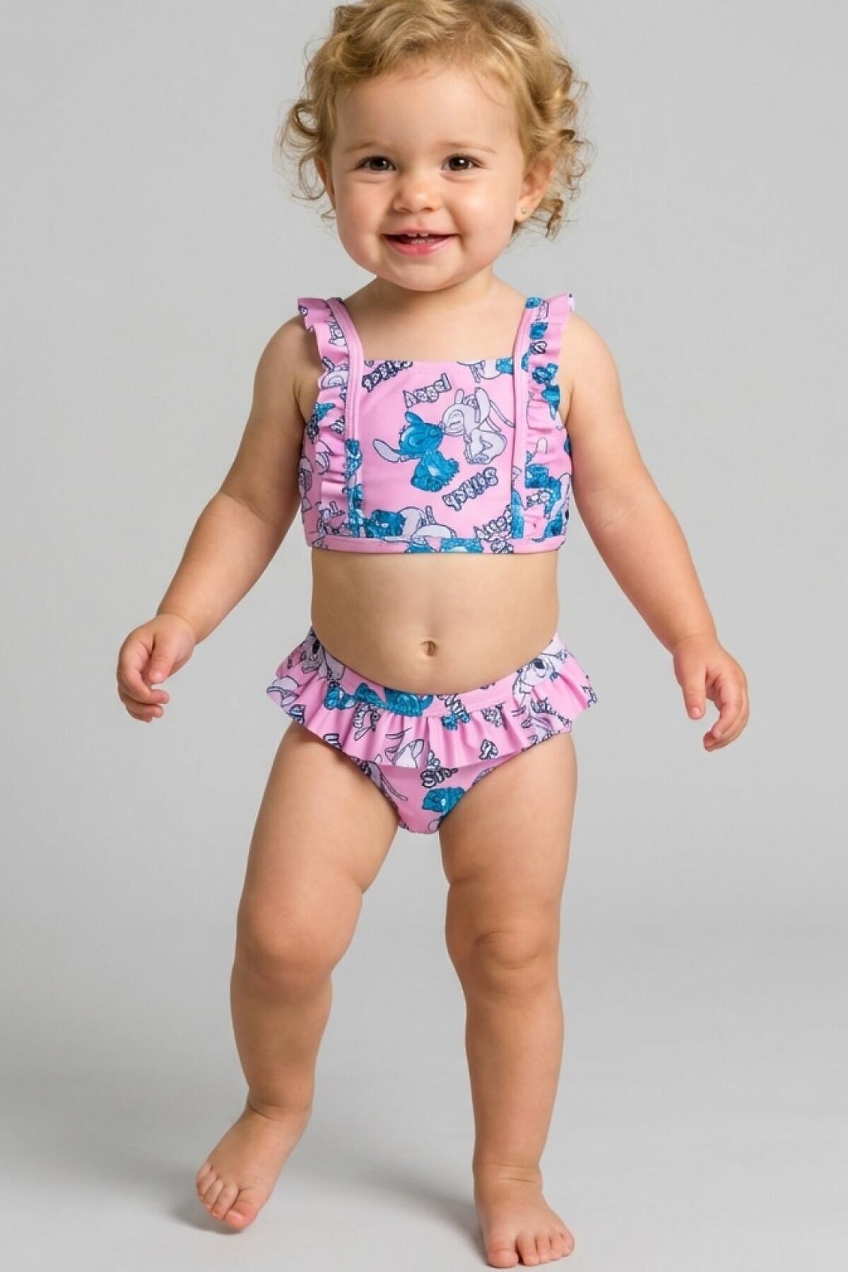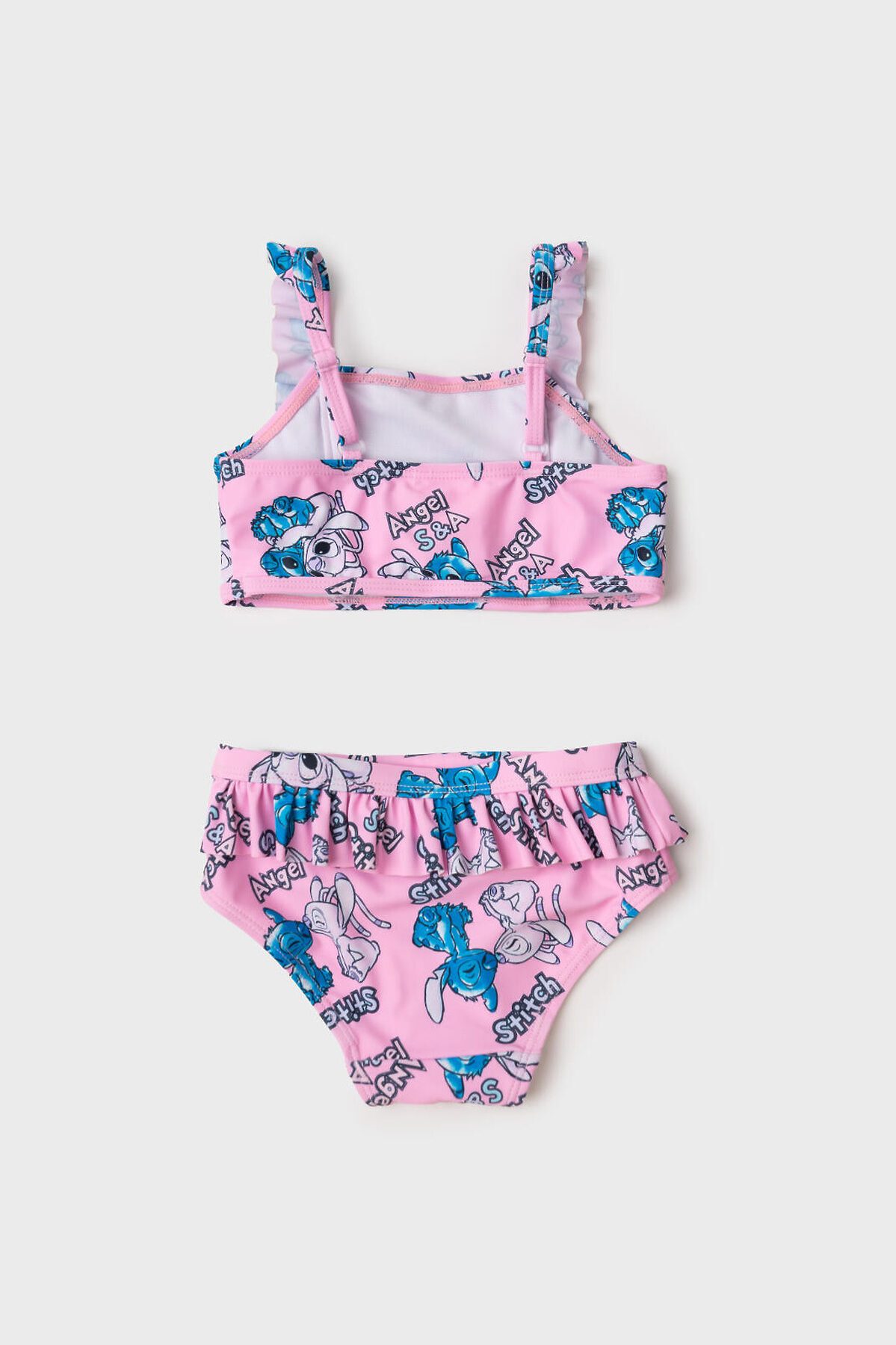 Купальник детский раздельный для девочки. Верхняя часть — укороченный топ с прямым вырезом и очаровательными рюшами на бретелях, которые можно отрегулировать. Плавки с подкладкой и высокой посадкой также украшены рюшами по поясу. Вся поверхность костюма украшена ярким принтом с персонажами Лило и Стич на розовом фоне. Все края обработаны эластичной тесьмой, чтобы изделие хорошо сидело на теле и не натирало. Благодаря UF-защите, ткань сохраняет первоначальный вид даже при длительном пребывании на солнце. Подходит для пляжа и бассейна.