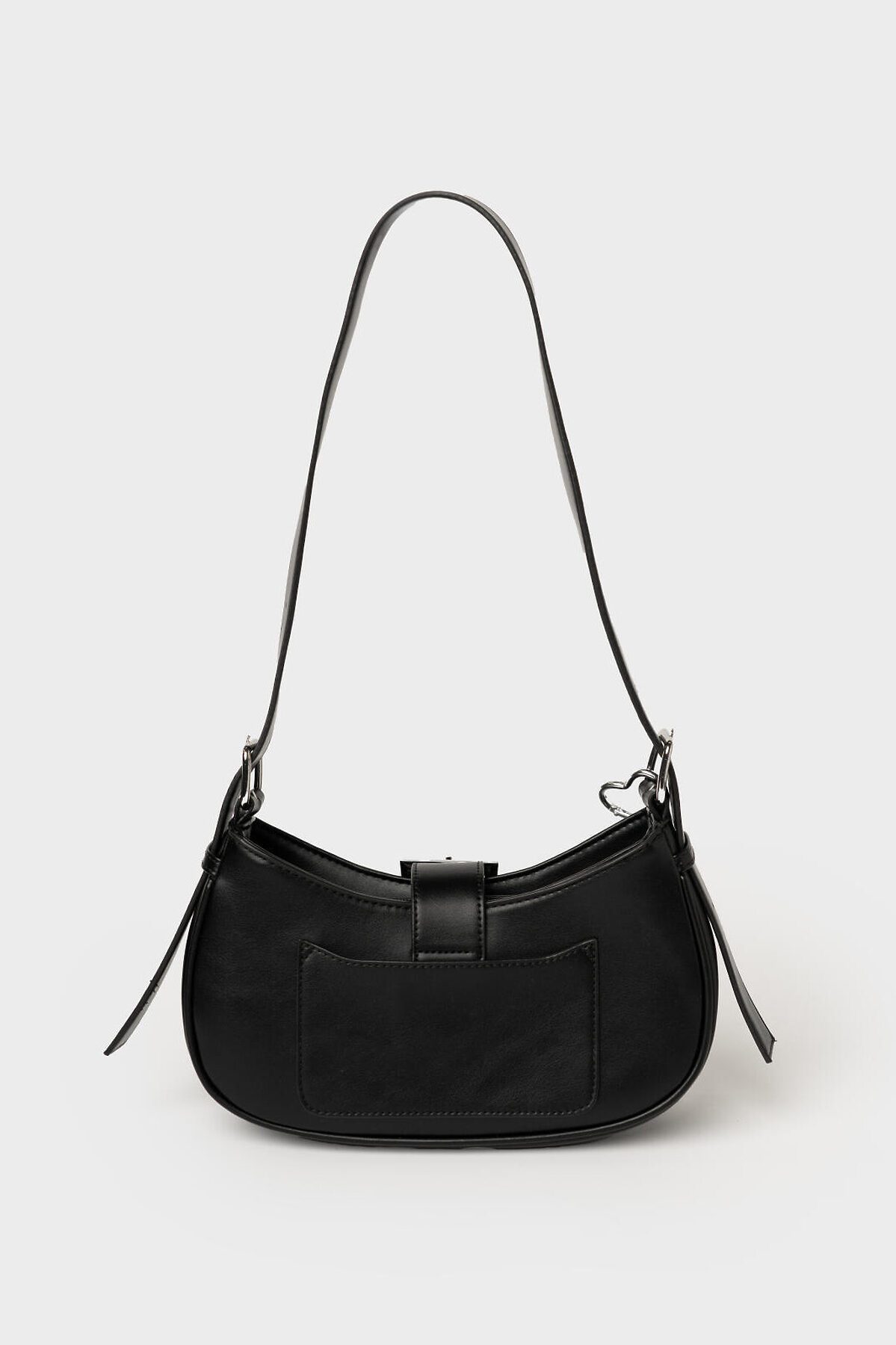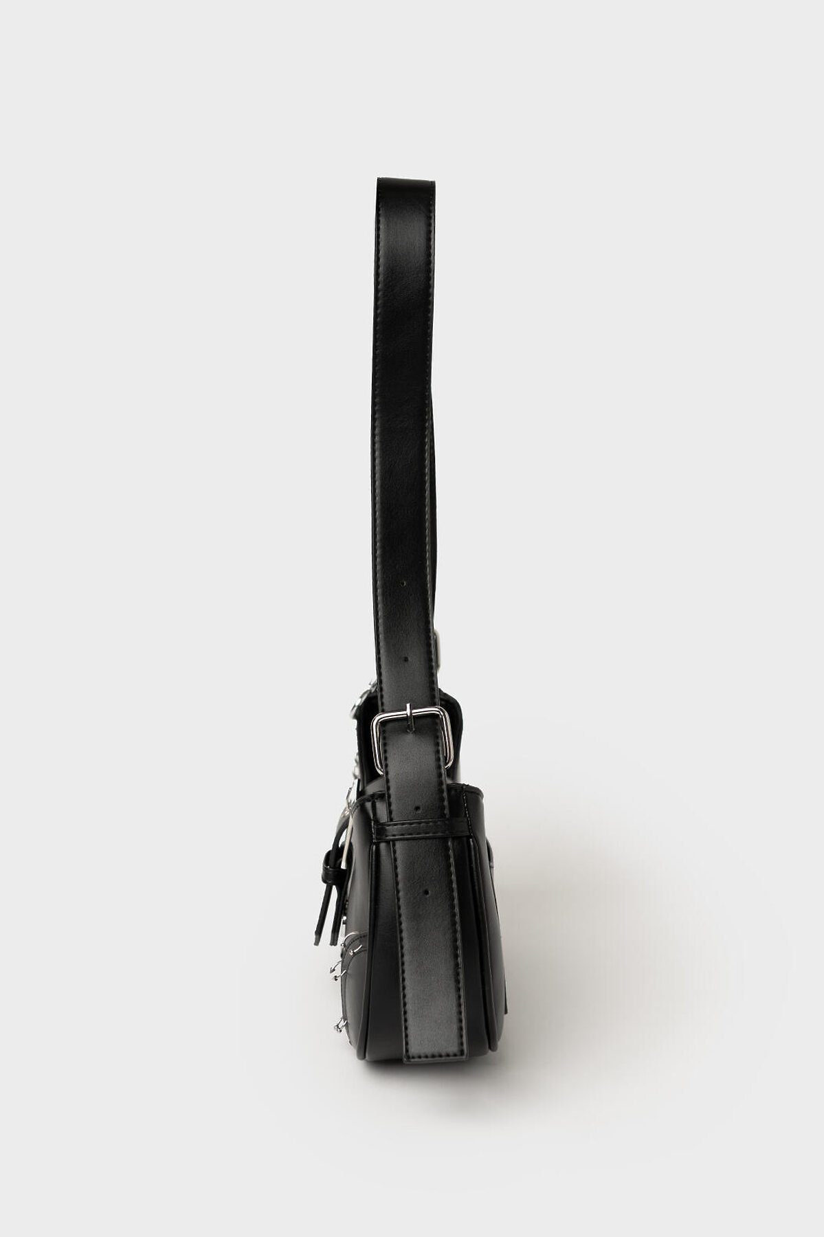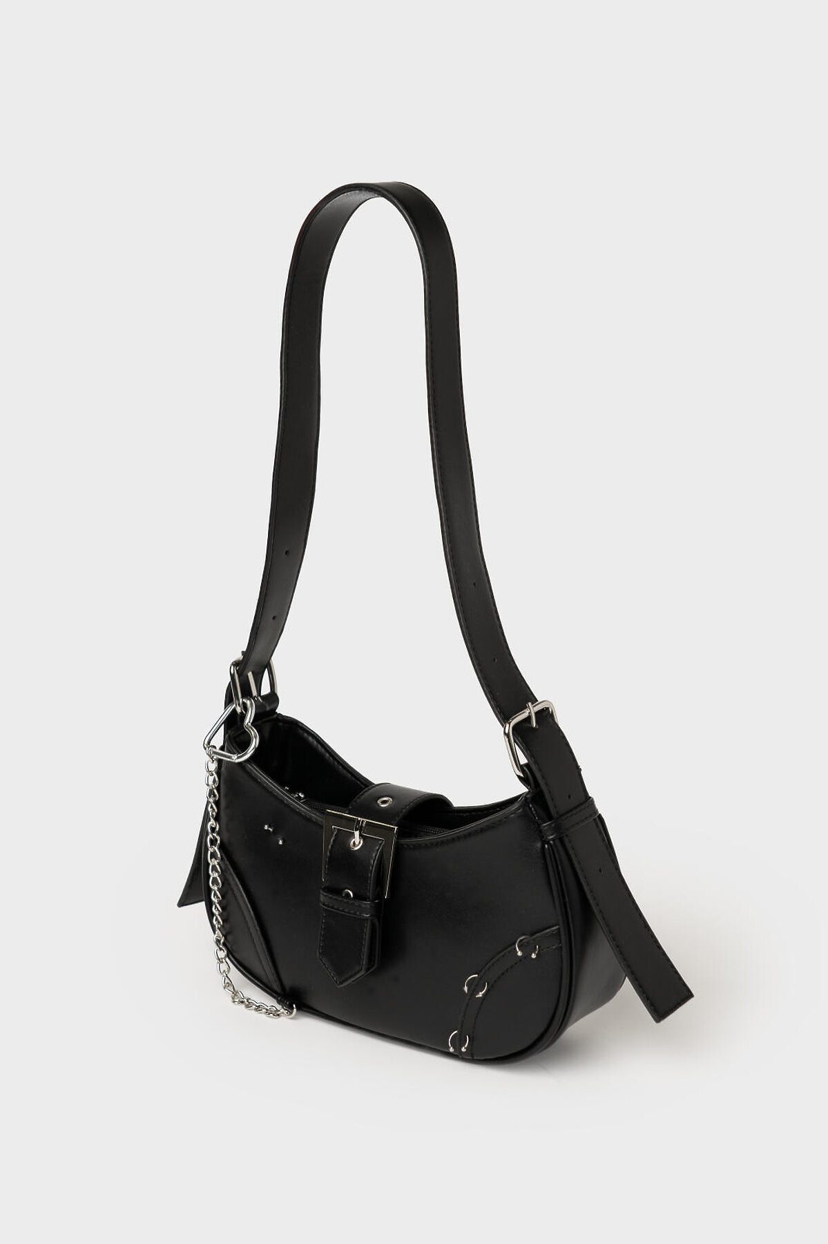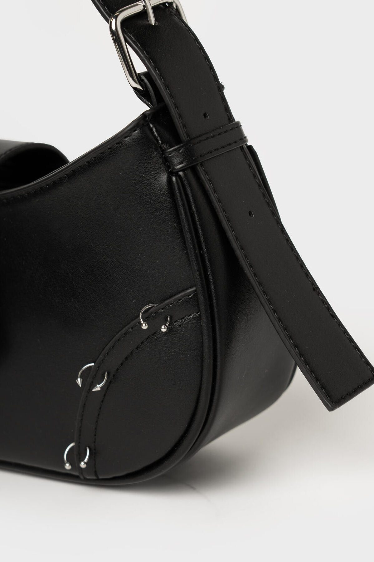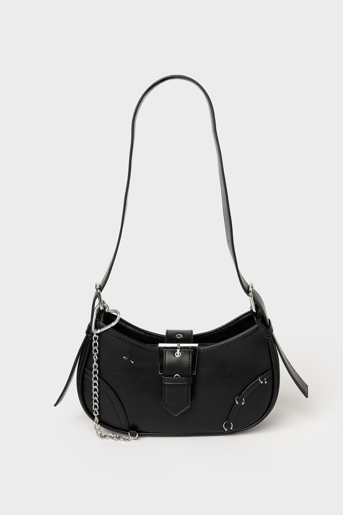 Сумка с пирсингом с ремнем на плечо. Ремень регулируется по длине. Сумка выполнена из искусственной кожи и декорирована металлической цепочкой и пирсингом. Основное отделение на молнии, внутри есть карман для телефона. Параметры сумки: высота - 12 см, ширина -27 см, глубина - 7 см