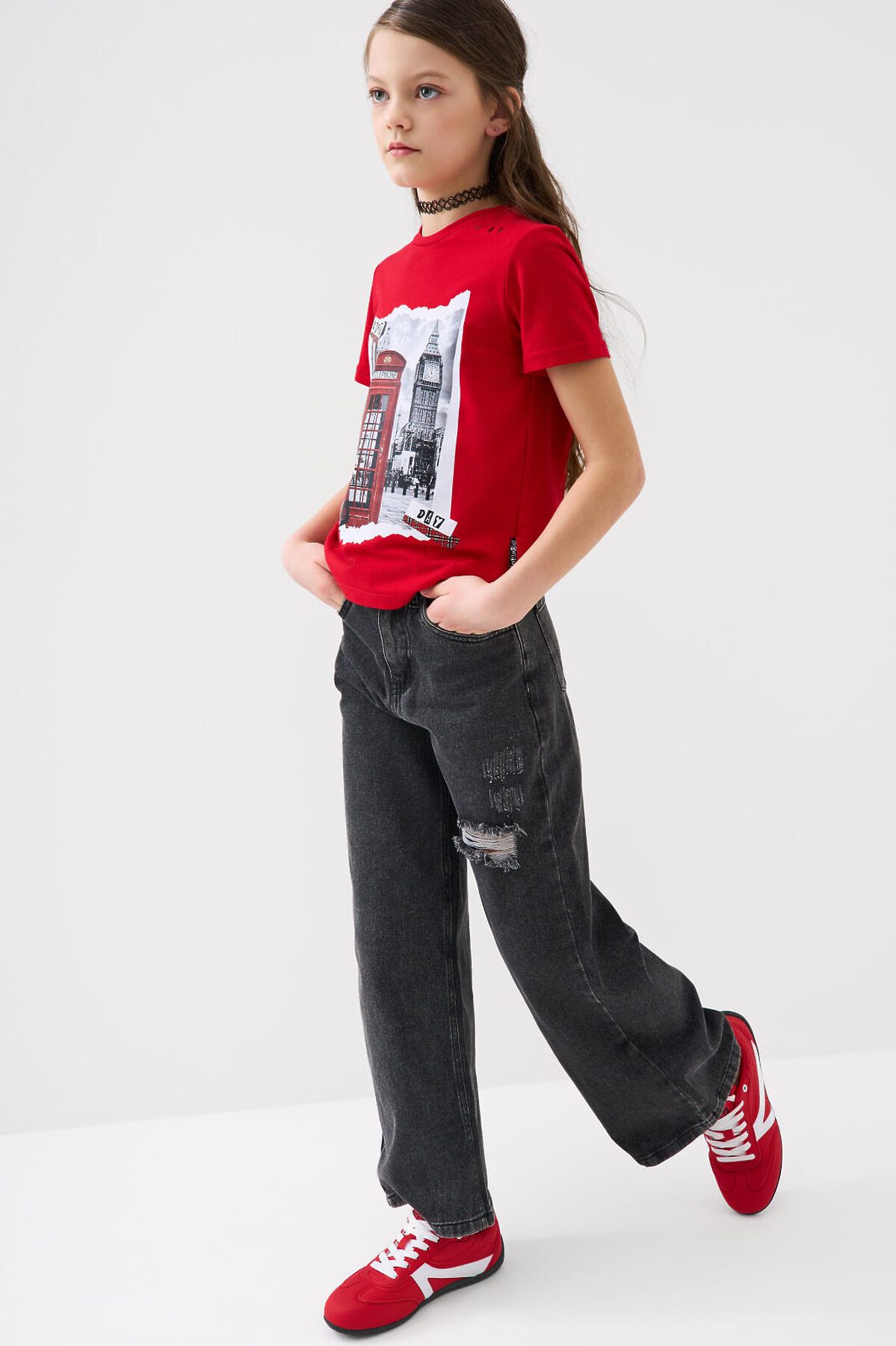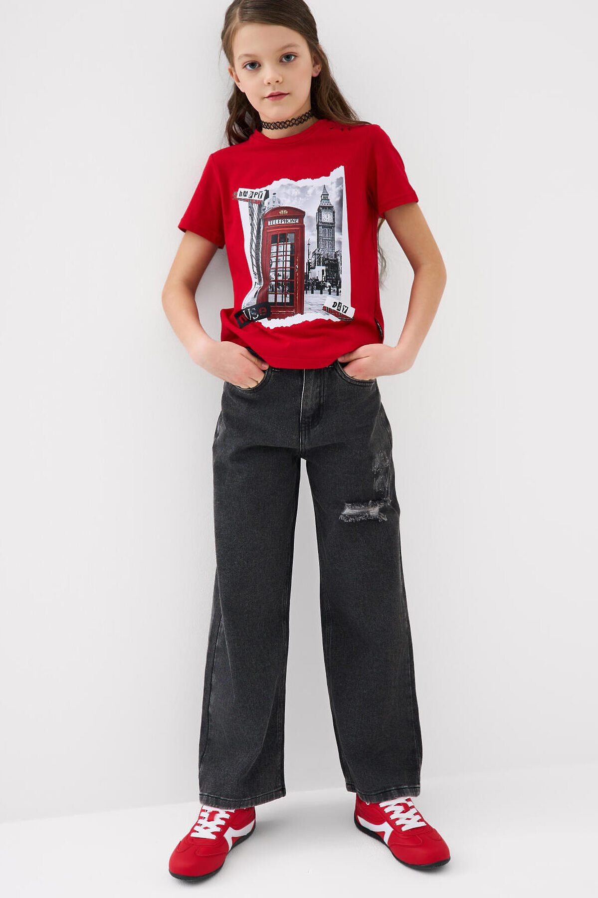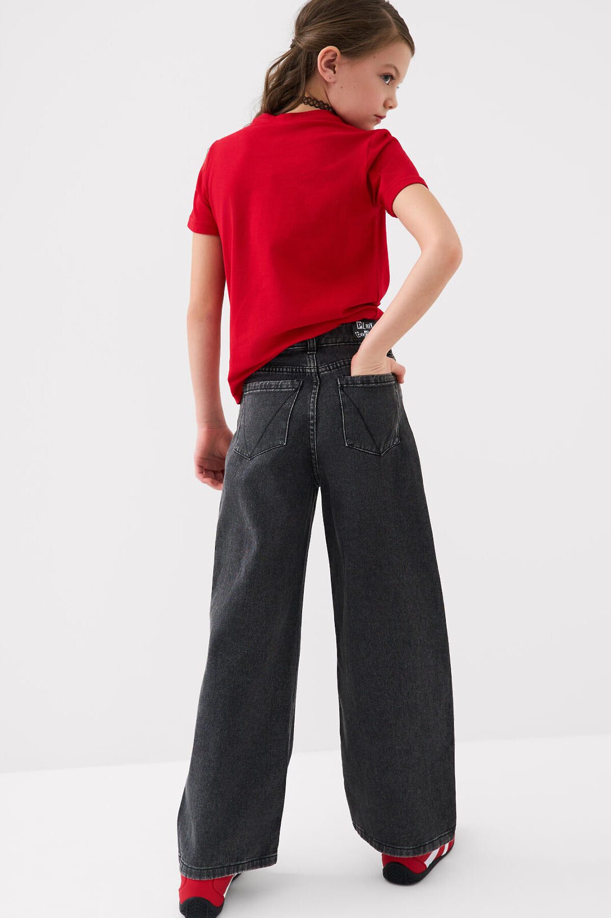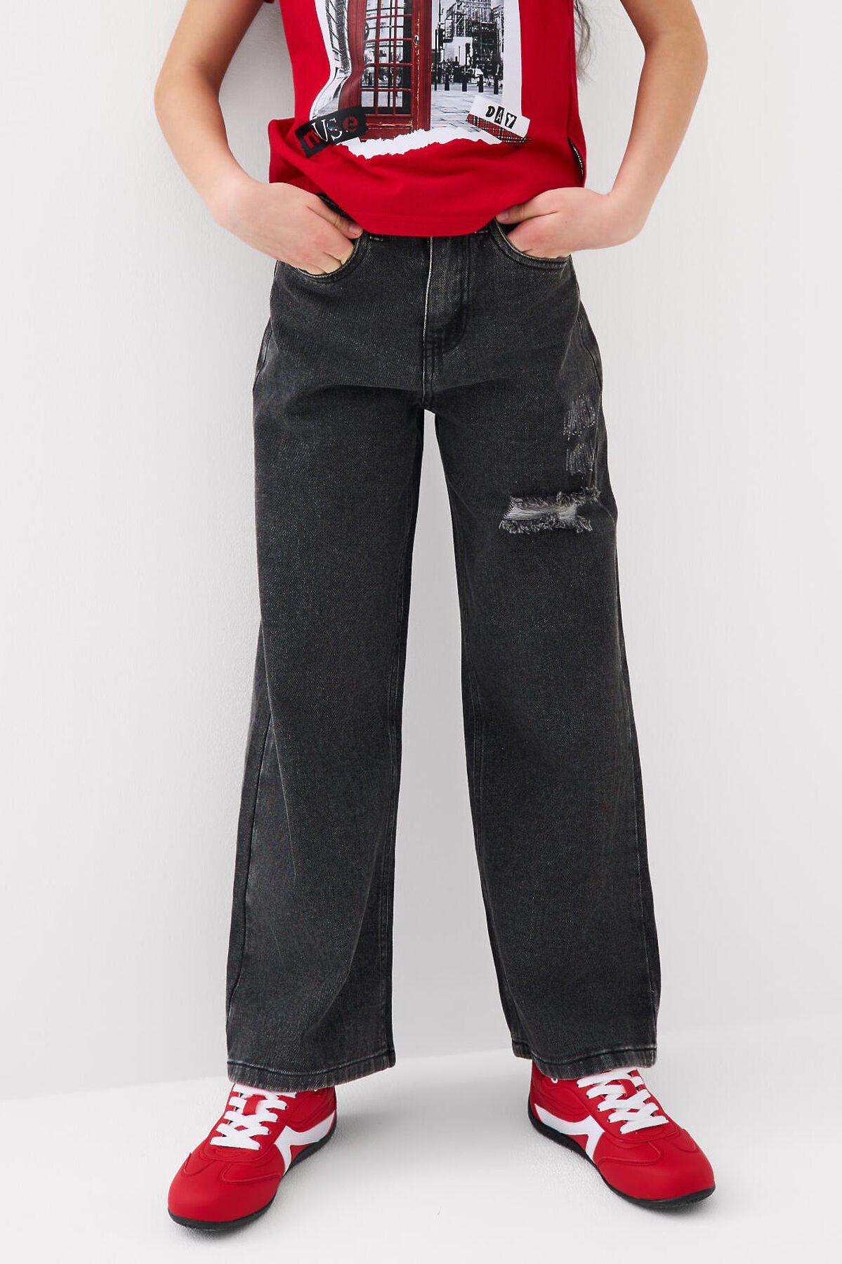 Джинсы для девочки подростка. Впереди застежка на молнию и болт. Внутри пояса — эластичная лента с пуговицами для регулировки. Модель wide leg из плотного черного денима с прямыми широкими штанинами. Посадка классическая по талии, длина — до щиколотки. Спереди два боковых кармана, сзади — два накладных кармана. Декорированы принтами и нашивками. На поясе сзади — брендированный ярлык.