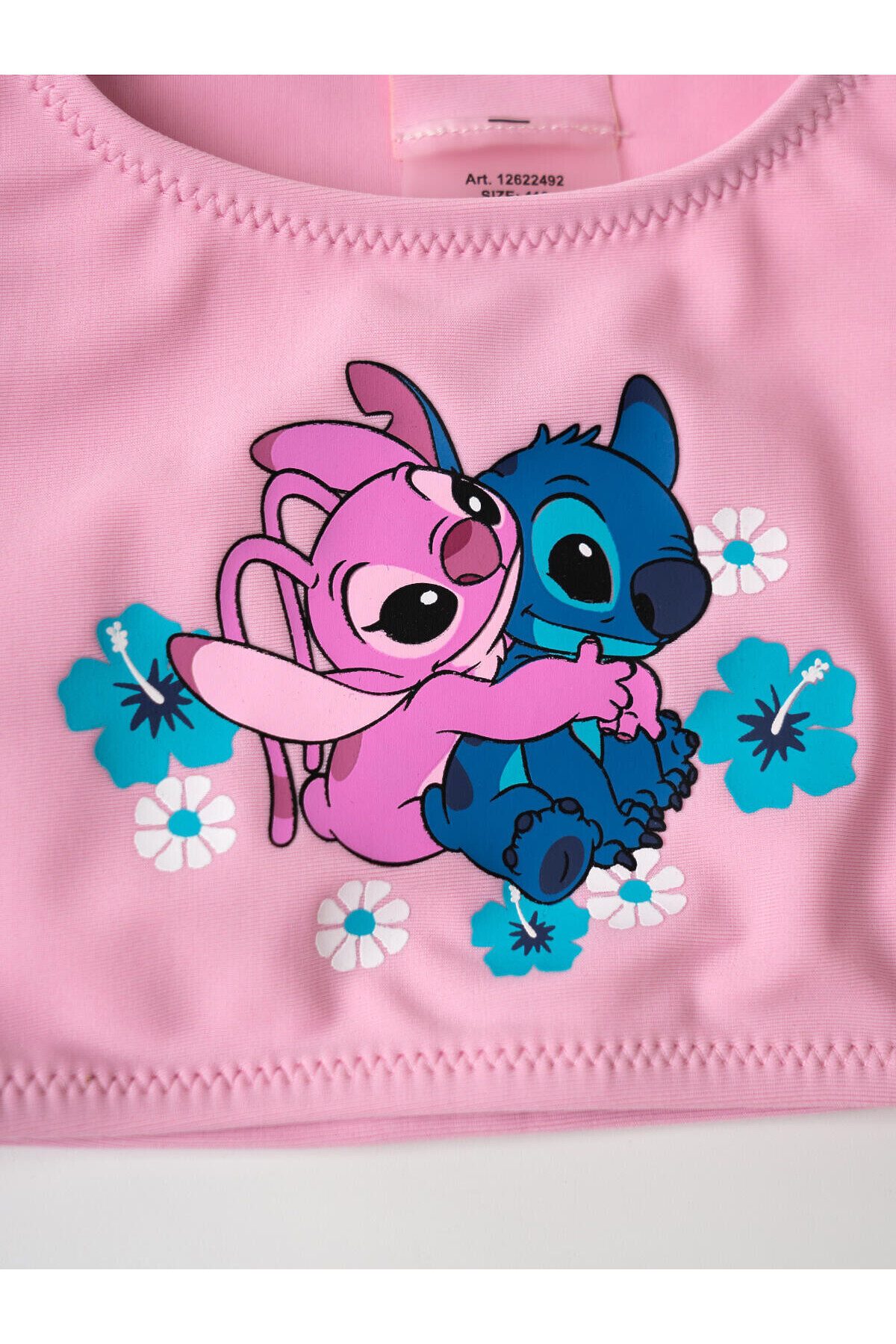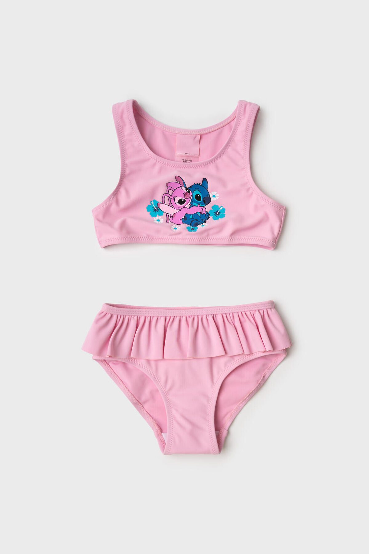 Купальник детский раздельный для девочки. Верхняя часть — топ с круглым вырезом. На груди — яркий и милый принт с героями мультфильма Лило и Стич и цветами. Плавки украшены оборкой по талии, что придаёт образу нежность. Внутри — подкладка. Все края обработаны эластичной тесьмой, чтобы изделие хорошо сидело на теле и не натирало. Благодаря UF-защите, ткань сохраняет первоначальный вид даже при длительном пребывании на солнце. Подходит для плавания и активного отдыха.