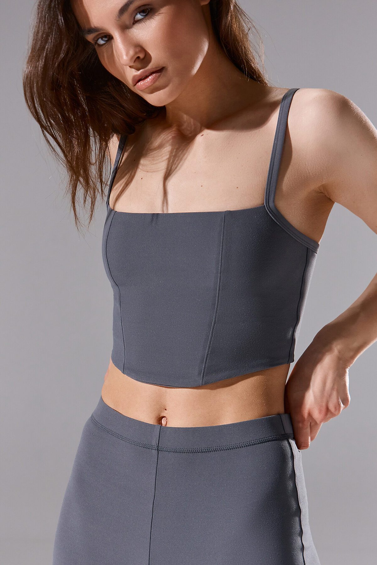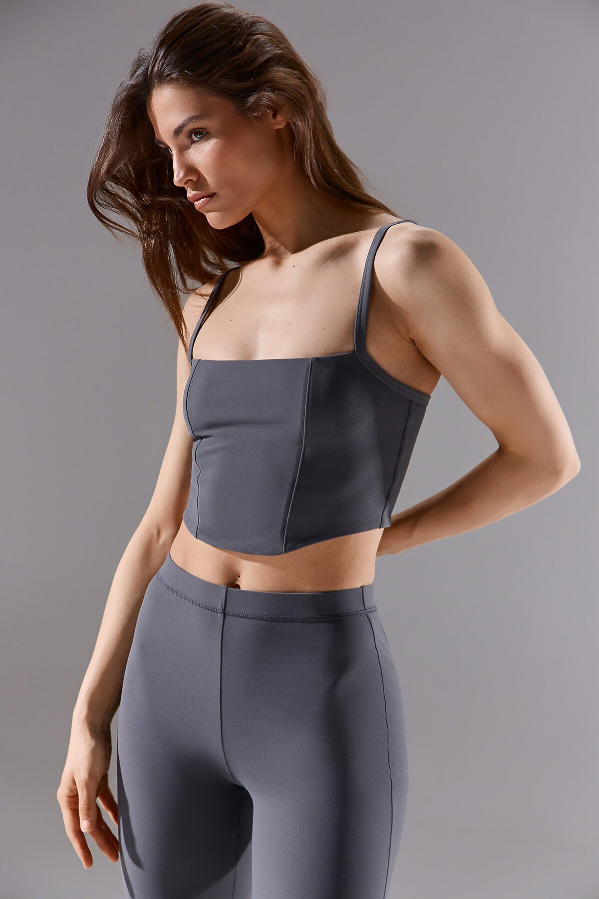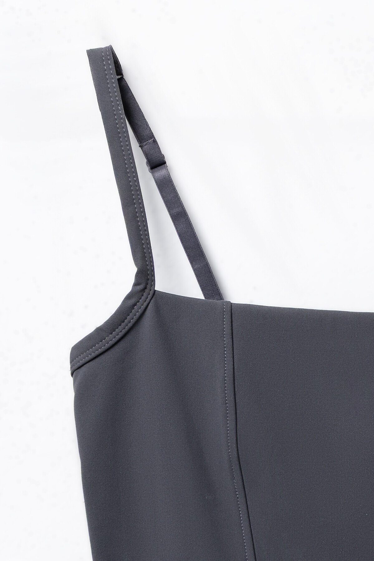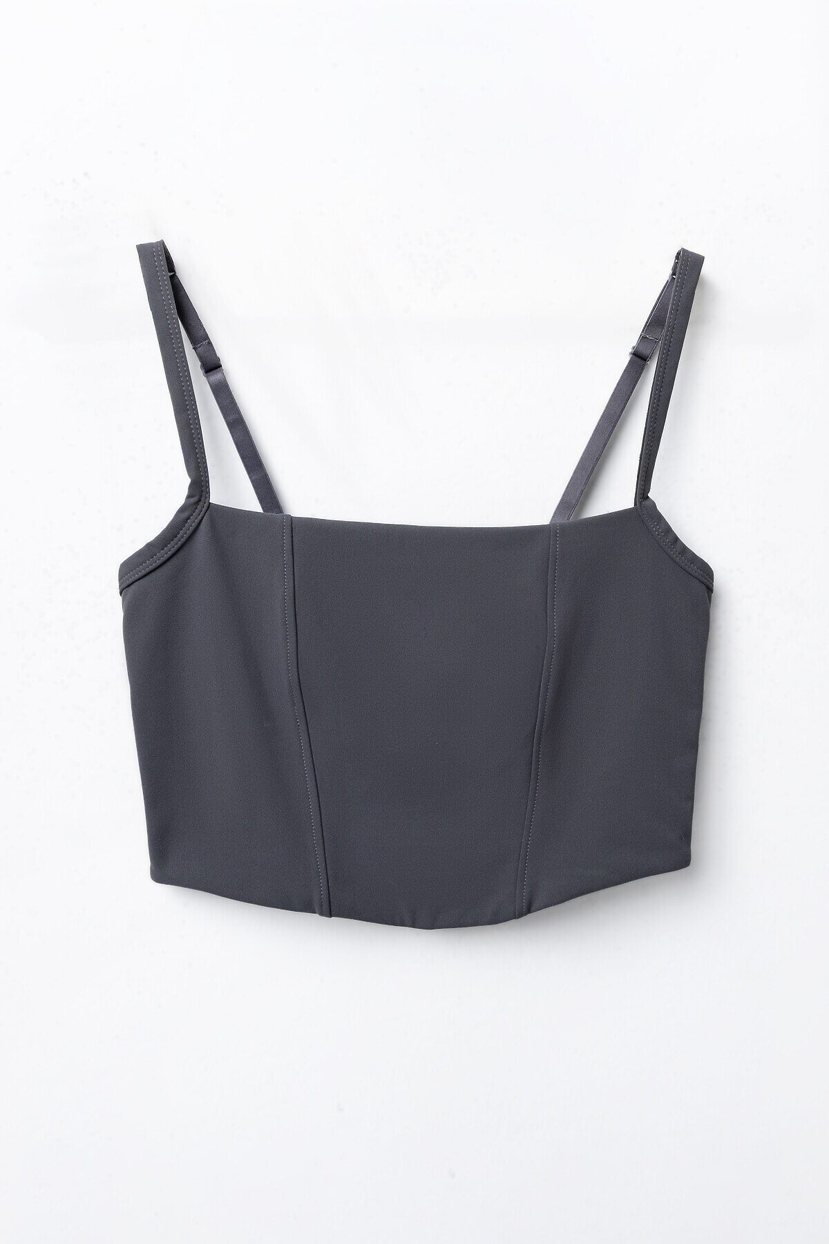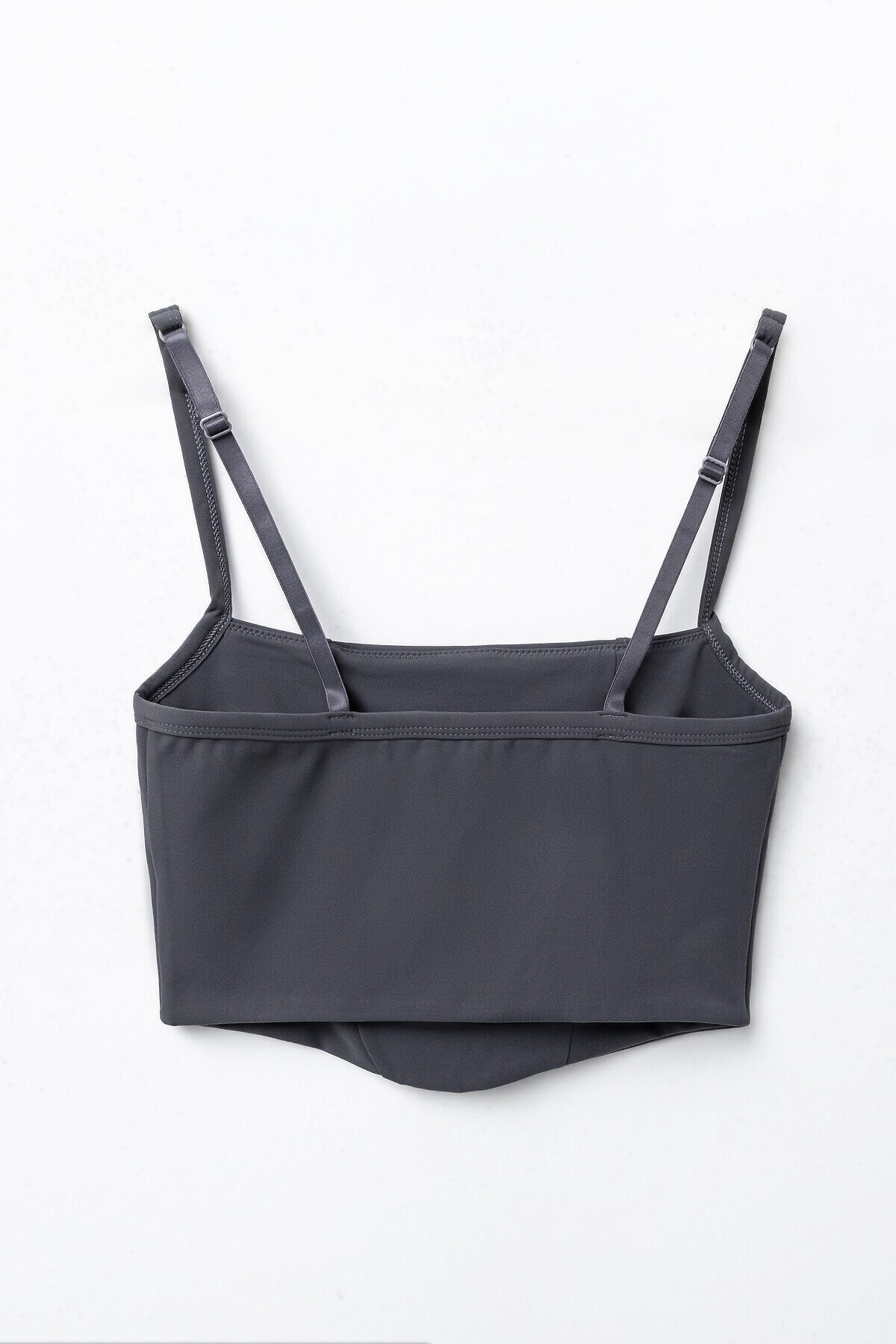 Топ облегающего силуэта на подкладке из основного полотна, на бретелях. Бретель по переду из основного полотна с жилкой тканой 10мм (WT4-10), сзади бретельная тесьма (Arteks E7573/М 10мм) с кольцами и регуляторами 10мм (по заданию). Верх спинки и проймы обработаны обтачкой из основного полотна. Верхний и нижний срез обработан в чистый край, в верхнем срезе жилка тканая 6мм (WT4-6). Горловина округлой формы. По переду отрезные рельефы с отделочной строчкой вдоль.