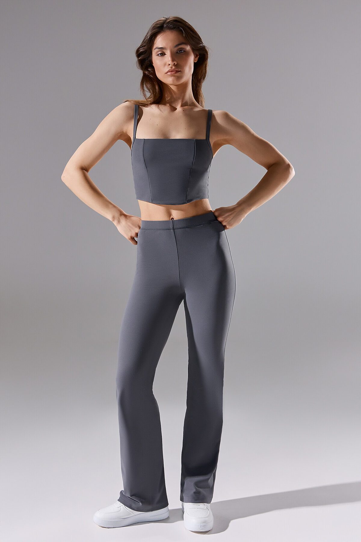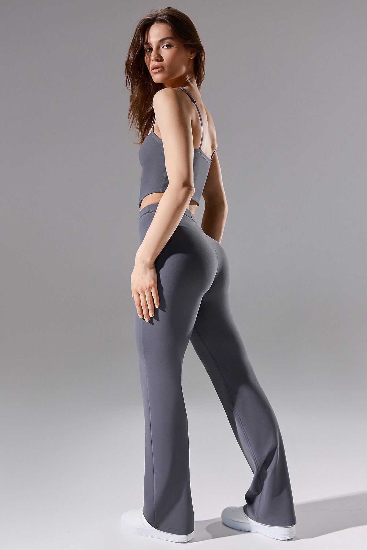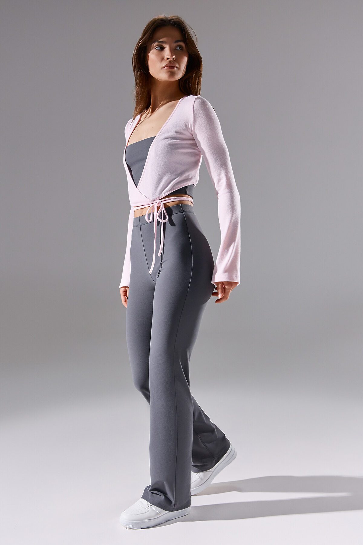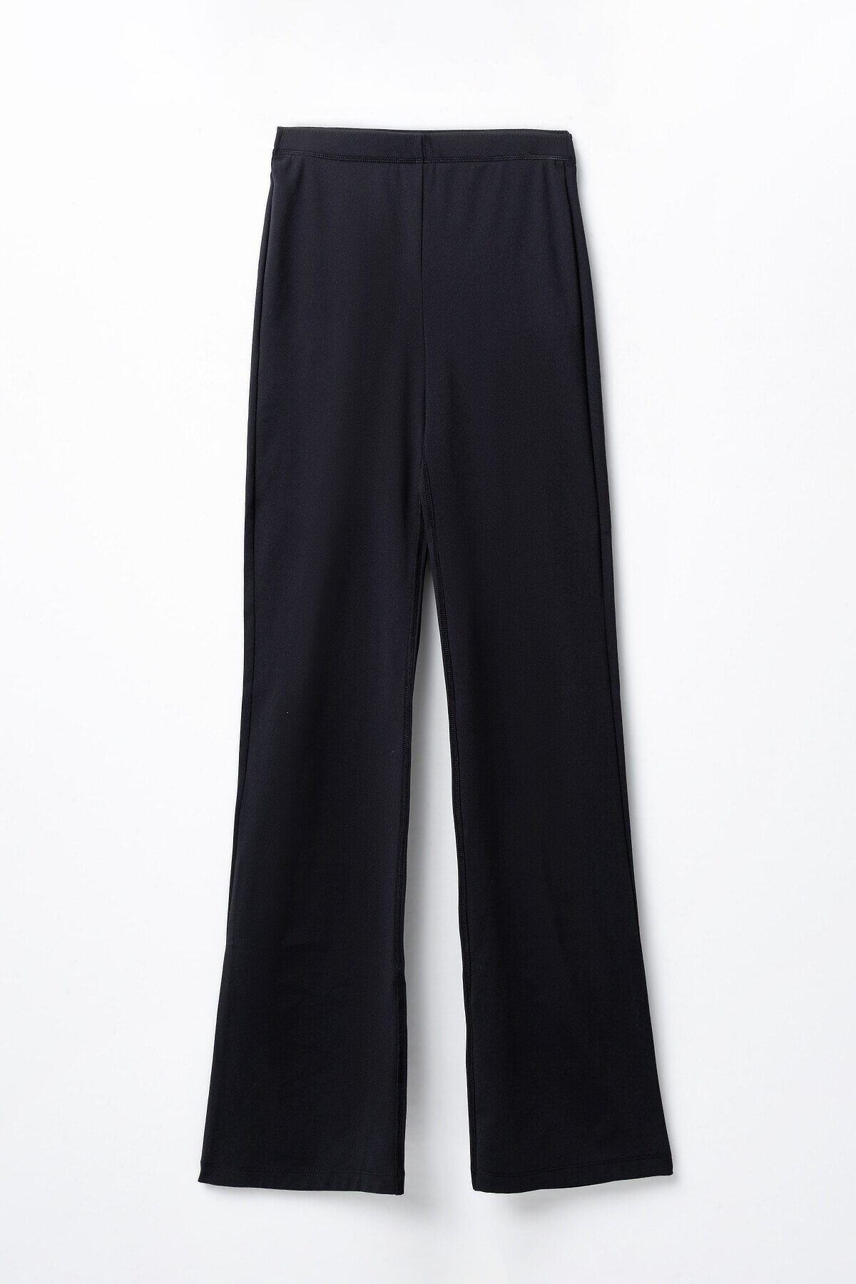 Брюки клеш плотно облегающие бедра до колен, с высокой линией талии. По талии отрезной пояс из основного полотна с эластичной тесьмой (30RV) внутри. Нижний срез обработан швом вподгибку на 2х игольной плоскошовной машине.