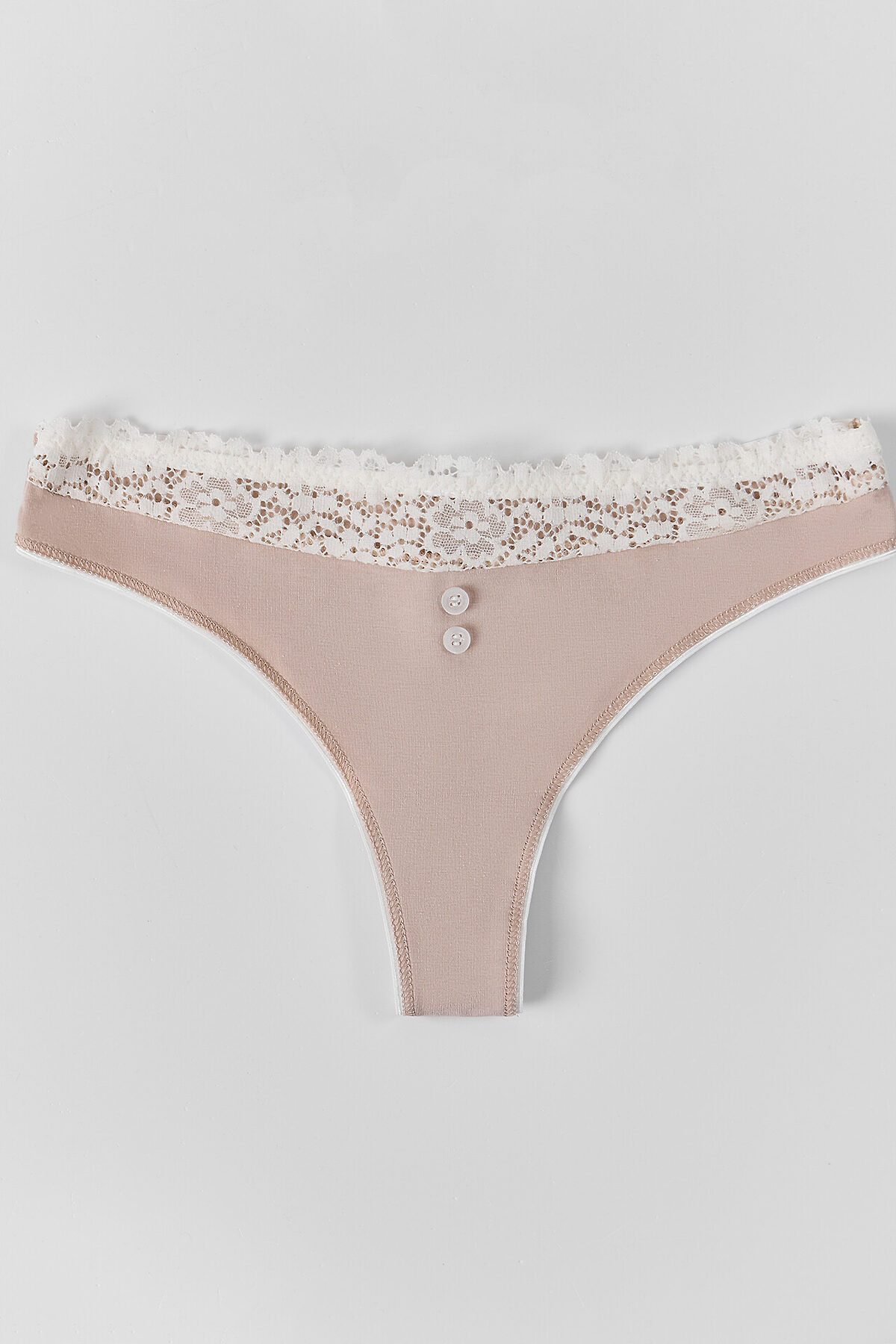 Трусы женские со средней посадкой, силуэт - бразилиана, выполнены из кулирного хлопкового полотна и эластичного кружева (арт. 4EG953, Femina, 85% полиамид; 15% эластан, 22,4 см, L138-22.4). Верхняя передняя деталь из эластичного кружева, нижняя деталь переда - из кулирного хлопкового полотна. Верхний и нижние срезы обработаны эластичной тесьмой 8 мм (с зубом KTE7-8, E7116 Arteks). Подкладка ластовицы из кулирного хлопкового полотна отлетная по переднему краю. По центру изделия спереди - По заданию 2 пуговицы (10-11мм)