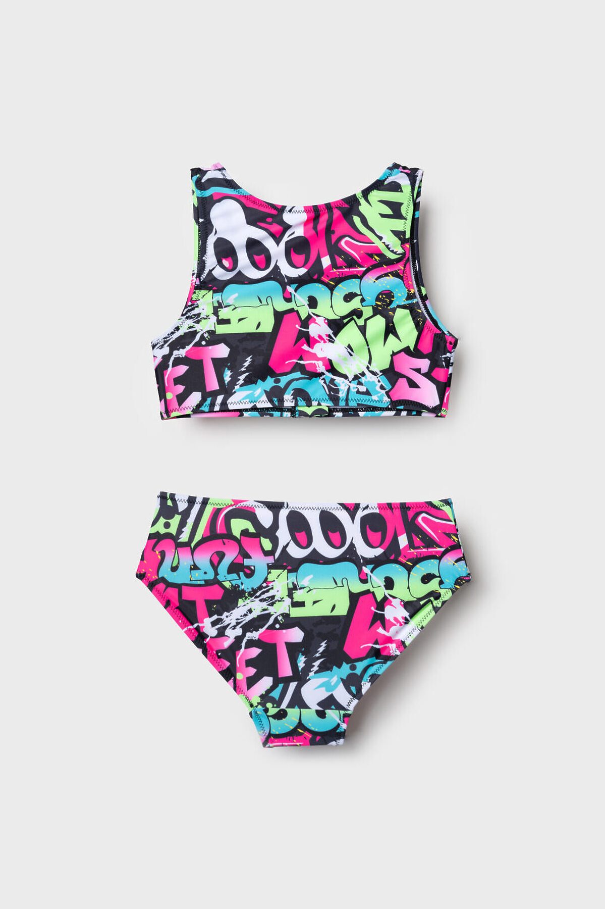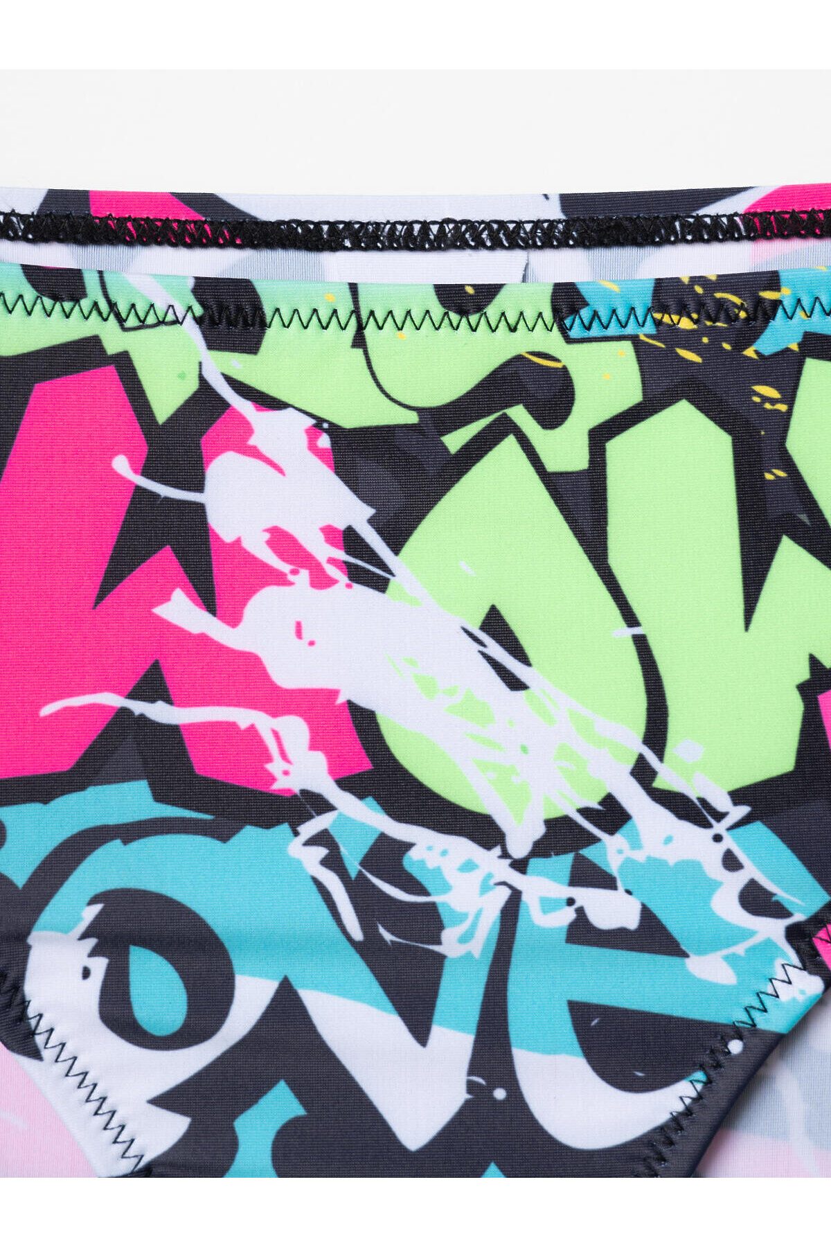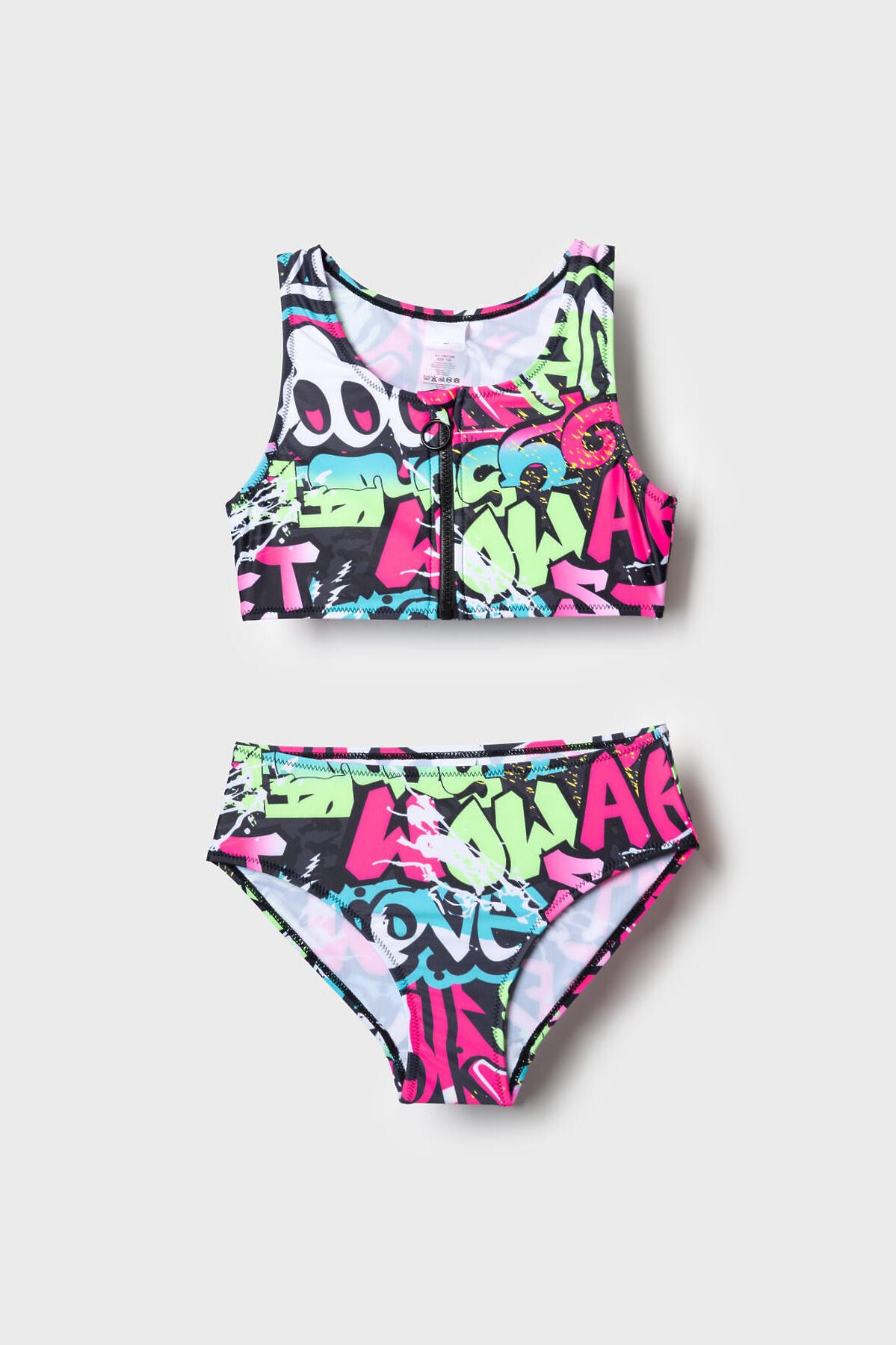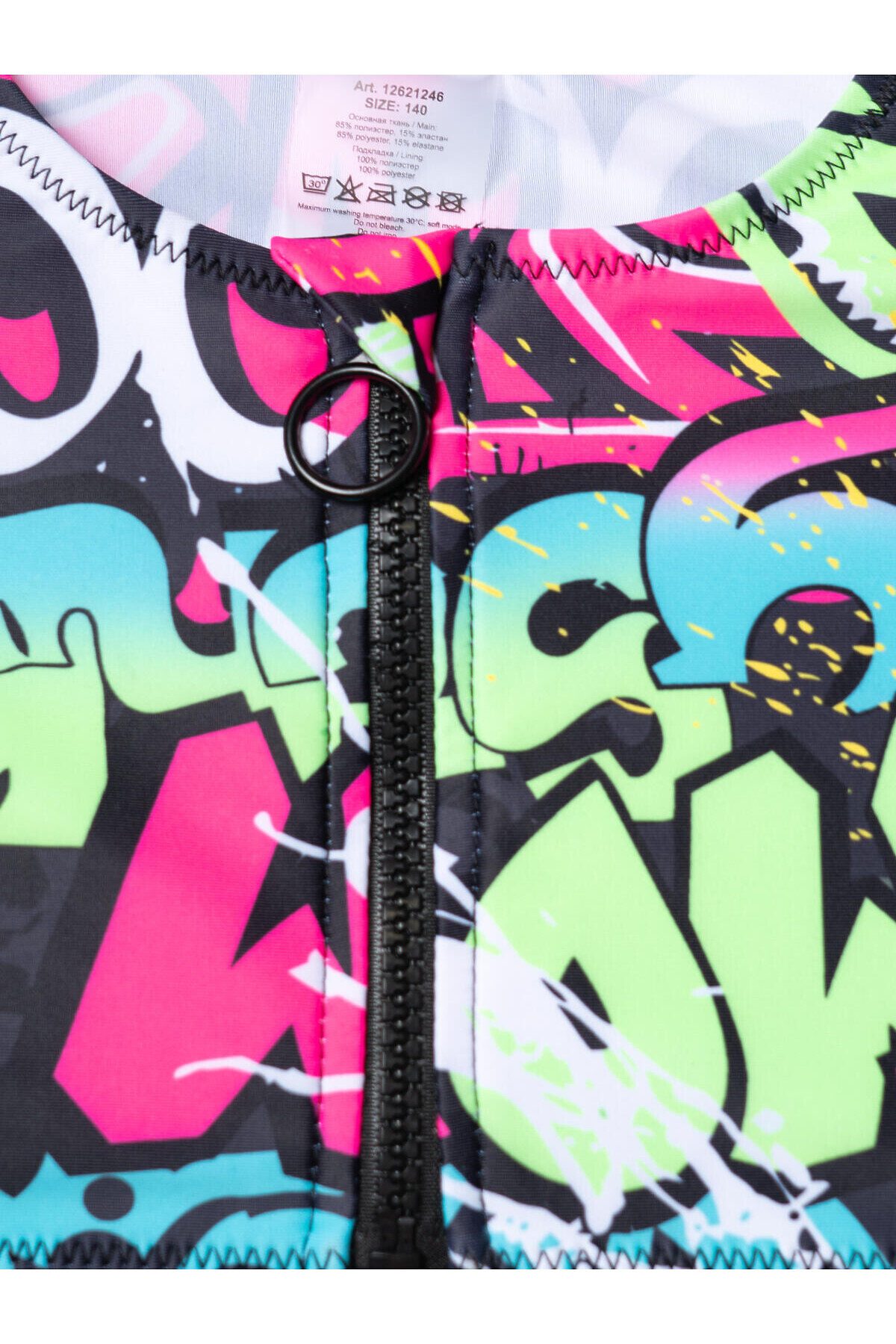 Купальник раздельный для девочки подростка. Верх выполнен в виде короткого топа с удобной застёжкой-молнией спереди, а плавки имеют классическую форму со средней посадкой. Основной акцент сделан на ярком принте в стиле уличного граффити с надписями и цветными брызгами в розовых, зелёных, голубых и чёрных тонах. Внутри предусмотрена подкладка и съемные чашки в зоне груди для дополнительного комфорта и уверенности, подкладка в зоне ластовицы. Эластичные края обеспечивают хорошую посадку и удобство при движении. Благодаря UF-защите, ткань сохраняет первоначальный вид даже при длительном пребывании на солнце. Подходит для плавания и активного отдыха.