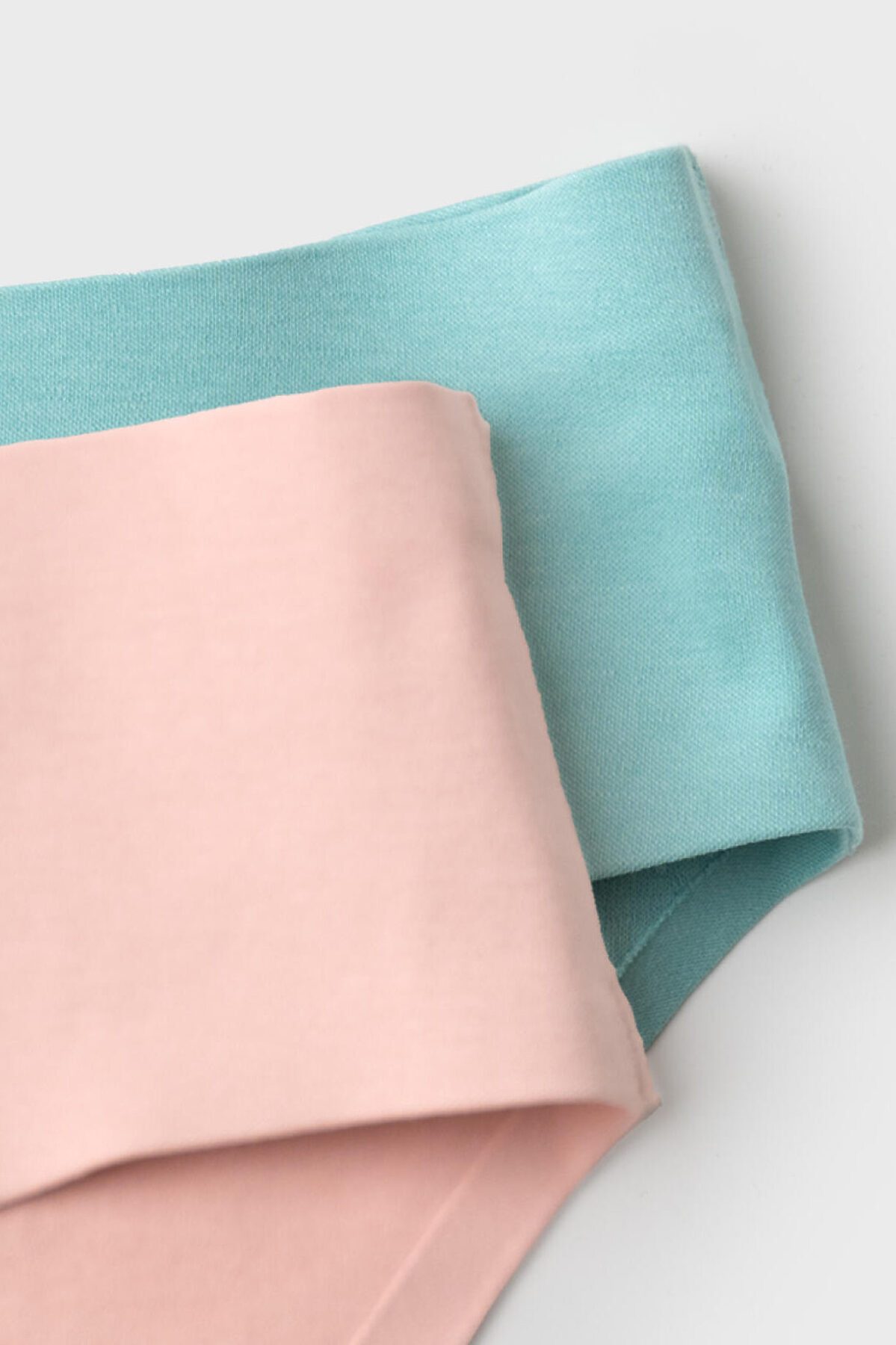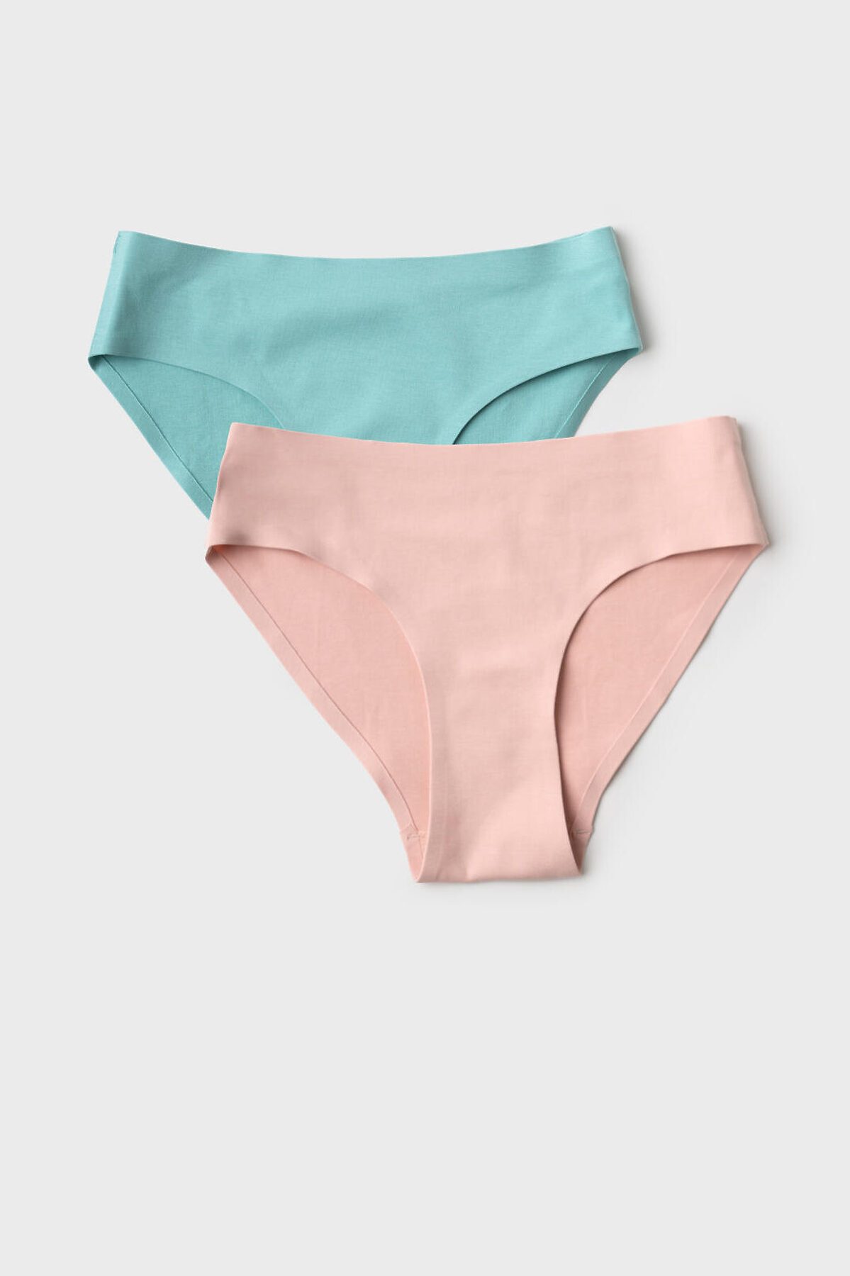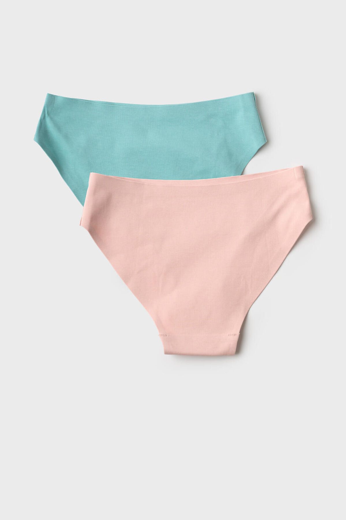 Набор из двух бесшовных трусов-брифов для девочки подростка. Одни трусы выполнены в мягком зелёно-сером цвете, другие — в светло-розовом. Модель имеет аккуратный крой, без резинок и выступающих швов. Ластовица приклеена изнутри и зафиксирована мягкими плоскими швами. Материал - хлопковой трикотаж.