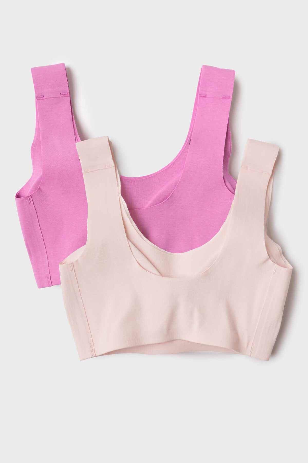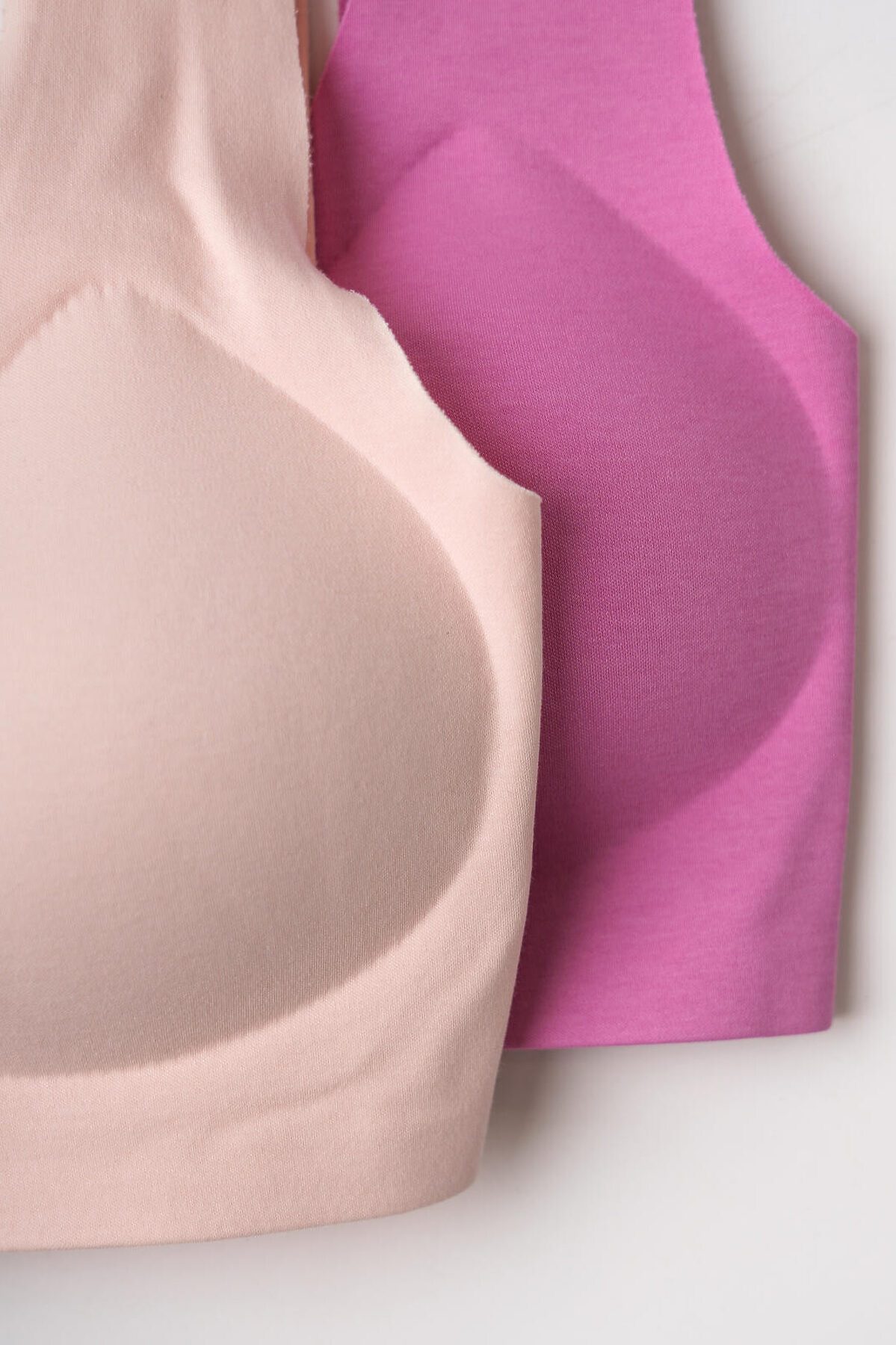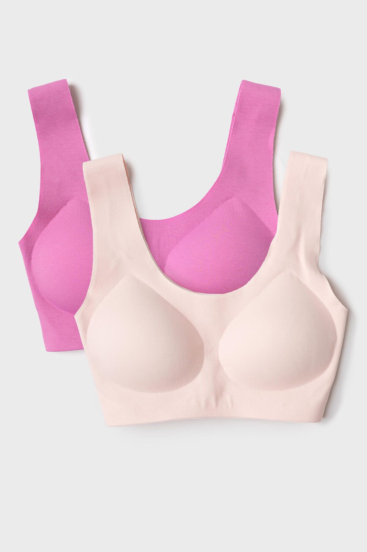 Набор два топа-бра без застежек для девочки подростка. Бесшовная технология. Изделие выполнено из эластичного трикотажа и имеет мягкие формованные чашечки для дополнительного комфорта. Внутри по низу предусмотрена эластичная тесьма для лучшего прилегания к телу.