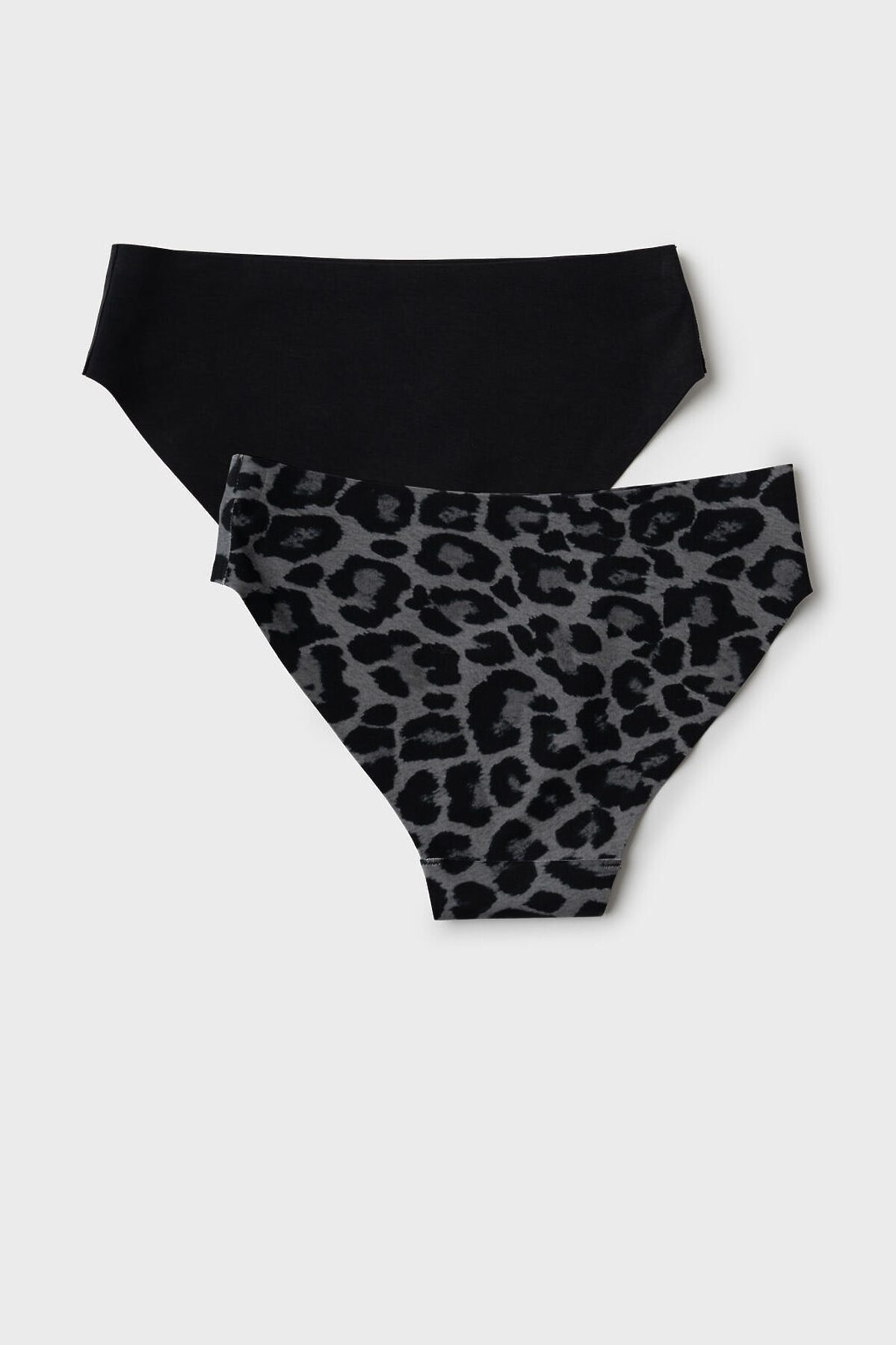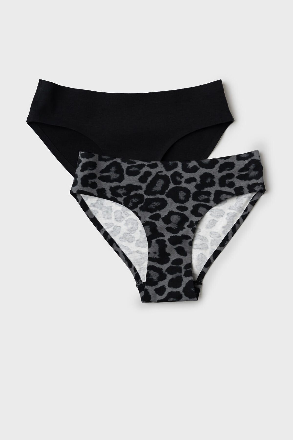 Набор из двух бесшовных трусов-брифов для девочки подростка. Одни трусы выполнены в черном, другие — в леопардовом. Модель имеет аккуратный крой, без резинок и выступающих швов. Ластовица приклеена изнутри и зафиксирована мягкими плоскими швами. Материал - хлопковой трикотаж.