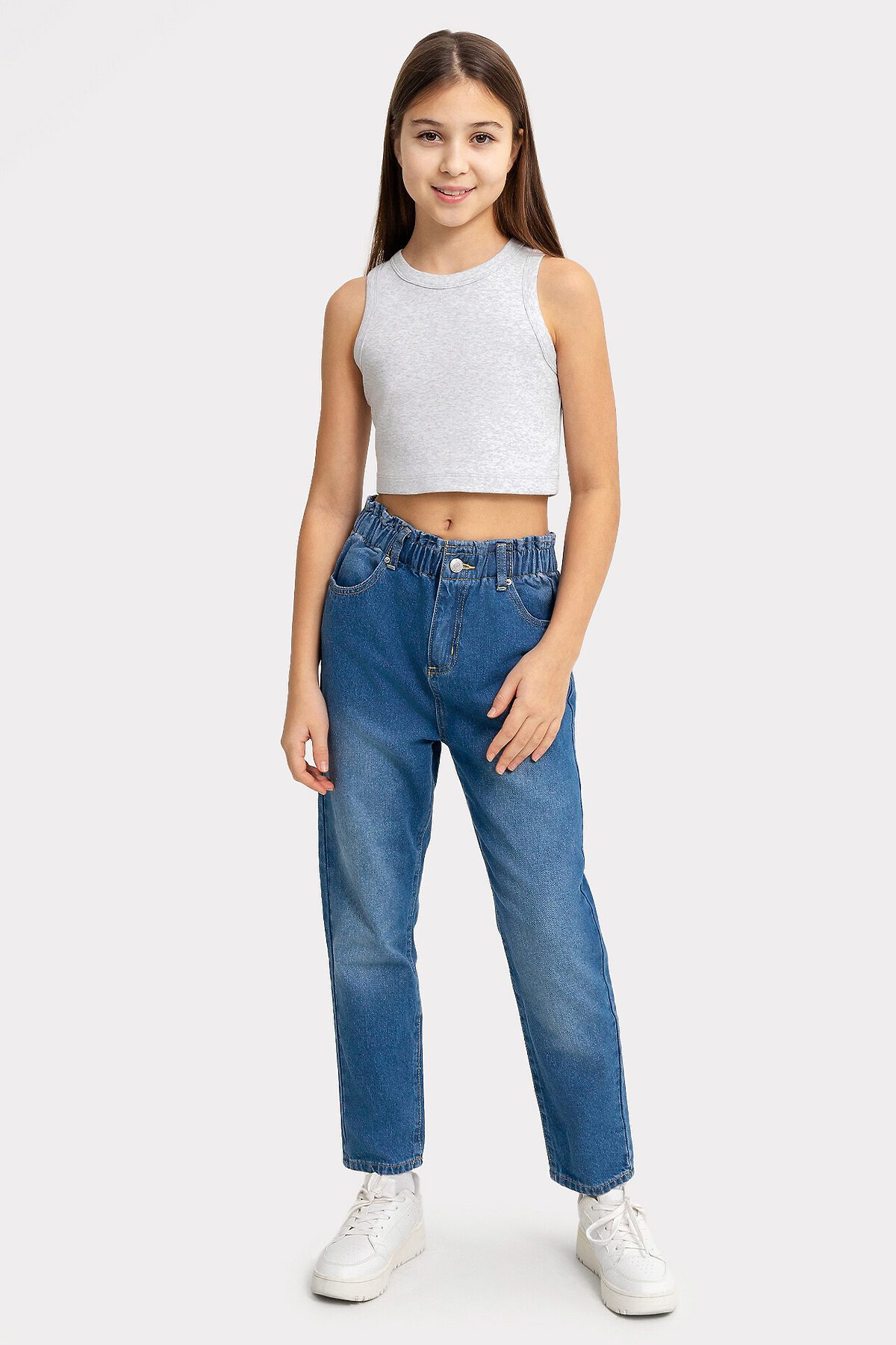 Топ для девочек прилегающего силуэта. Горловина круглая. Проймы и горловина окантованы бейкой из основного полотна. Низ изделия обработан швом в подгибку.