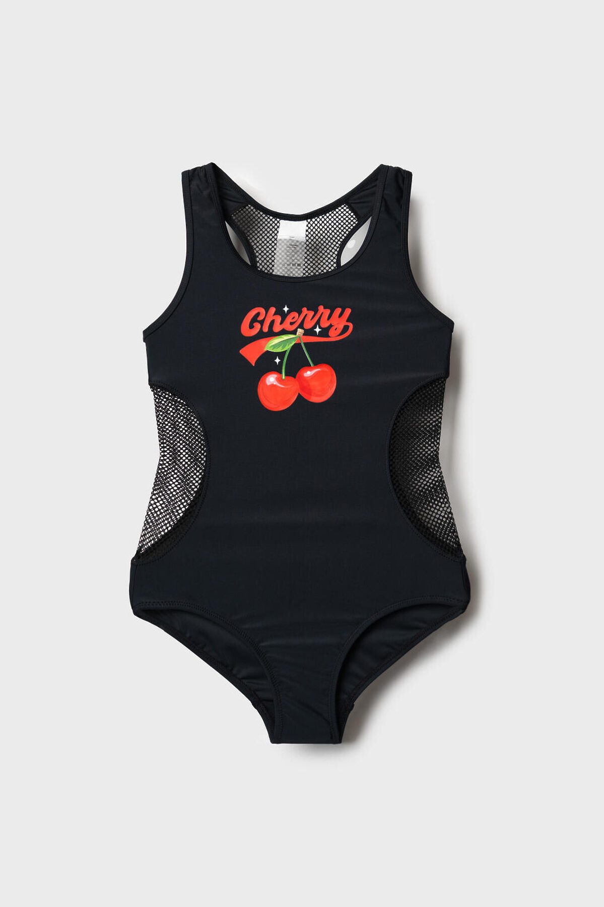 Слитный купальник для девочки подростка. Купальник черного цвета с ярким принтом вишен. На спинке и по бокам — фигурный вырез и вставки из дышащей сетки. Внутри - подкладка. Все края обработаны эластичной резинкой для удобной посадки. Благодаря UF-защите, ткань сохраняет первоначальный вид даже при длительном пребывании на солнце. Купальник подойдет для активного отдыха и плавания.