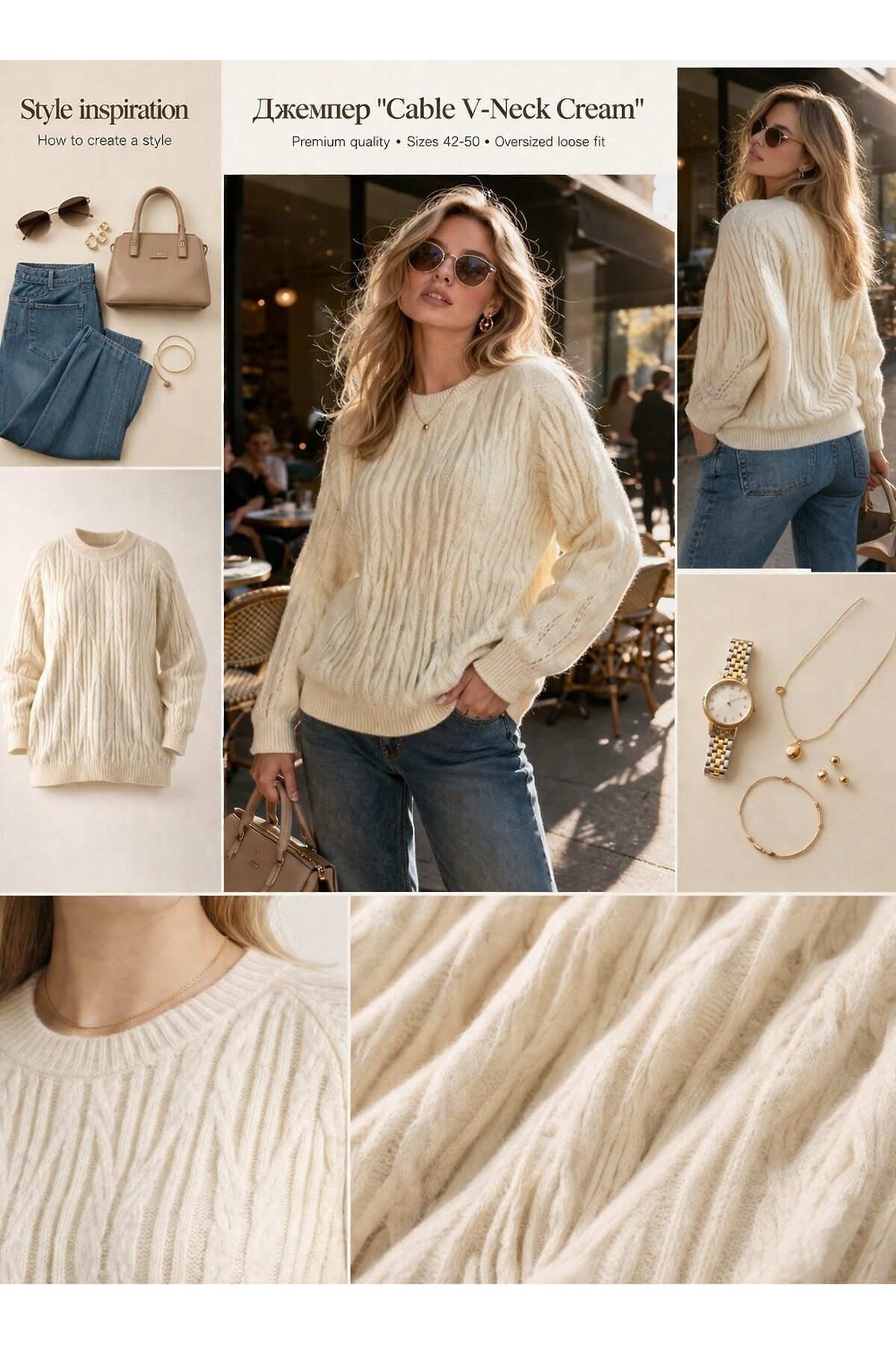 Представляем стильный вязаный джемпер оверсайз с роскошным узором из кос идеальное сочетание комфорта, качества и актуального дизайна. Эта модель выполнена из современного качественного акрила который превосходит многие натуральные материалы по своим эксплуатационным характеристикам это инновационная высококачественная пряжа, разработанная специально для создания комфортной одежды. Материал обладает исключительной мягкостью, шелковистой текстурой и приятными тактильными ощущениями. Волокно гипоаллергенно, не колется, не вызывает раздражения даже на самой чувствительной коже. Акрил превосходно сохраняет тепло, позволяя коже дышать, что обеспечивает комфорт в течение всего дня носки. Волокно не деформируется, не скатывается, не теряет форму и цвет после многочисленных стирок. Материал прост в уходе и не требует специальных условий. Дизайн: Джемпер украшен объемным фактурным узором из кос по всей поверхности изделия это классический элемент вязаной моды, создающий элегантный рельеф и визуальный объем. V-образный вырез горловины добавляет образу женственности и изящества, визуально удлиняя шею и создавая flattering силуэт. Рукава выполнены в том же стиле с узором из кос, что создает гармоничный целостный образ. Манжеты и нижняя кромка отделаны эластичной резинкой для идеальной посадки и комфорта. Крой: Свободный оверсайз крой создает расслабленный, непринужденный образ. Спущенная линия плеча и объемные рукава придают модели современный вид. Такой силуэт прекрасно скрывает любые несовершенства фигуры, подходит для разных типов телосложения. Размер: Единый размер 42-50 универсальное решение для разных параметров. Цвет: Молочный нежный теплый оттенок, создающий ощущение уюта и элегантности. Применение: Идеальный выбор для повседневной носки, прогулок, работы, встреч с друзьями. Сочетается с джинсами, леггинсами, юбками. Создавайте образы в стилях casual, cozy chic, скандинавский минимализм!