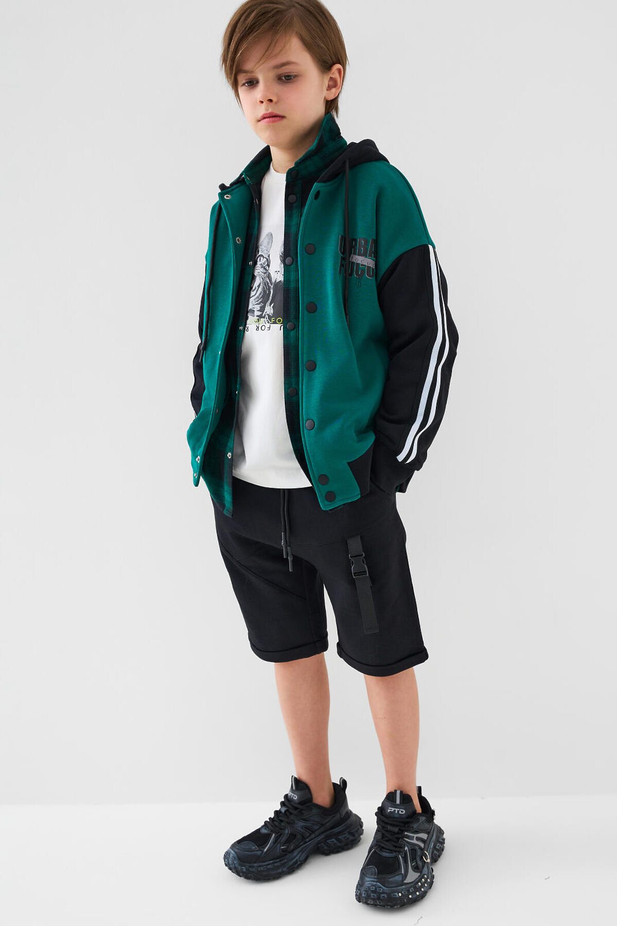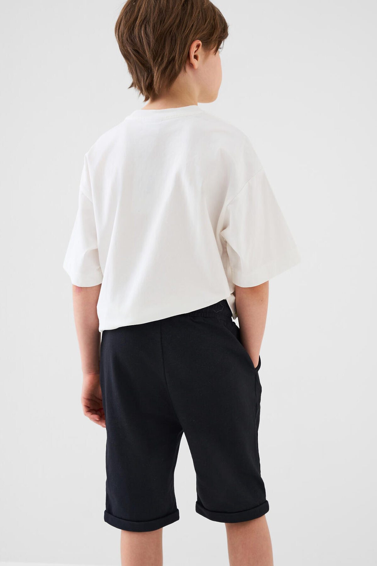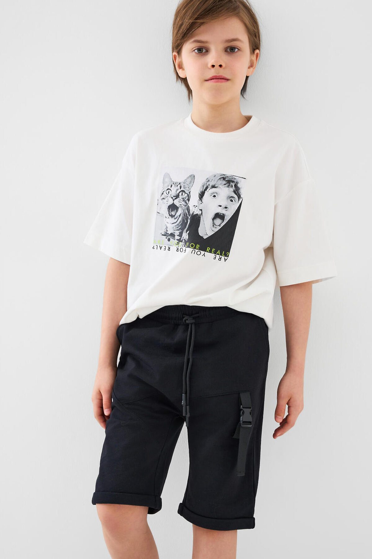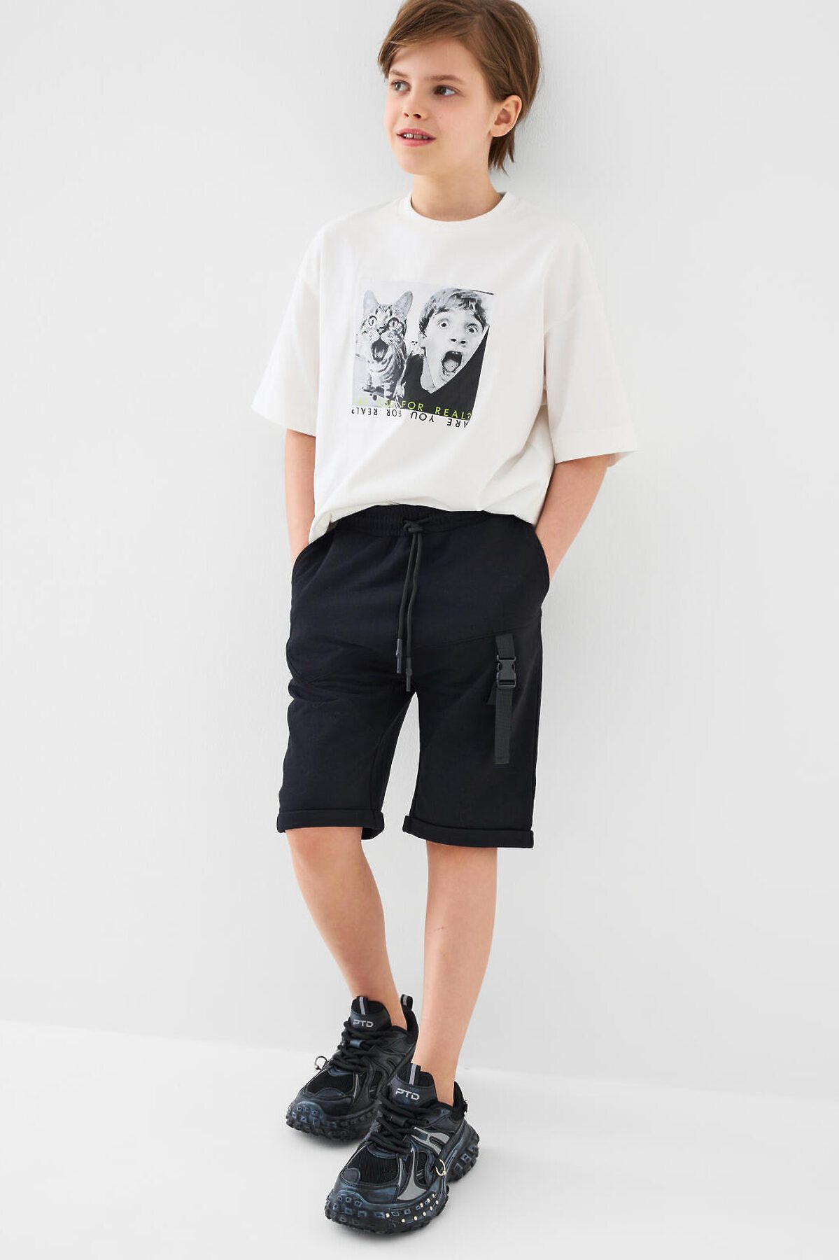 Шорты для мальчика подростка. Модель свободного кроя из мягкого, хлопкового трикотажа футер. Удобная посадка обеспечивается эластичным поясом со шнуром. Спереди — диагональный декоративный шов, боковые карманы и стильная лента с пряжкой на правой штанине.