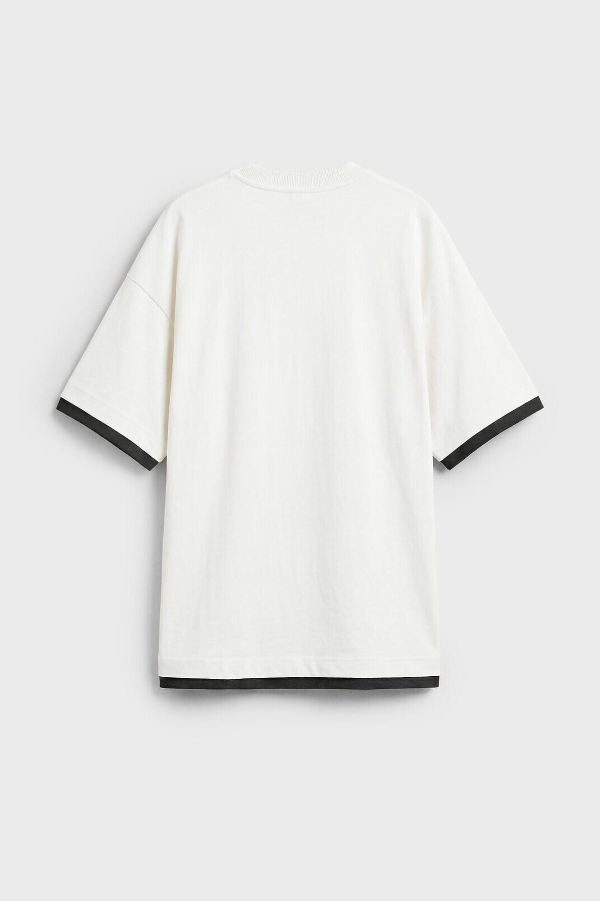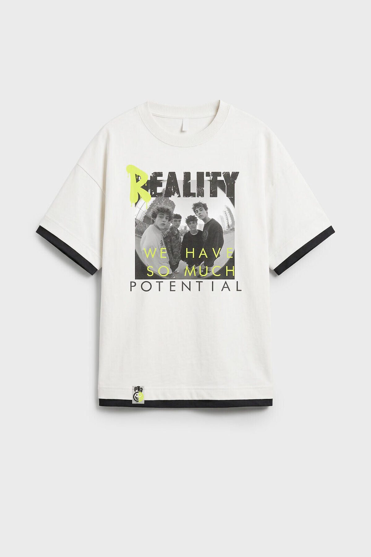 Футболка оверсайз для мальчика подростка. Модель выполнена из эластичного хлопкового трикотажа джерси. На груди расположен крупный принт. Горловина круглая, обработана эластичным рибом. В нижней части — небольшая нашивка.