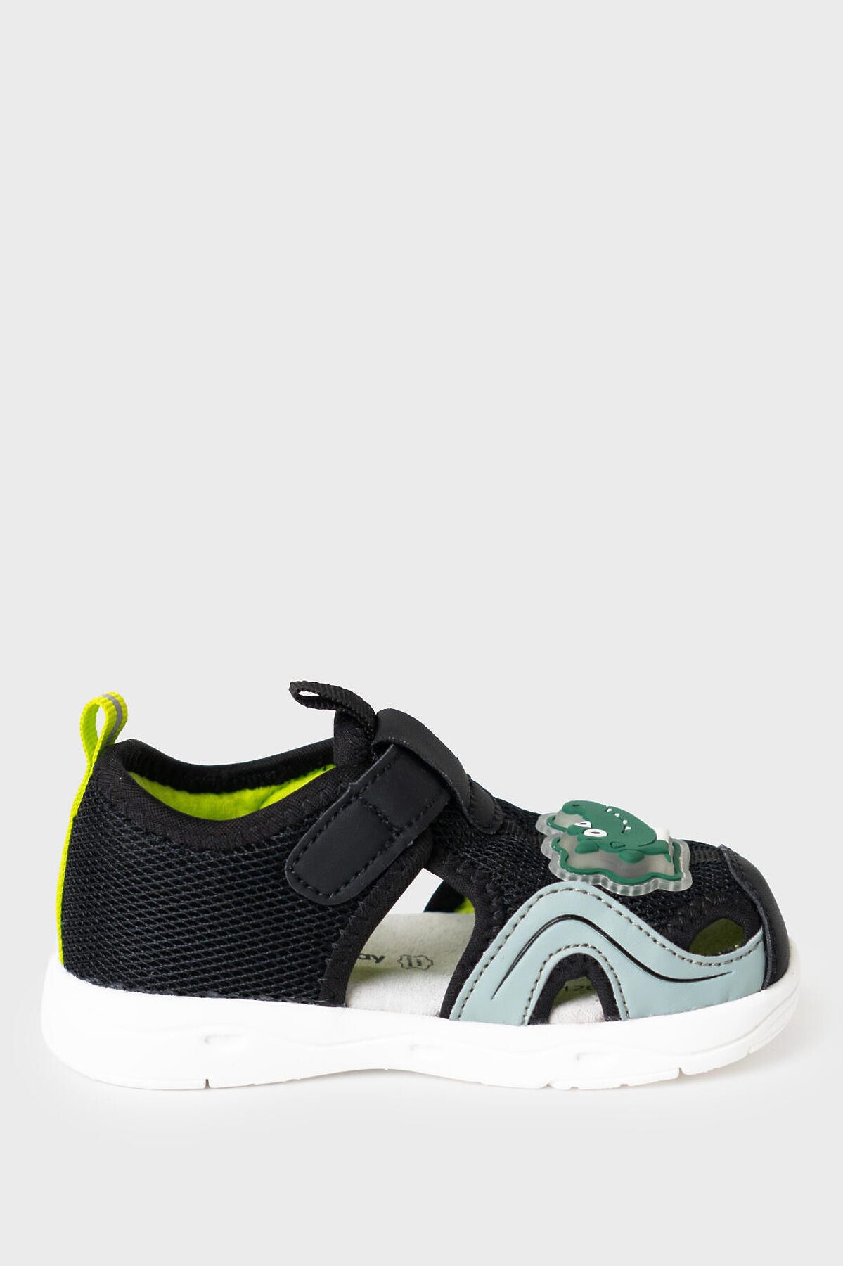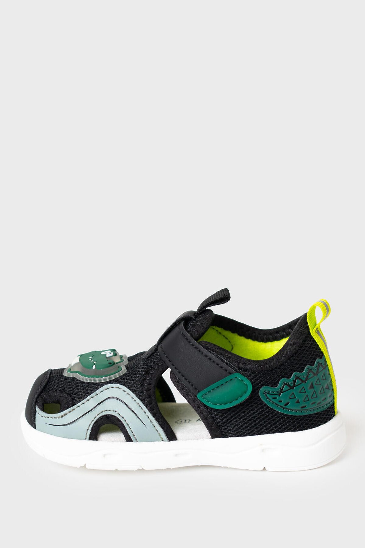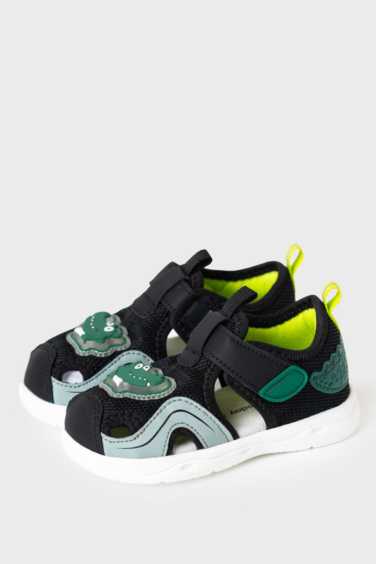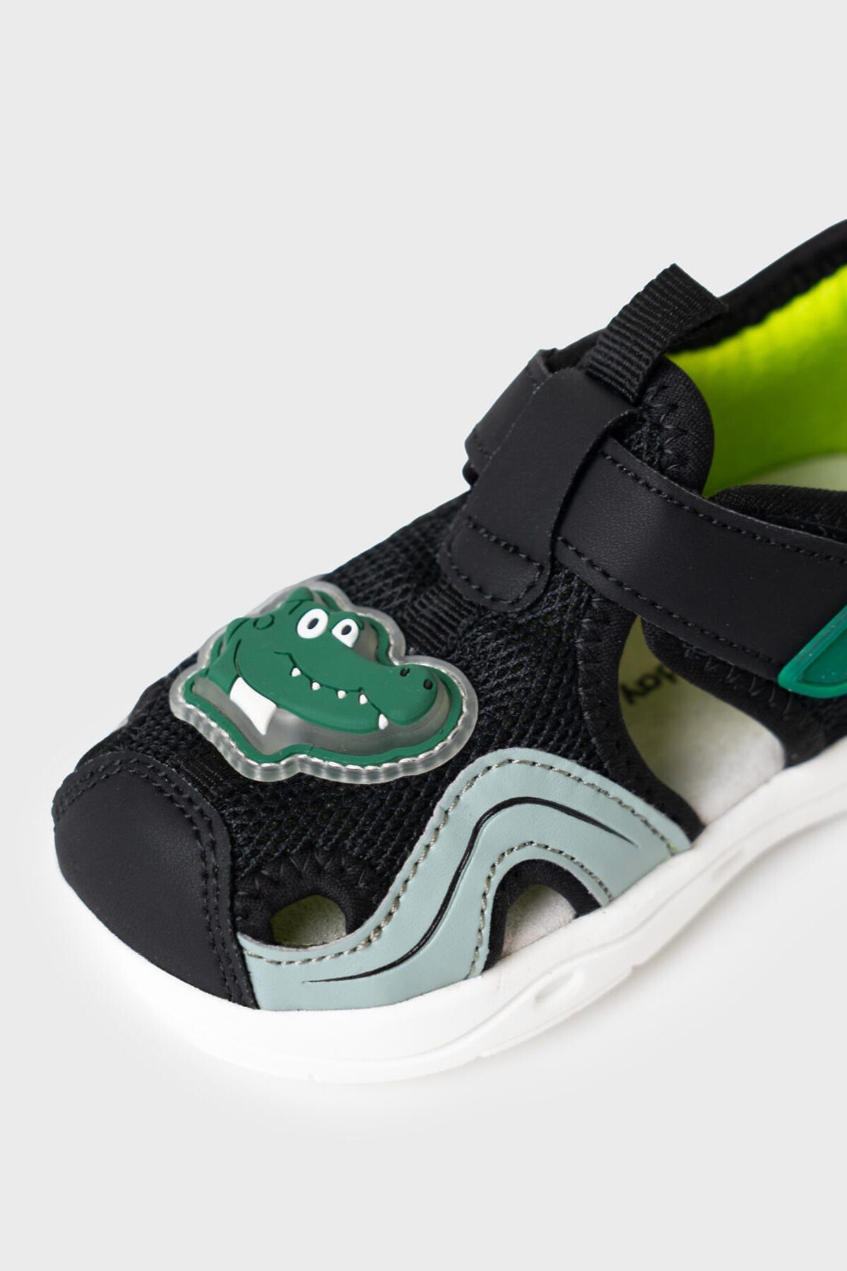 Детские сандалии для мальчика. Сандалии с закрытой пяточной и носочной частью. Сандалии выполнены из дышащего текстиля и дополнительно усилены искусственной кожей в носочной части. Удобная липучка позволяет регулировать обувь на любой подъем и обуваться ребенку самостоятельно. В обуви стоит текстильная 100% хлопковая подкладка, которая обладает высокой гигроскопичностью. Стелька выполнена из свиной натуральной кожи. Модель декорирована патчем в виде веселого крокодильчика с LED подсветкой. Подошва из ЭВА очень легкая и гибкая.