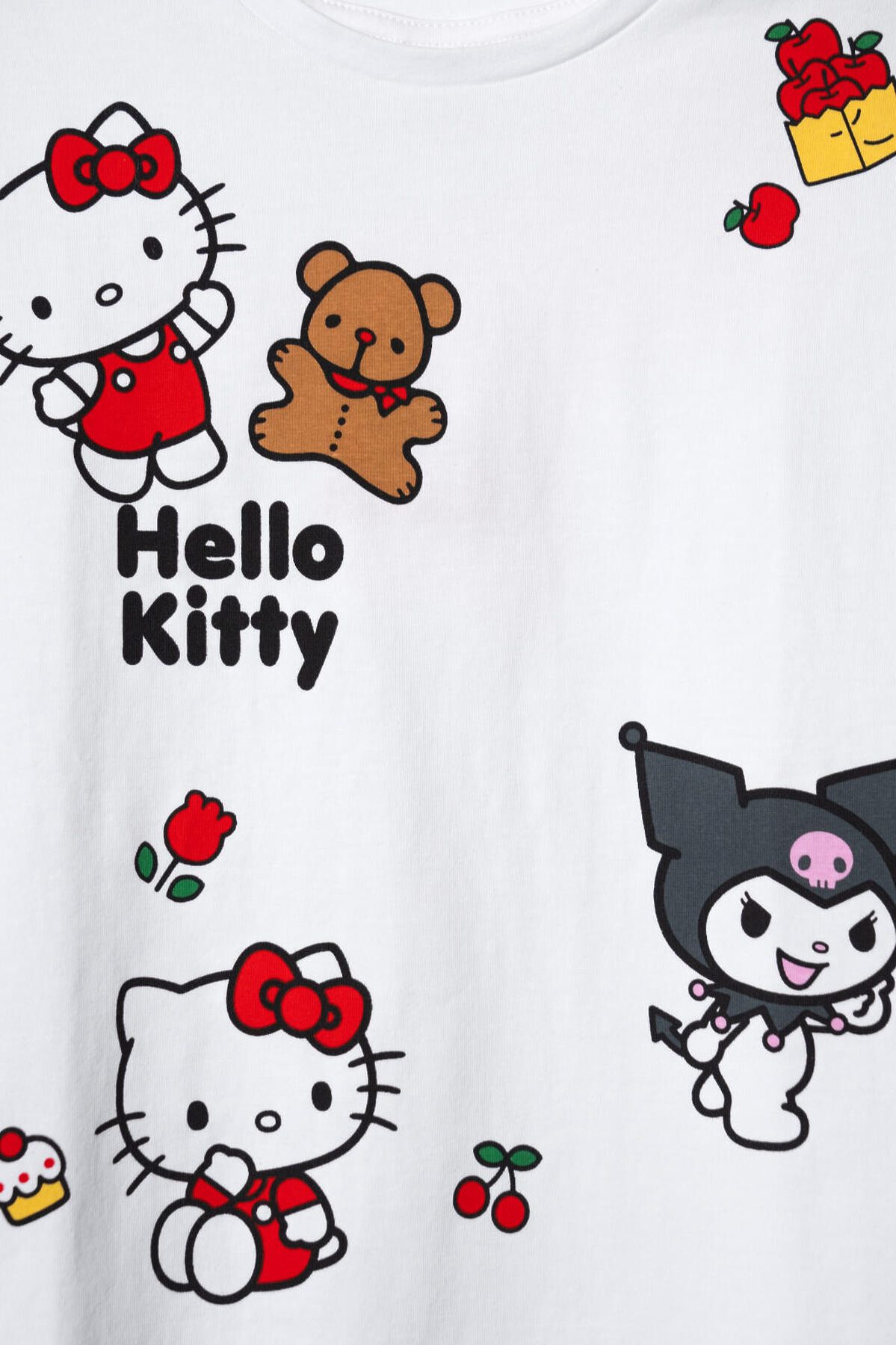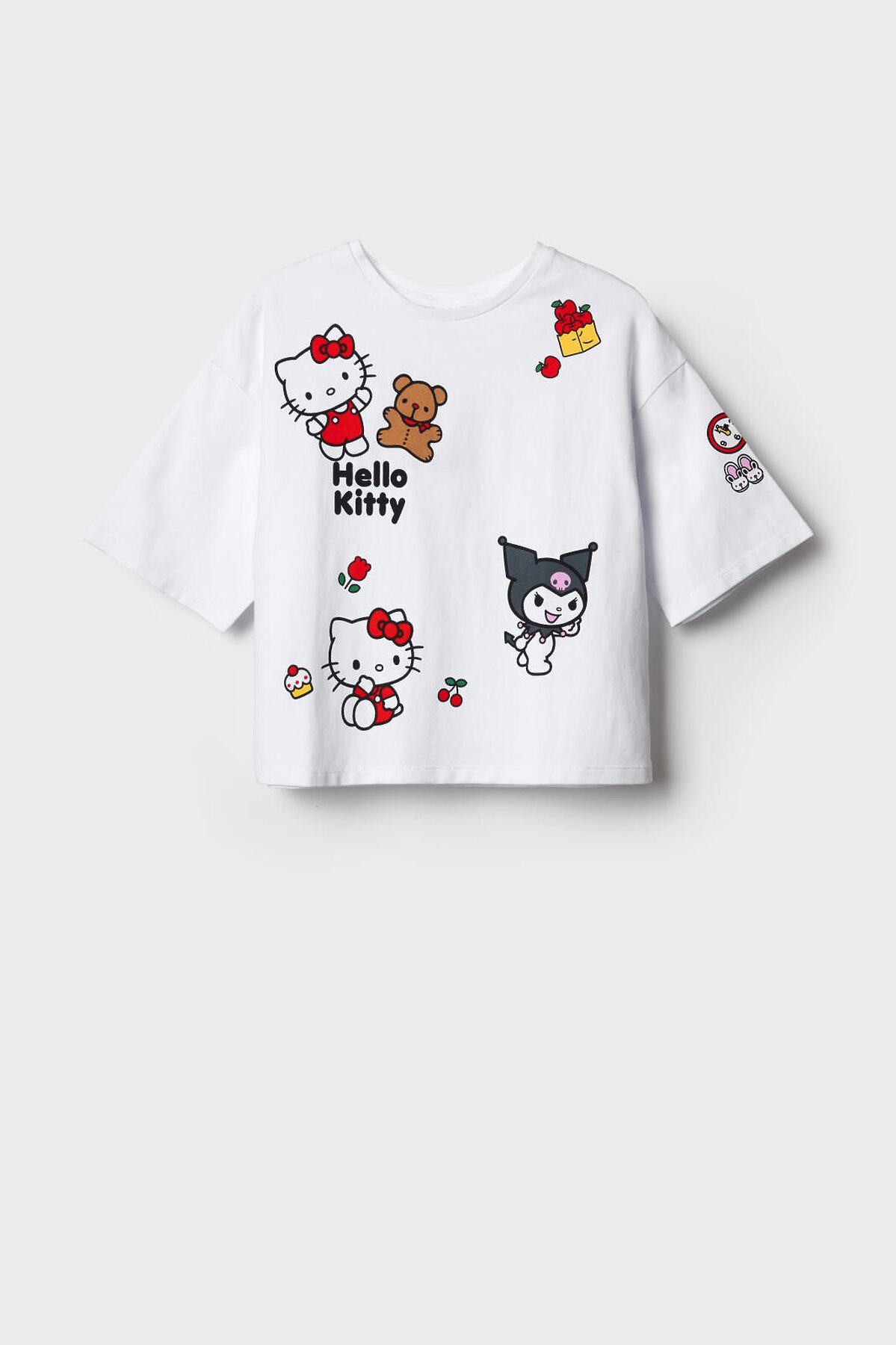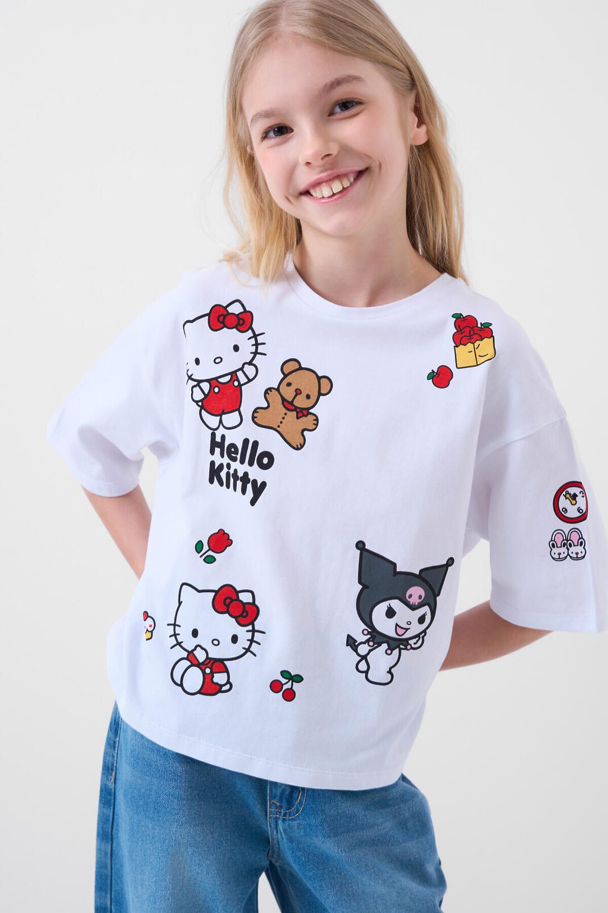 Футболка оверсайз для девочки подростка. Модель выполнена из эластичного хлопкового трикотажа джерси. Яркие принты с любимыми персонажами Хеллоу Китти. Горловина круглая.